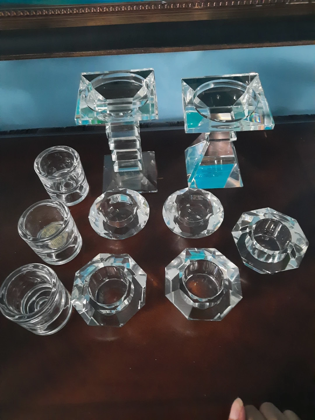 A beautiful set of nine crystal candle holders. Includes two taller, decorative holders and seven smaller votive holders. They're made of clear, sparkling glass. Message for individual prices.