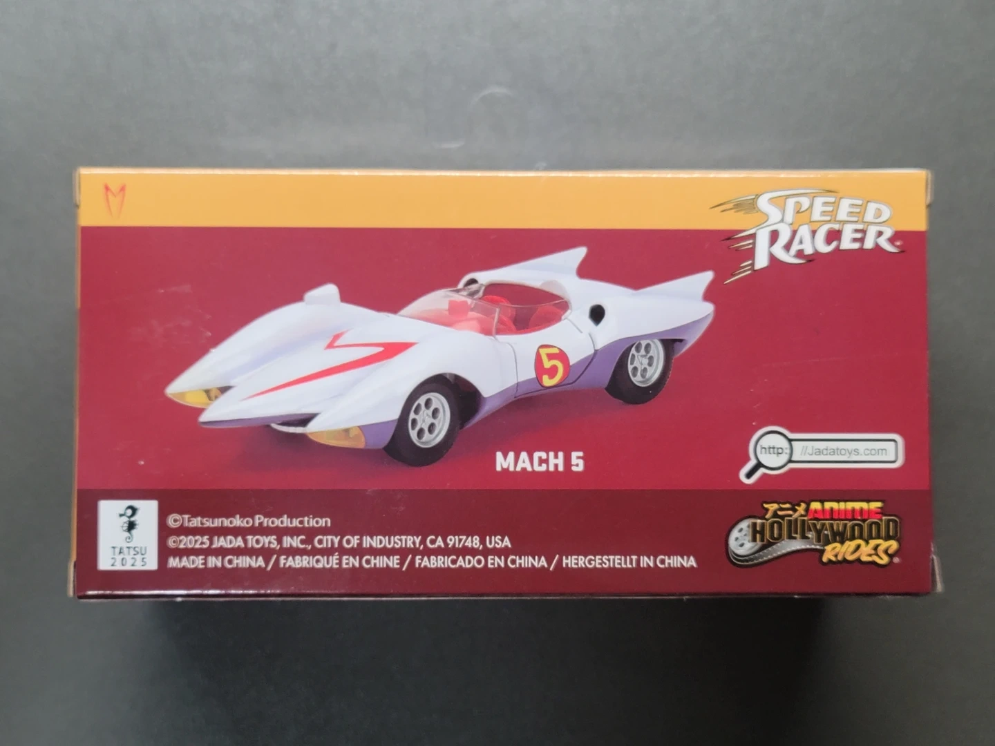 This is a Jada Toys Speed Racer Mach 5 die-cast toy car. It's recommended for ages 8 and up. The car is white with purple accents and the number 5 on the side.