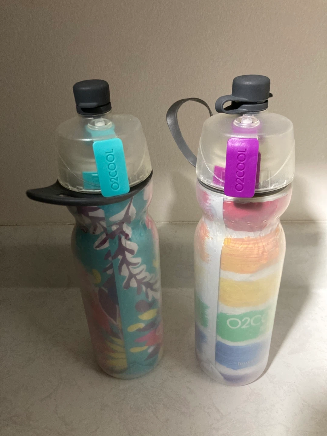 two O2COOL insulated misting water bottles. One has a floral design and the other has a rainbow design. Great for staying cool on the go!