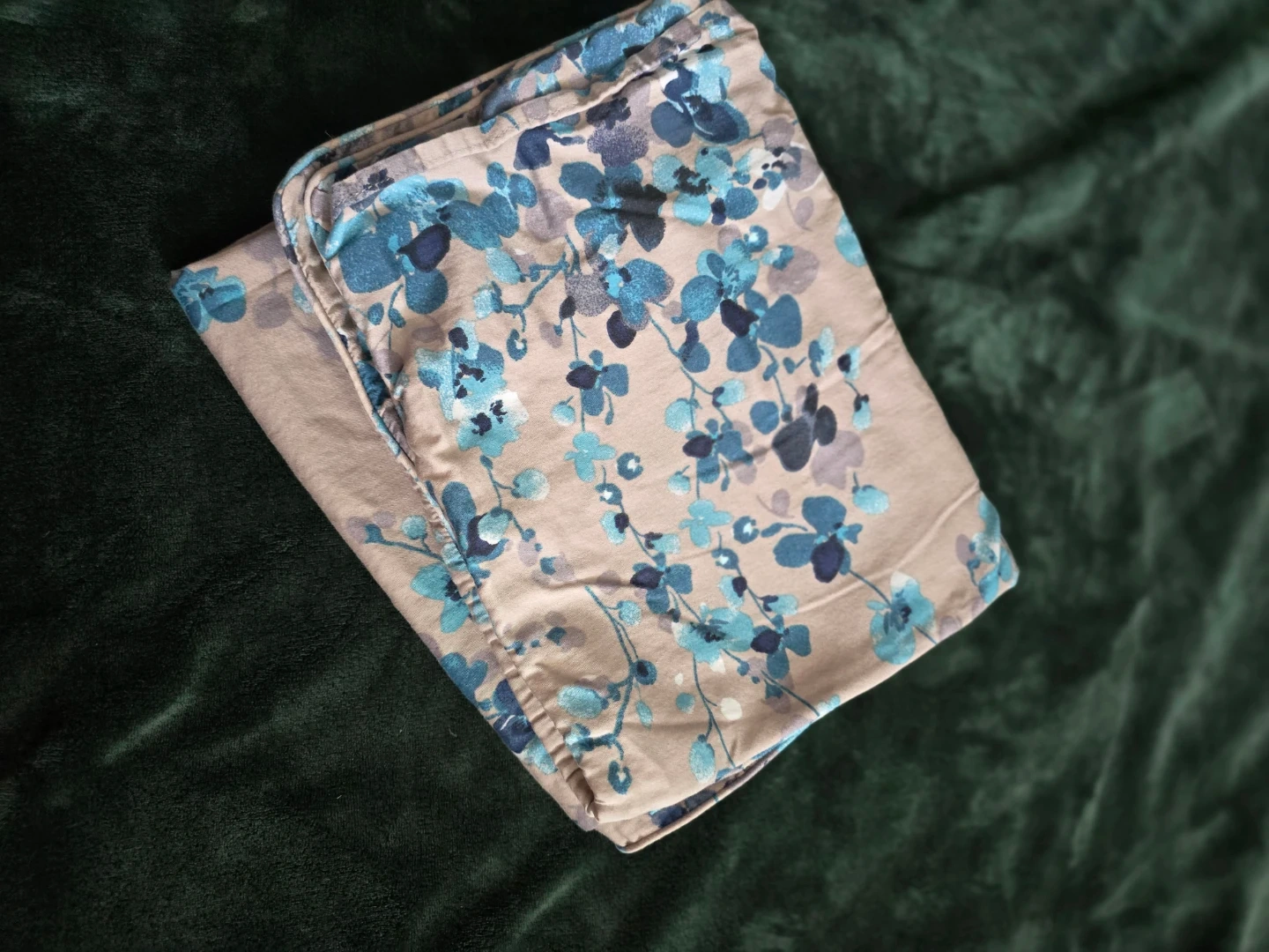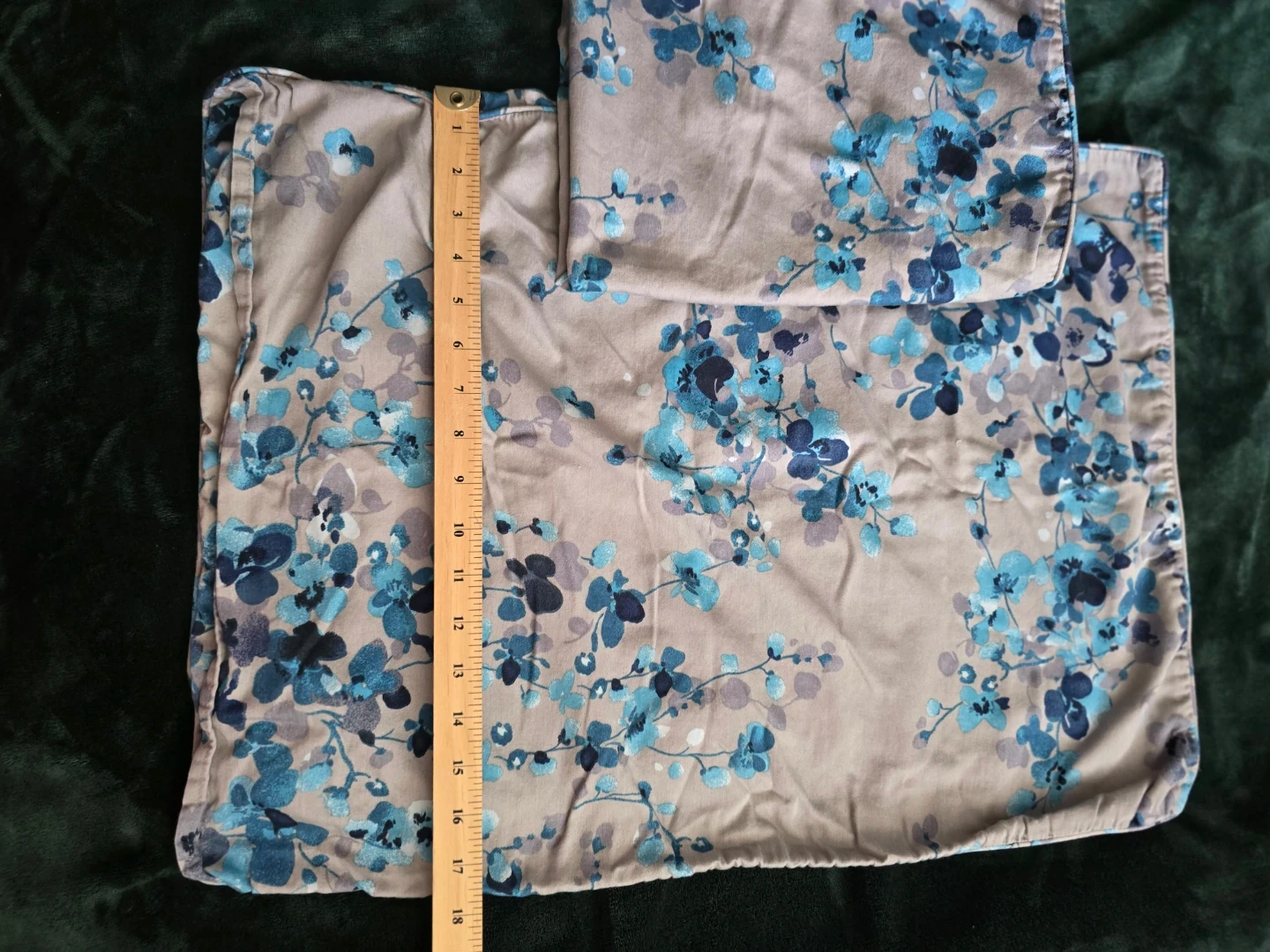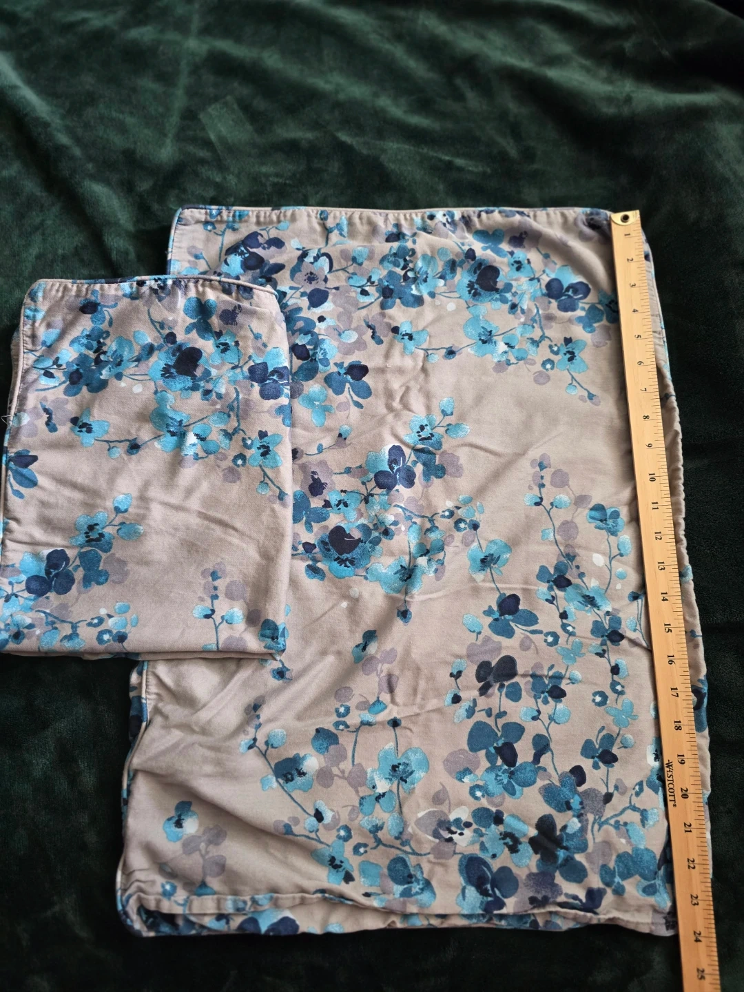 Set of two pillowcases featuring a blue and grey floral pattern. One pillowcase measures approximately 20 inches by 28 inches. The other pillowcase measures approximately 16 inches by 22 inches. Cotton material.