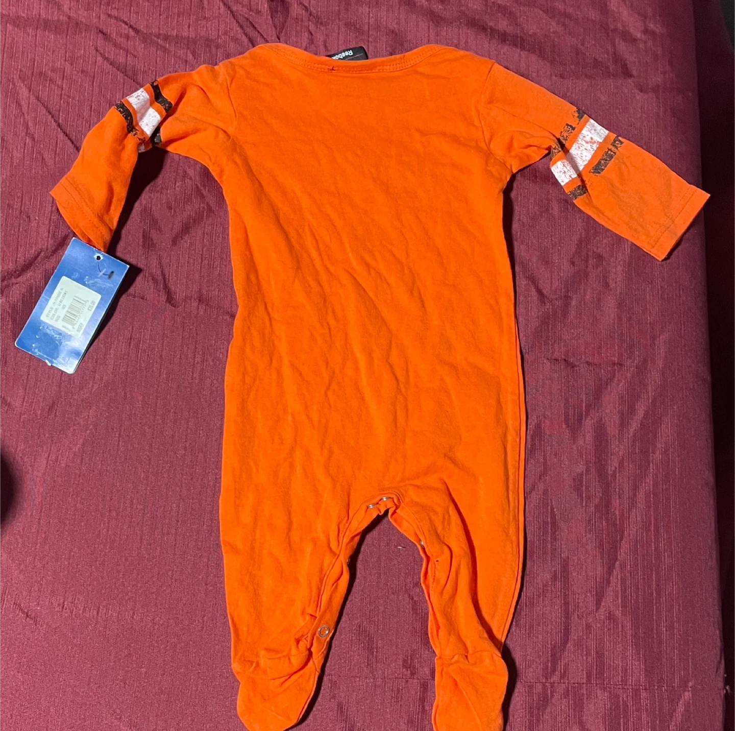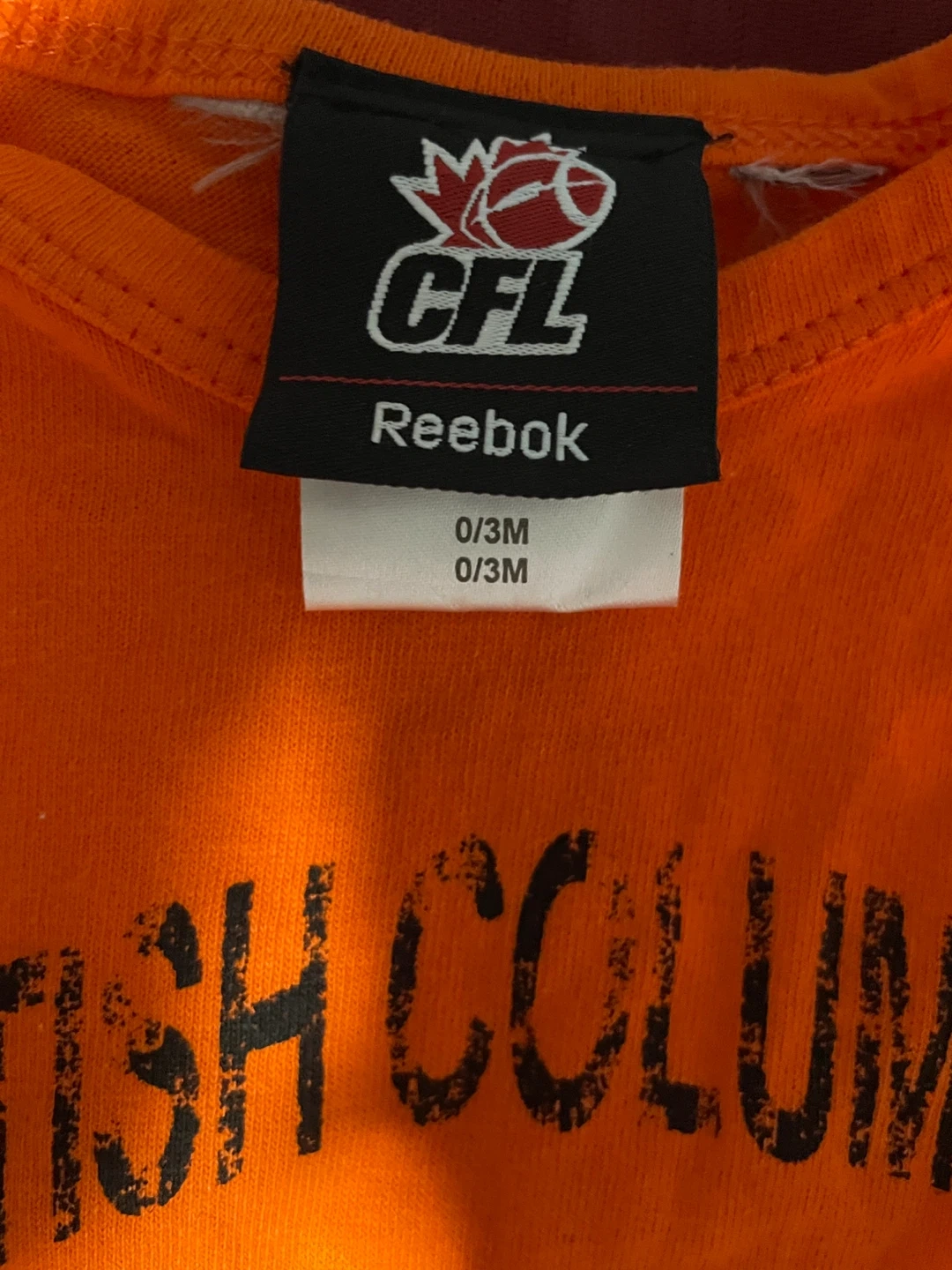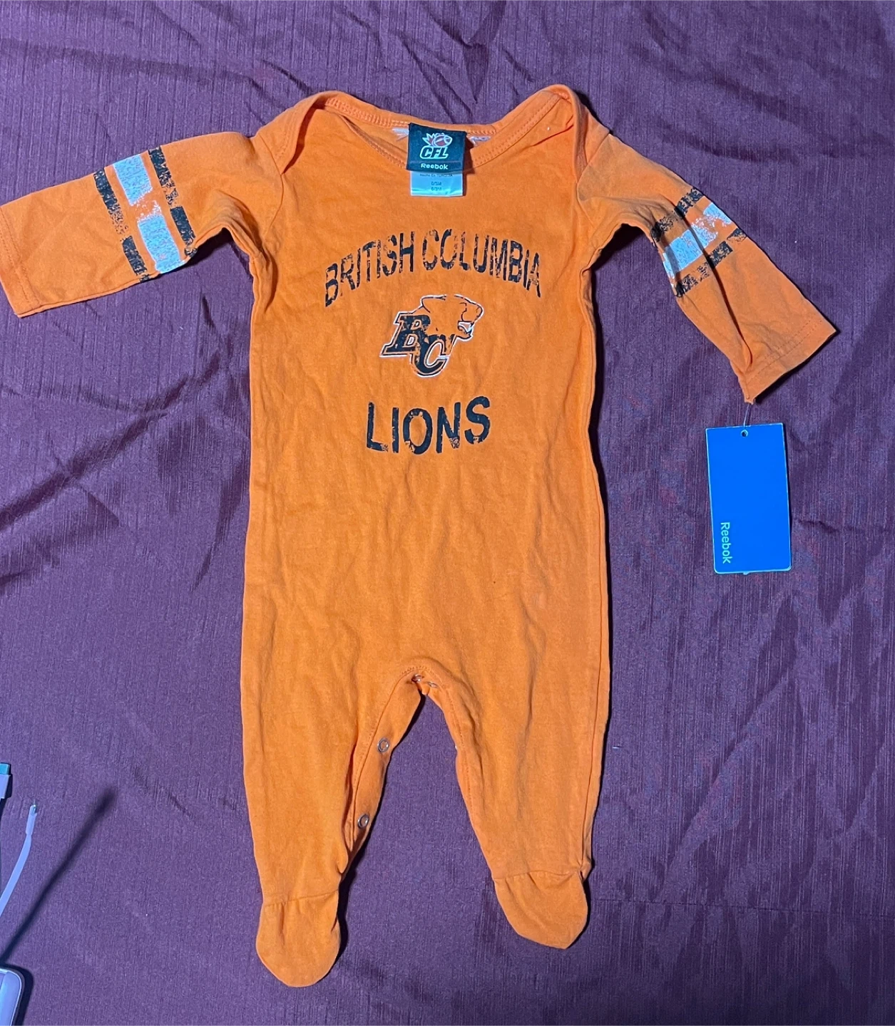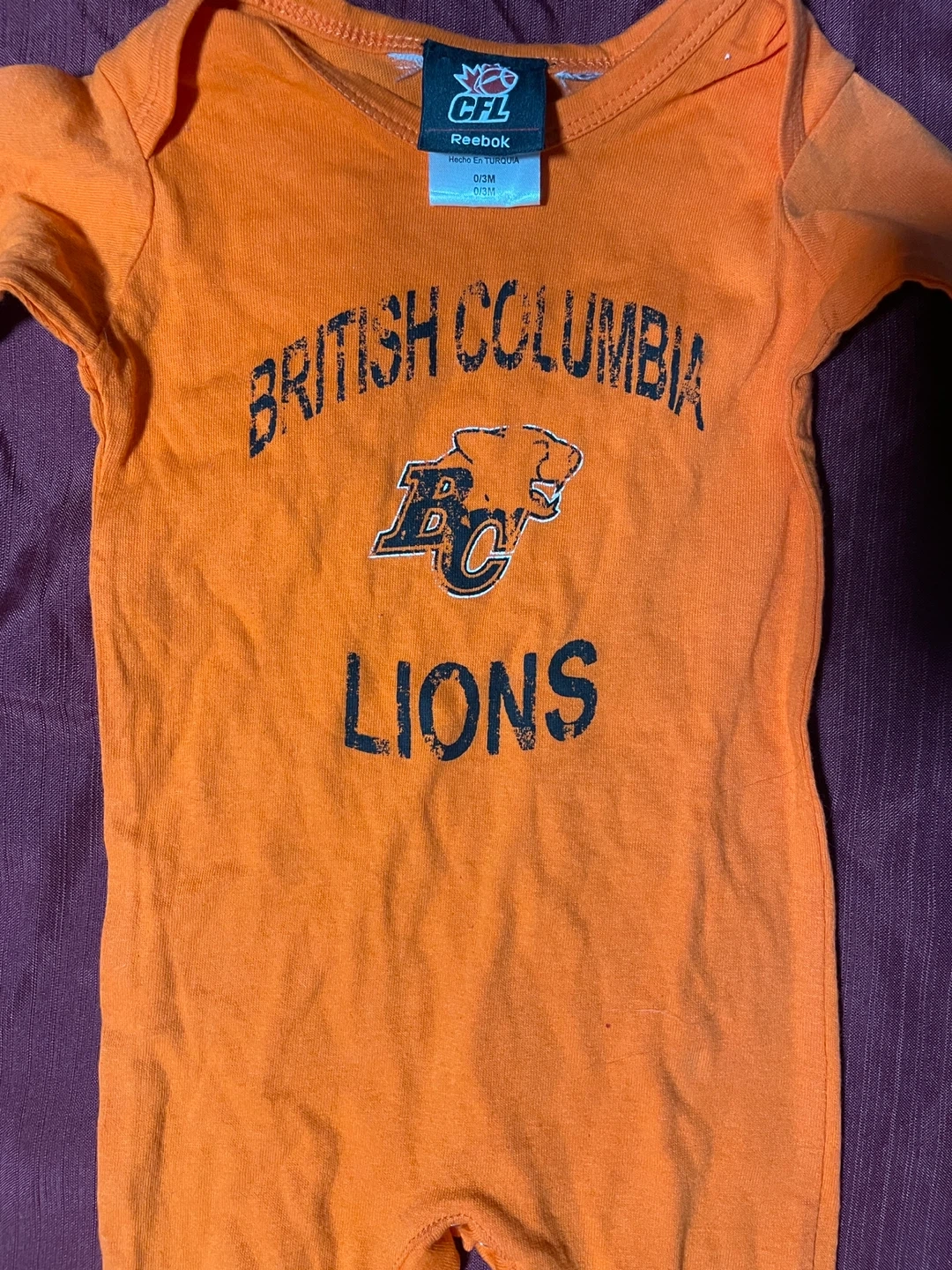 Orange baby onesie with "British Columbia Lions" graphics. Includes CFL and Reebok branding. Size is 0/3M.