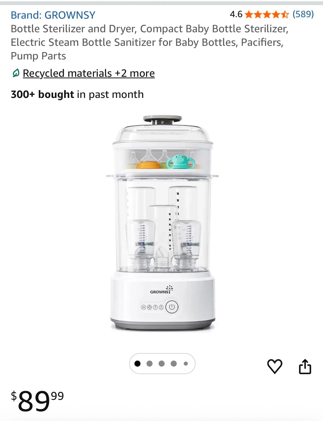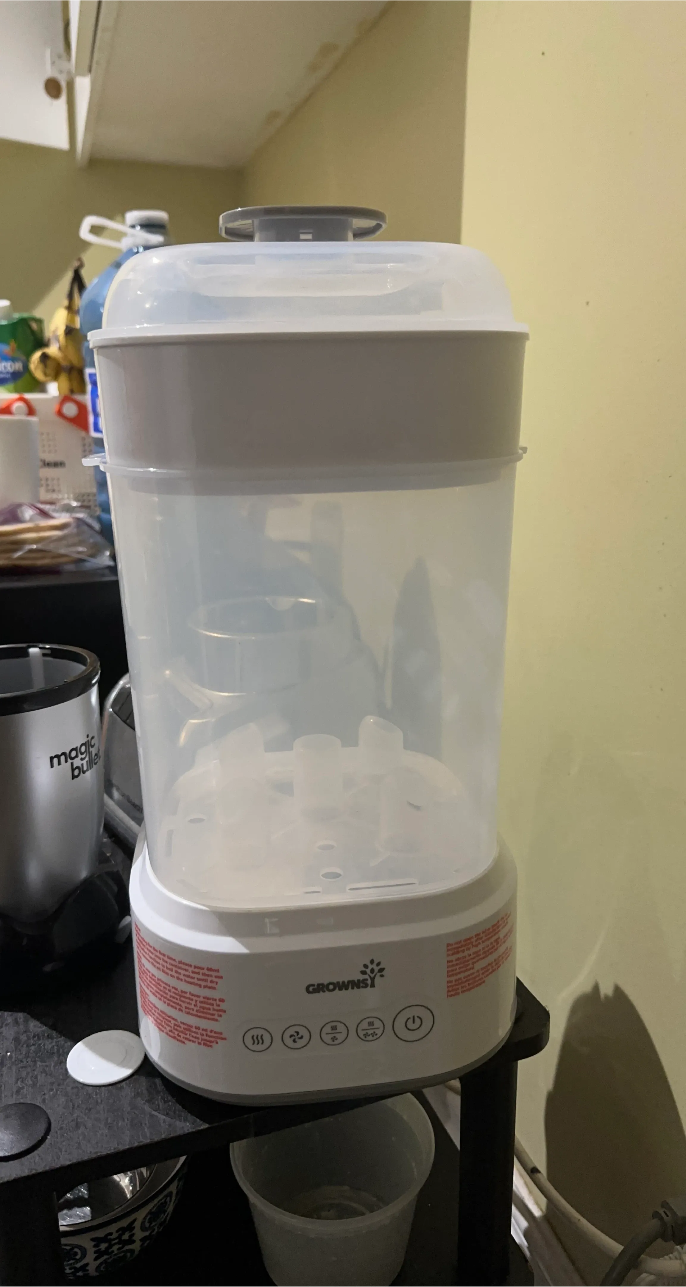 This GROWNSY bottle sterilizer and dryer is designed for baby bottles, pacifiers, and pump parts. It uses electric steam to sanitize items. It's compact and easy to use!