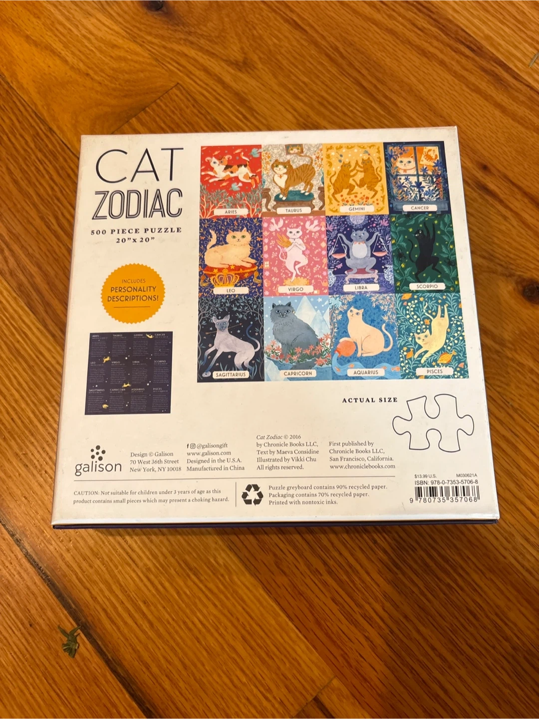 This is a 500 piece puzzle featuring the Cat Zodiac design. It includes personality descriptions. The puzzle is made from 90% recycled paper and printed with nontoxic inks. Puzzle pieces are still in the plastic, not used.