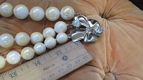 Elevate your accessory collection with the vintage charm of this Sharra Pagano necklace. A true statement piece from the 60s, it features a stunning trio of faux pearl strands, each gracefully complementing the other. The necklace is finished with an elegant silver flower pendant that adds a touch of timeless sophistication. Carefully designed with a beaded style that exemplifies classic beauty, this piece is a testament to the exquisite craftsmanship of its era. Whether you're accenting an antique-inspired ensemble or adding a dash of vintage flair to your modern look, this necklace will surely be a cherished addition to your jewelry collection. Pouch is included. The necklace smells like soap, I have no idea why.