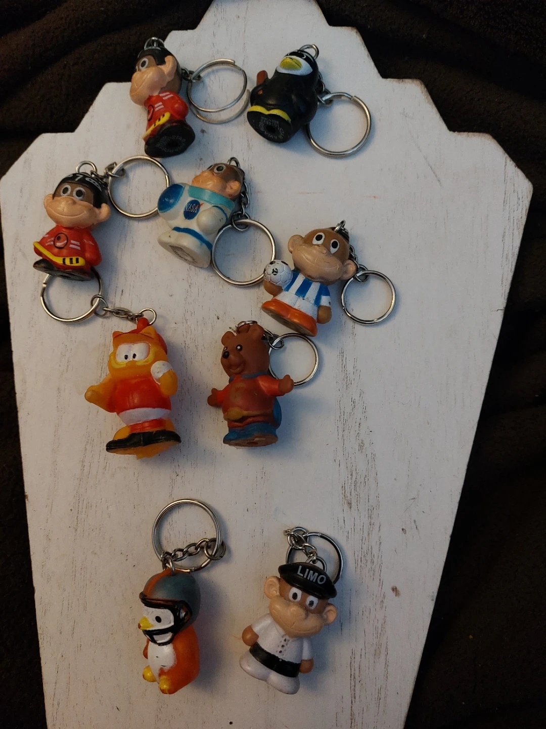 Nine assorted character keychains, including monkeys, penguins, a bear, and other cartoon figures. These are fun little accessories for bags or keys. Great for collectors or as small party favours!