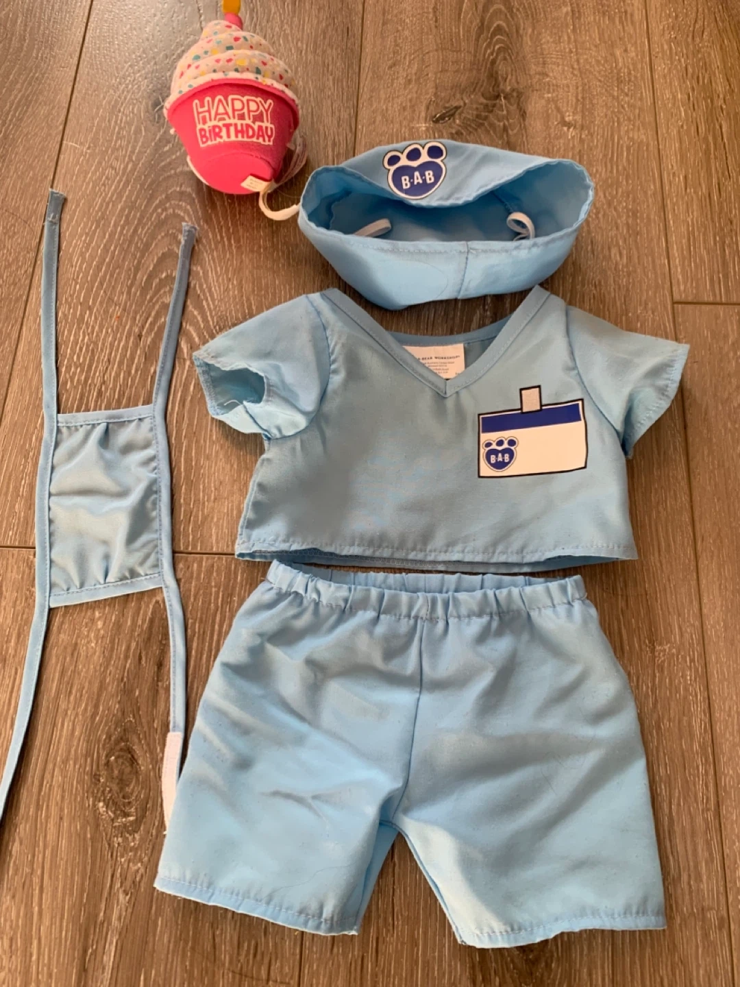 A cute little Build-A-Bear Workshop doctor outfit, complete with scrubs, a cap, and even a little face mask! Also includes a birthday cupcake plush accessory. Perfect for your furry friend!