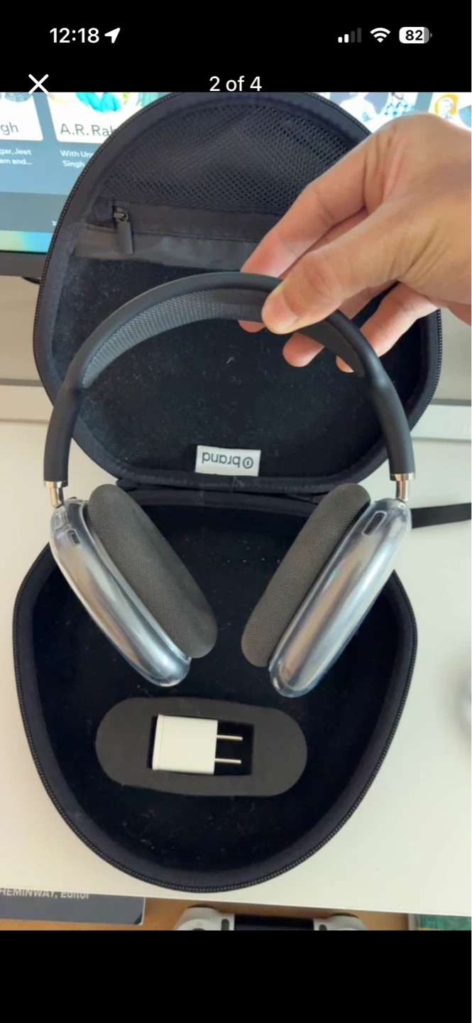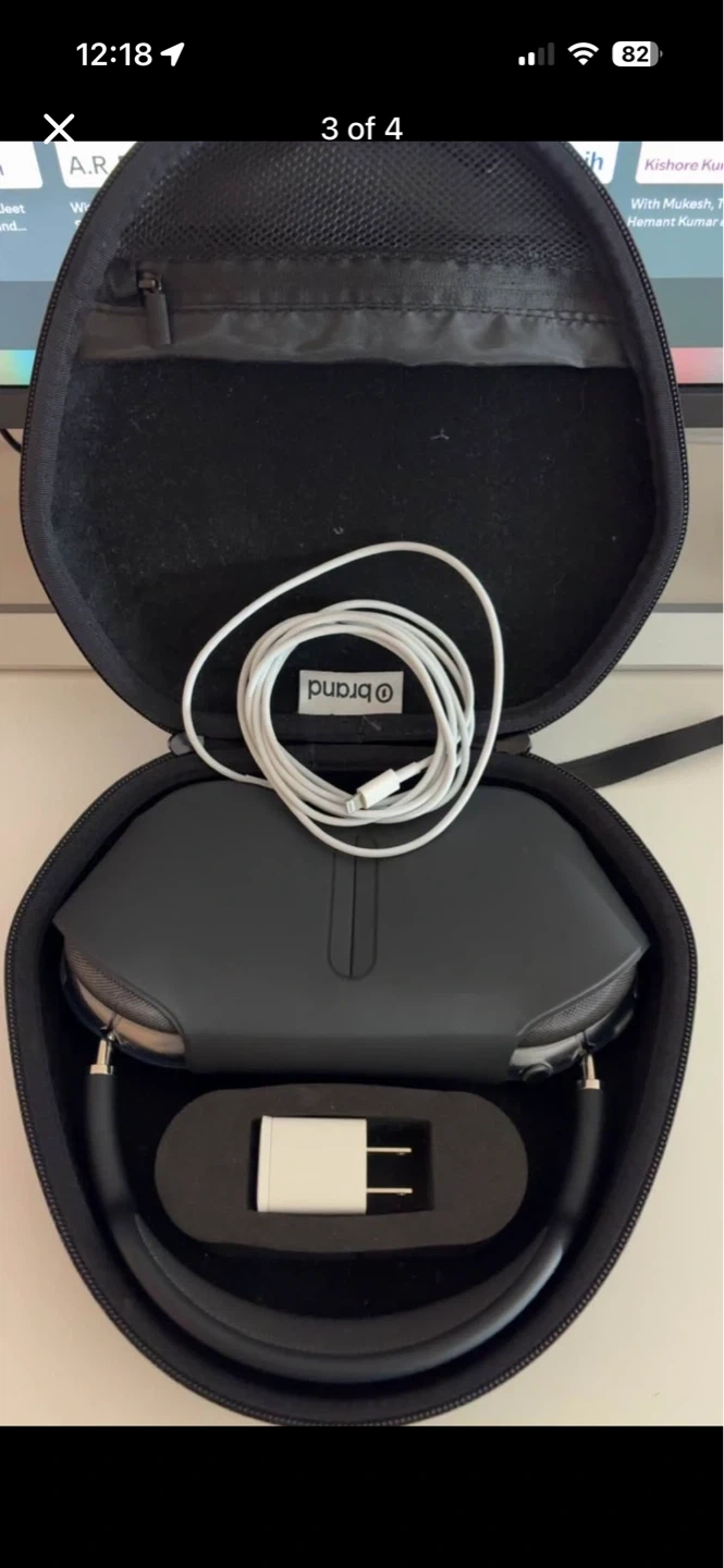 These Apple AirPods Max are in a black protective case. They come with a charging cable and power adapter. This is a complete set for listening on the go.