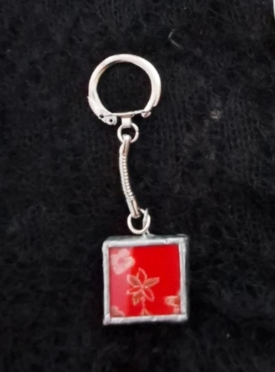 A charming red square keychain with a delicate floral pattern. It's made with stained glass and metal components. This accessory is perfect for jazzing up your keys!