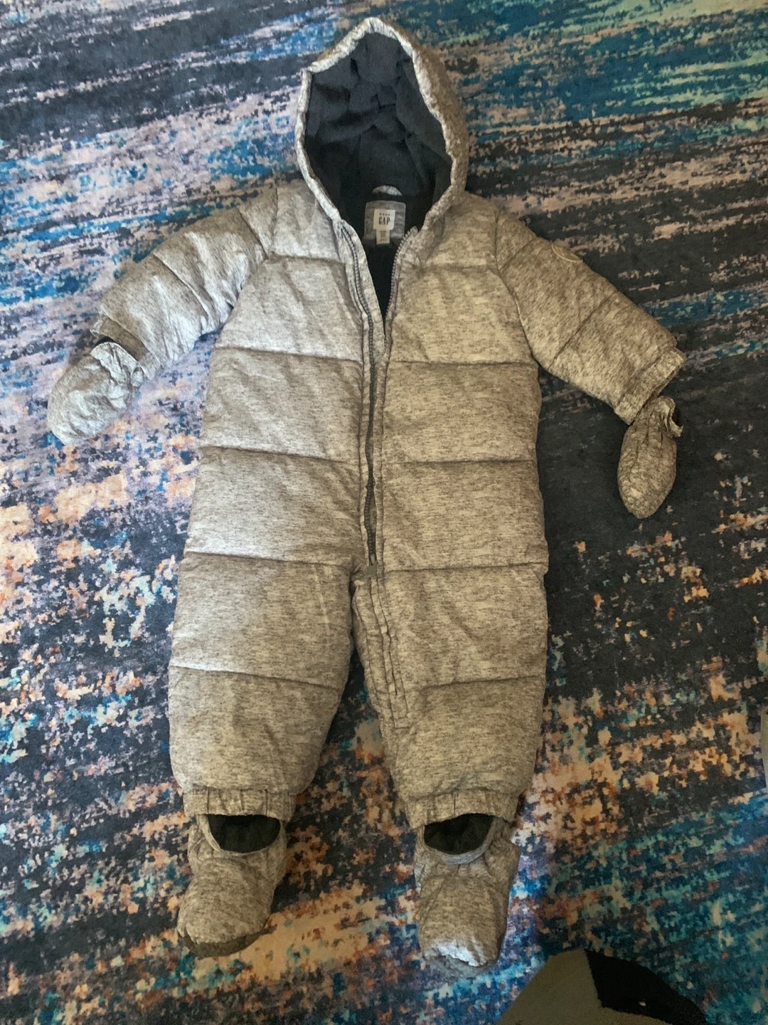Grey quilted snowsuit from Baby Gap. Includes attached mittens and foot covers. Made in Vietnam. Perfect for keeping your little one warm during colder months!