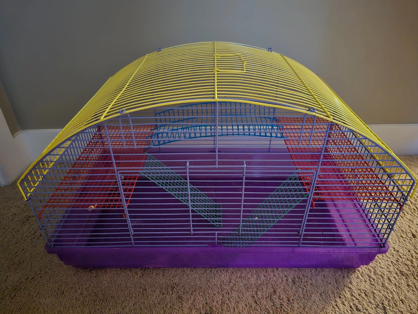 A colourful small animal cage with multiple levels and ramps. It's suitable for hamsters or gerbils. The plastic base is purple and the wire top is yellow with blue, red, and green accessories.