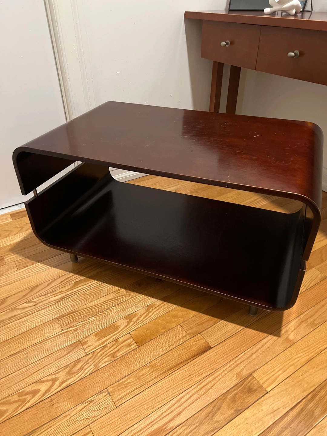 Dark brown wood coffee table. Curved design. Open lower shelf. Small scratches on top. Legs are short and dark brown.