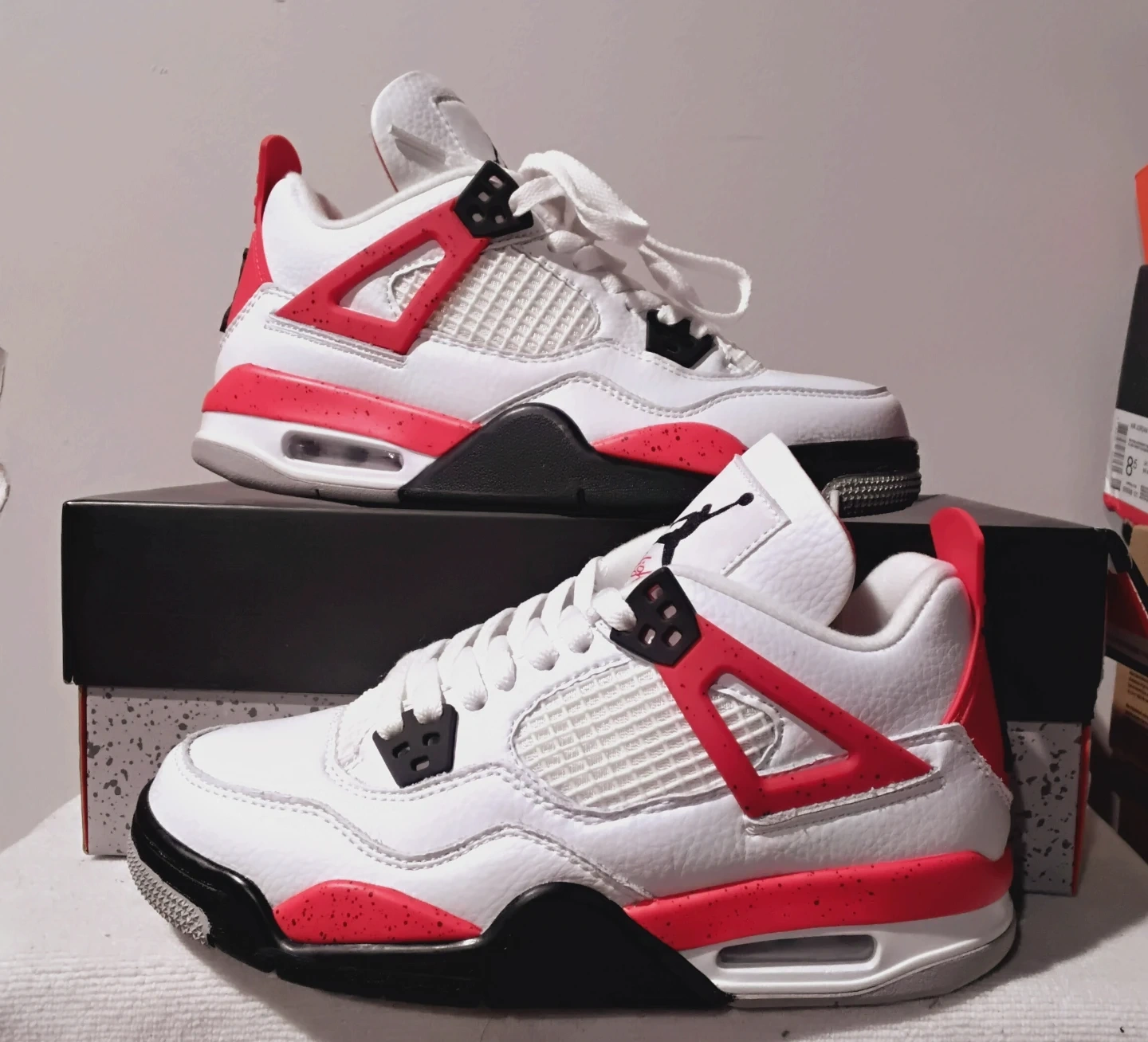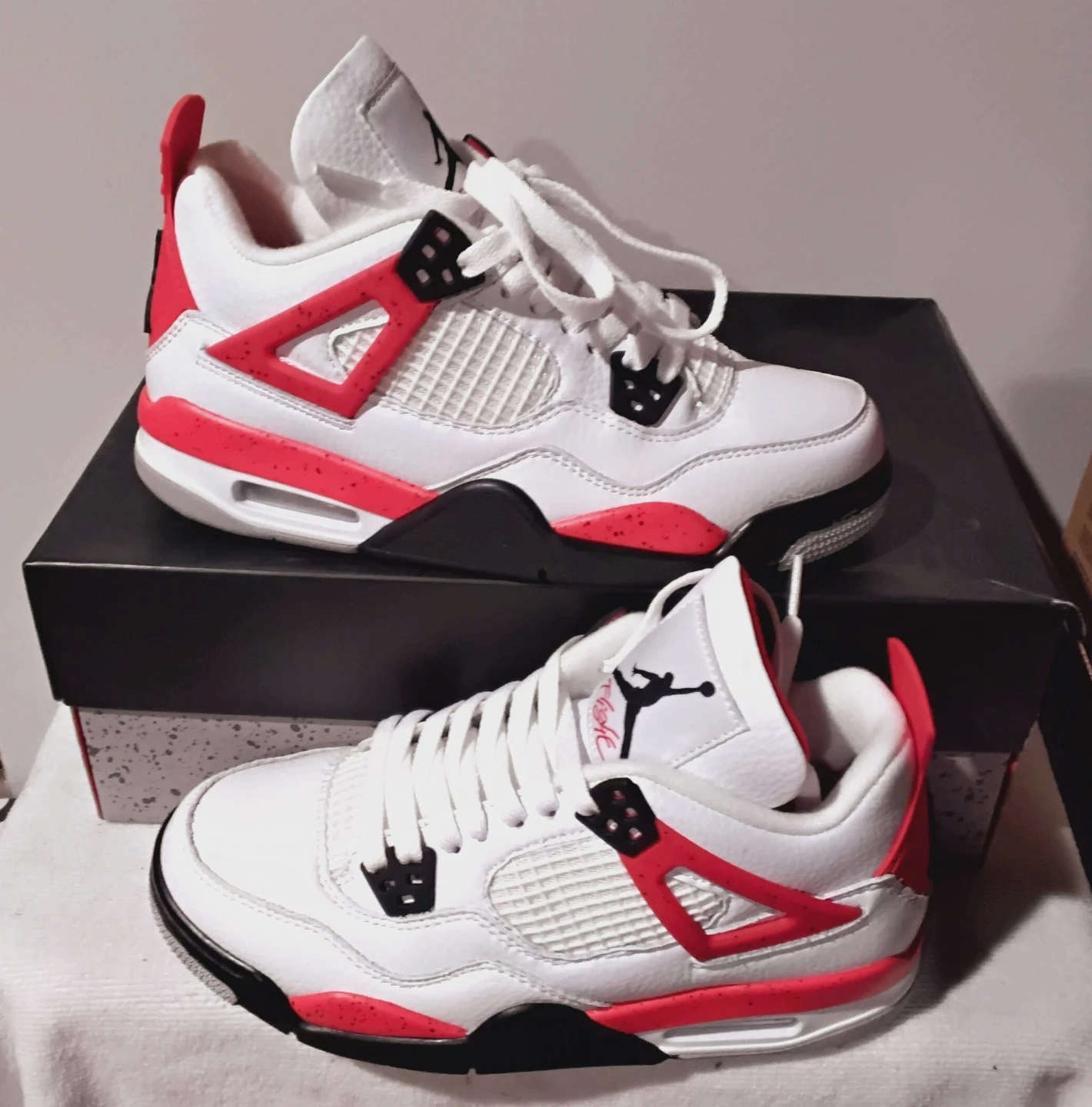 These toddler Air Jordan 4 Retro shoes come in a white, red, and black colorway. They're the iconic AJ4 silhouette with speckled red accents on the midsole and heel. Includes original box.