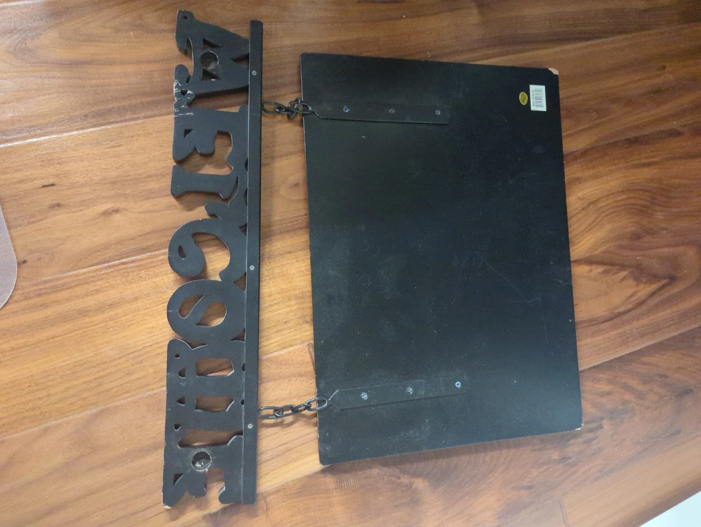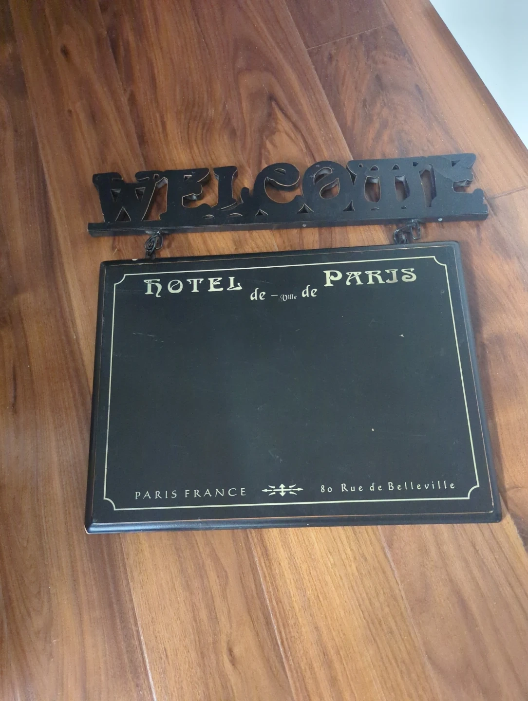 Vintage style hanging sign with 'WELCOME' on top and a chalkboard panel below.