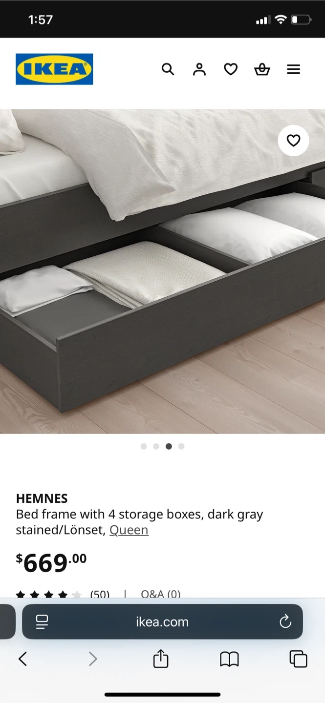 Selling an IKEA Hemnes queen bed frame with four storage boxes! It's a great way to maximize space and keep your bedroom tidy. The dimensions are 213 cm (83 7/8") in length and 167 cm (65 3/4") in width. Originally bought for $669
