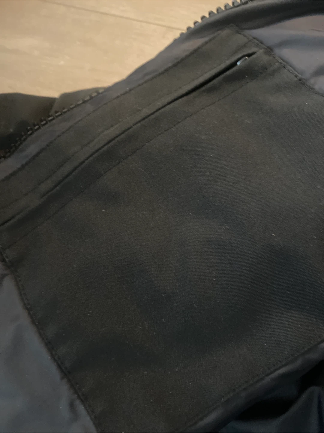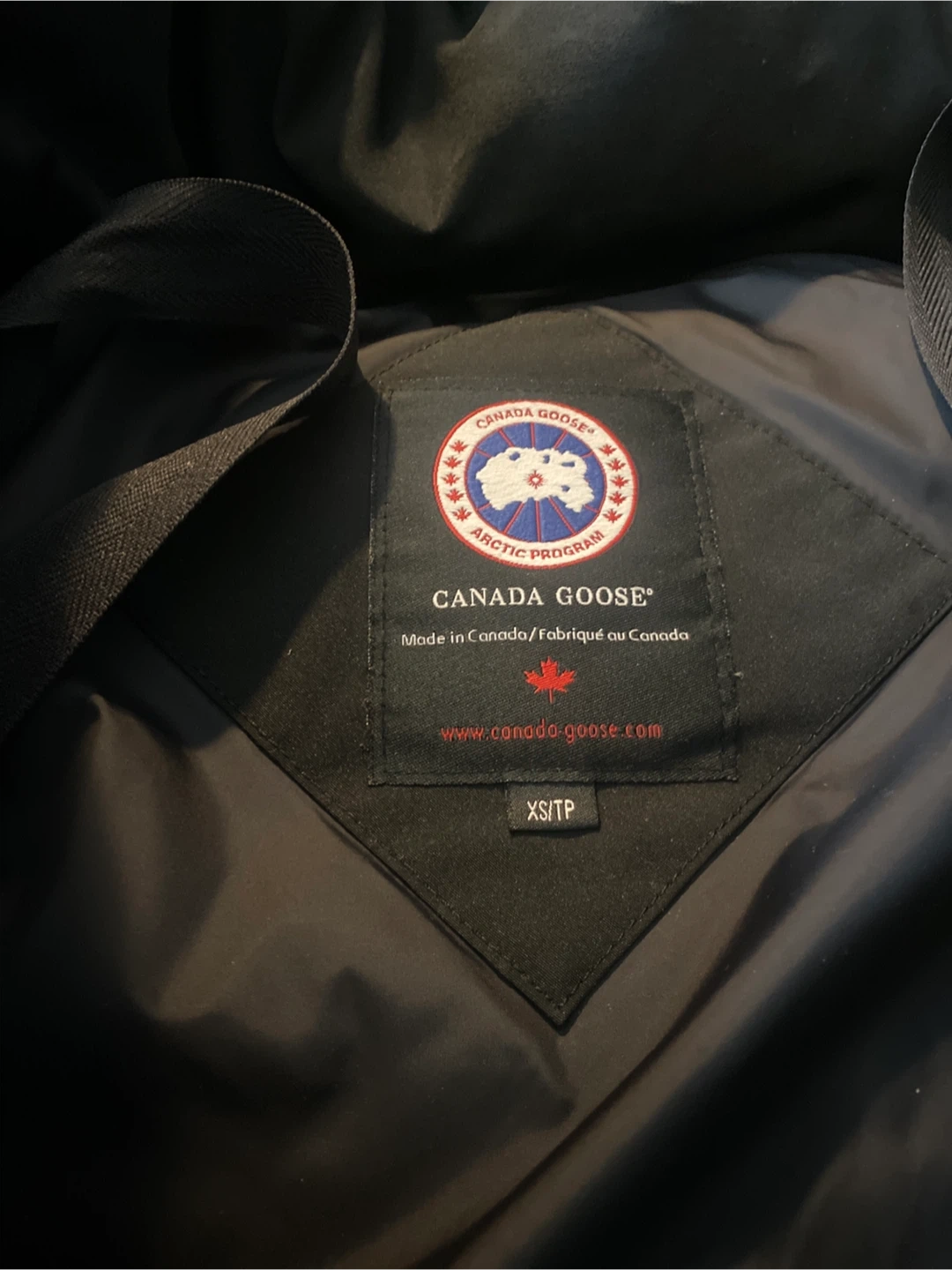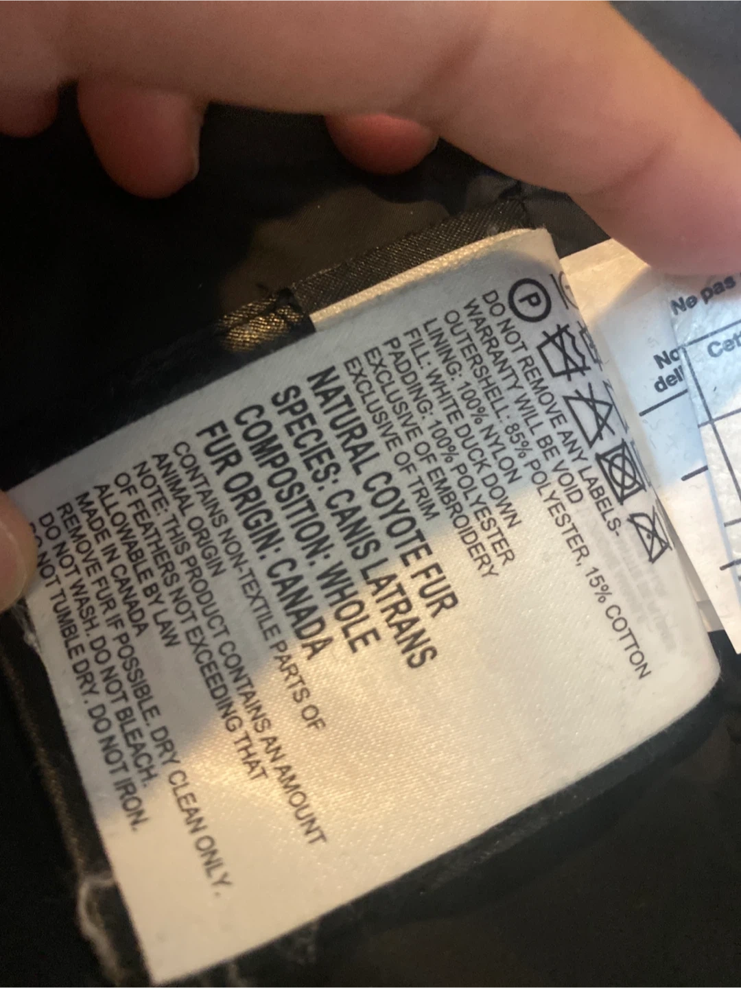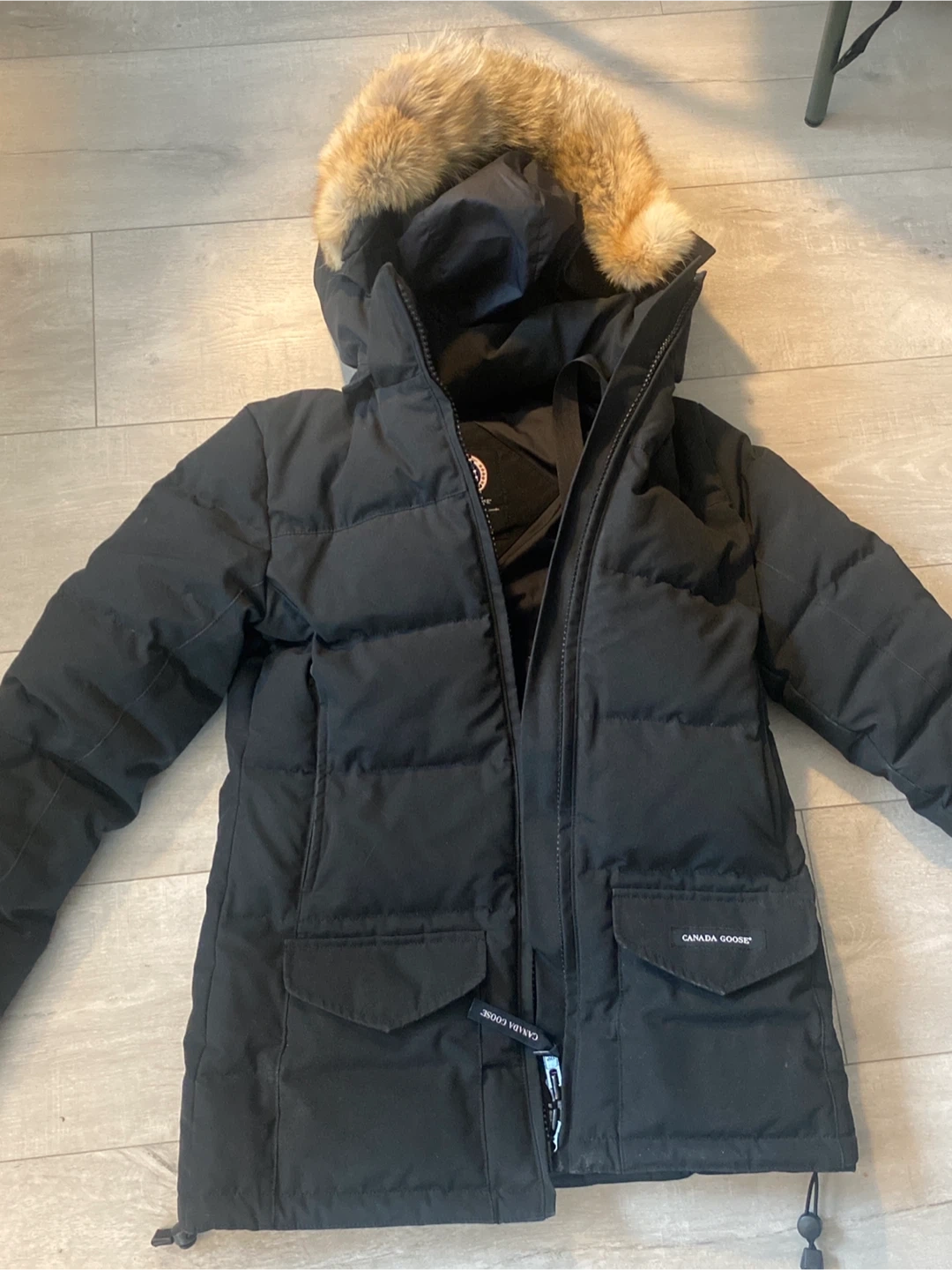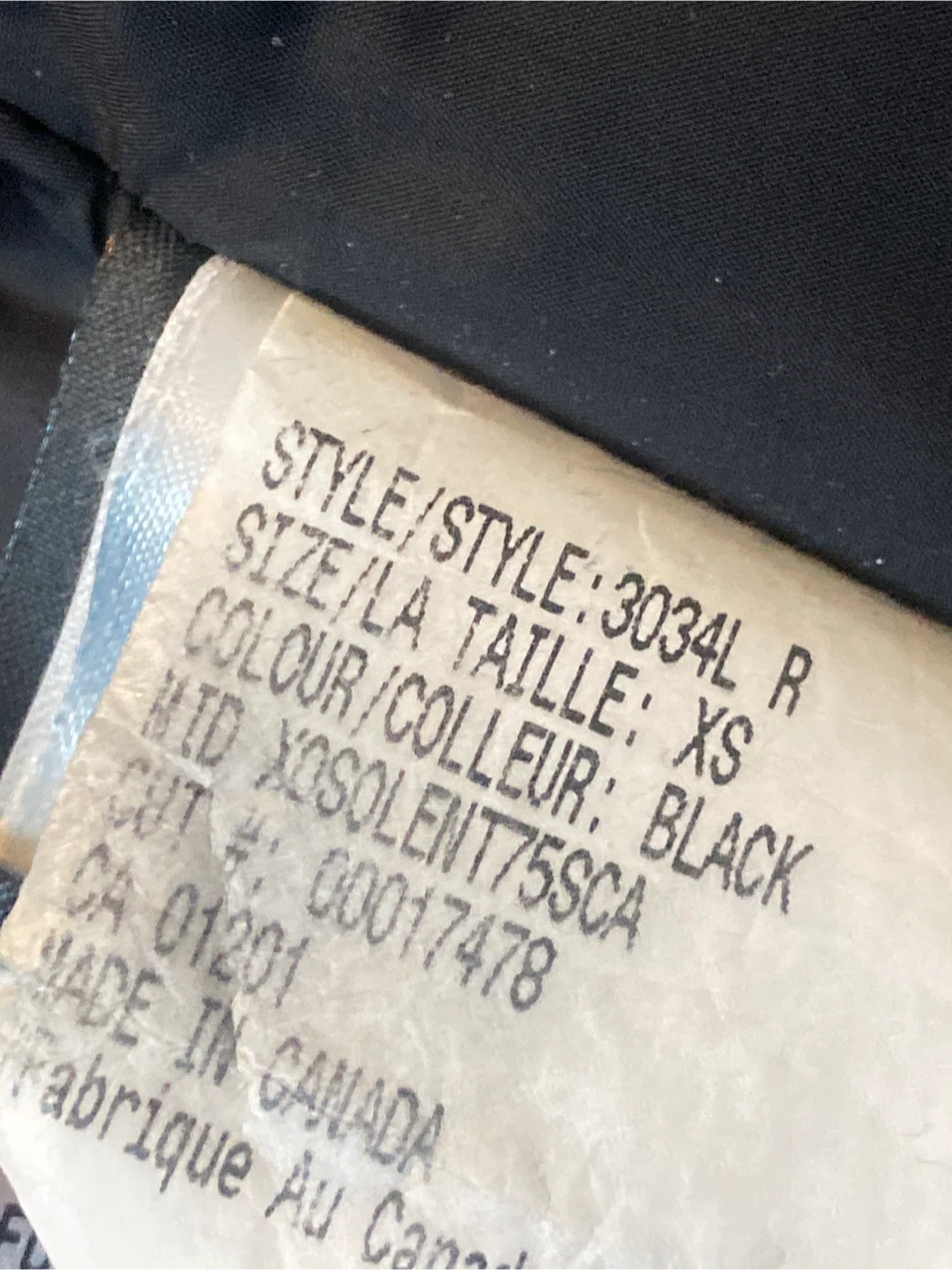 Selling a Canada Goose down parka in black, size XS. The style number is 3034L R. It's made in Canada with coyote fur trim. The outer shell is 85% polyester and 15% cotton, with a 100% nylon lining and white duck down filling