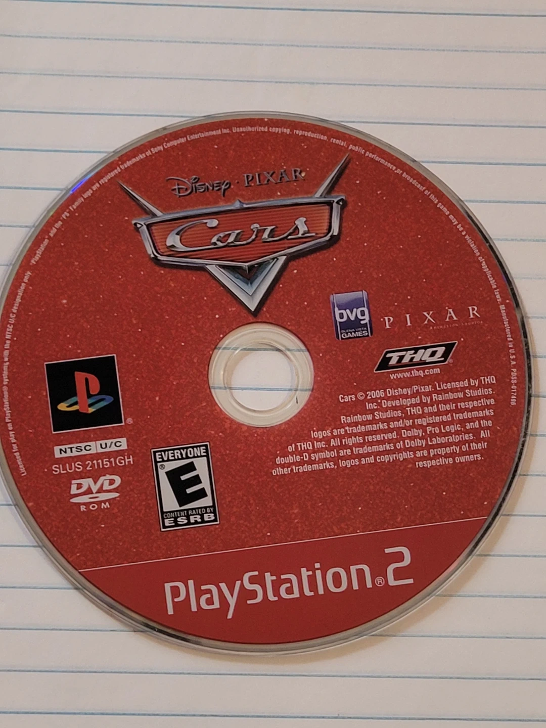 This is the Cars video game for the PlayStation 2. It's rated E for Everyone by ESRB. Game disc is included.