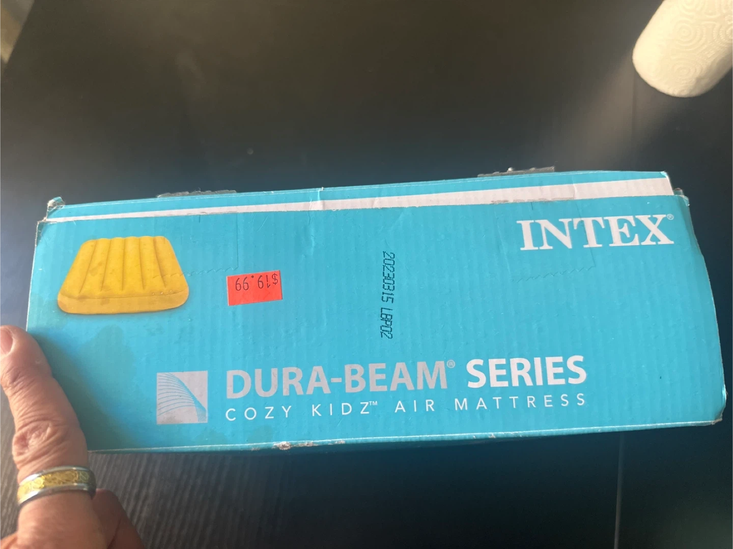 Selling a brand new Intex Dura-Beam Cozy Kidz Air Mattress, still in its original packaging! It's a one air bed, sized at 34.5 inches x 62 inches x 7 inches. The box also indicates a recommended age range of 3-10 years. Don't forget a pump to inflate!