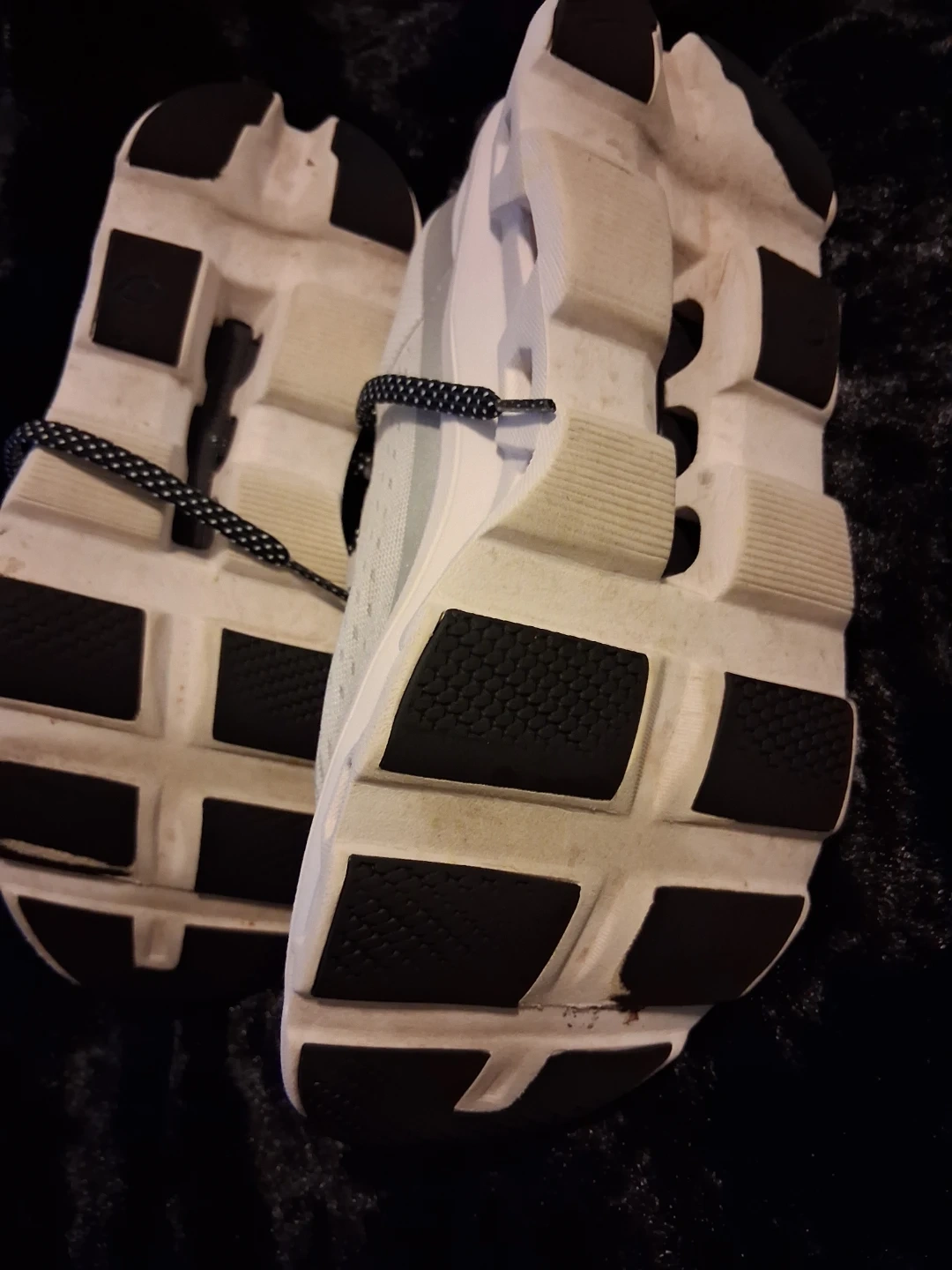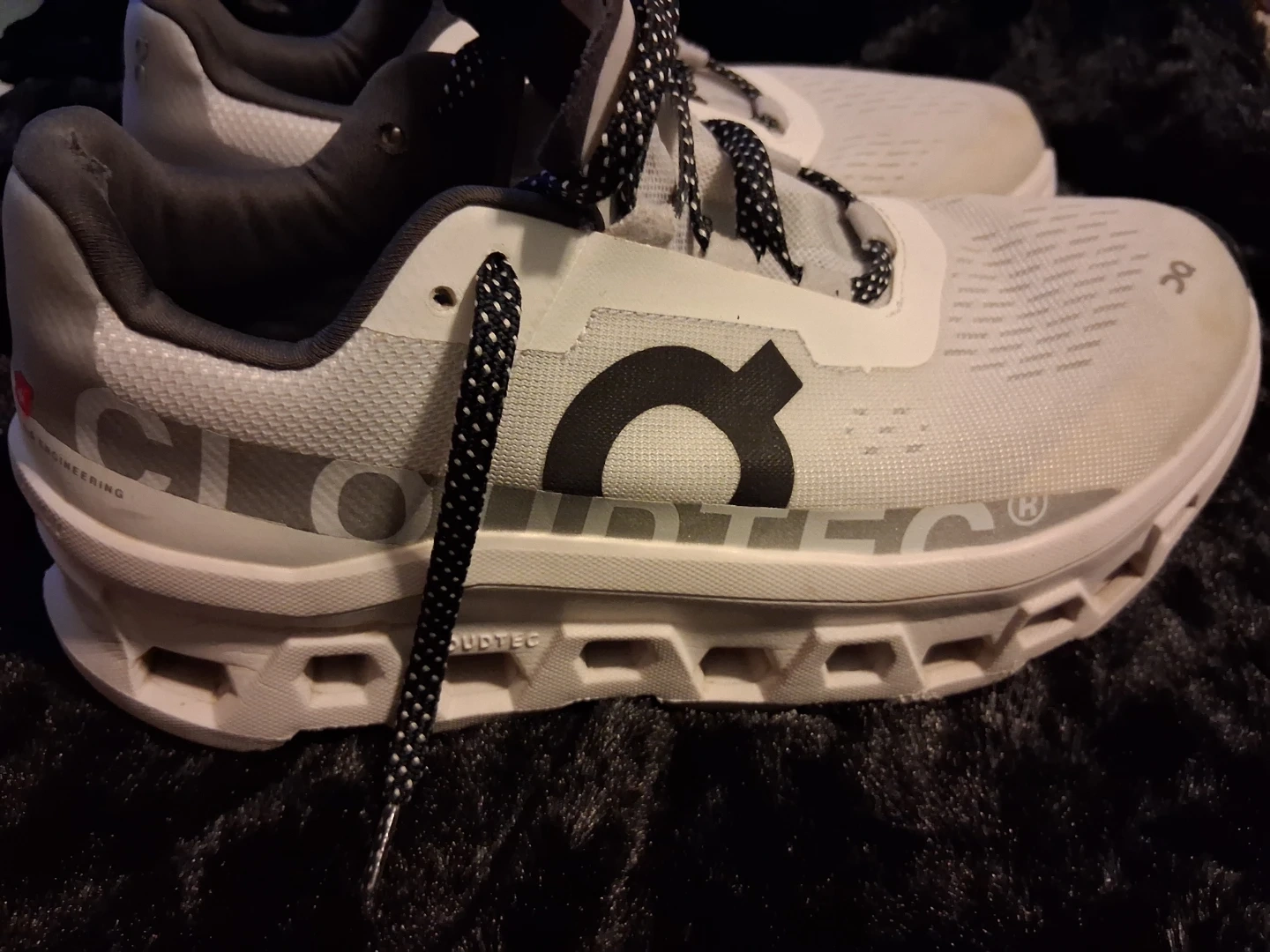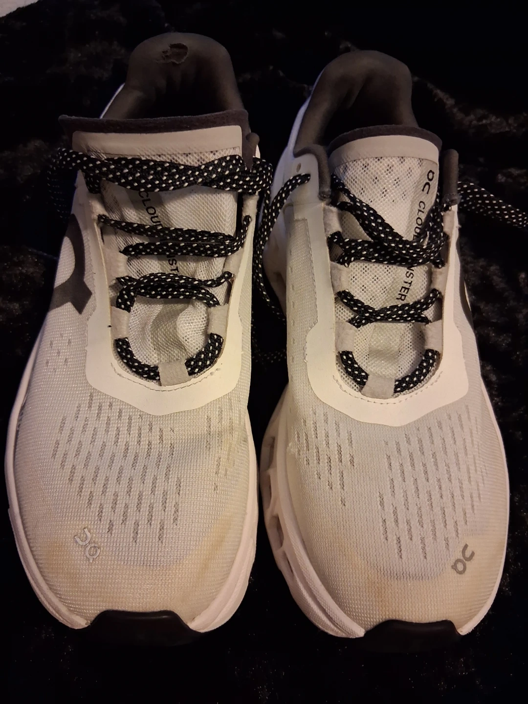 On Cloudmonster running shoes in white. Features CloudTec cushioning. Some minor scuffs on the uppers and soles. Slight wear on the heel collar.