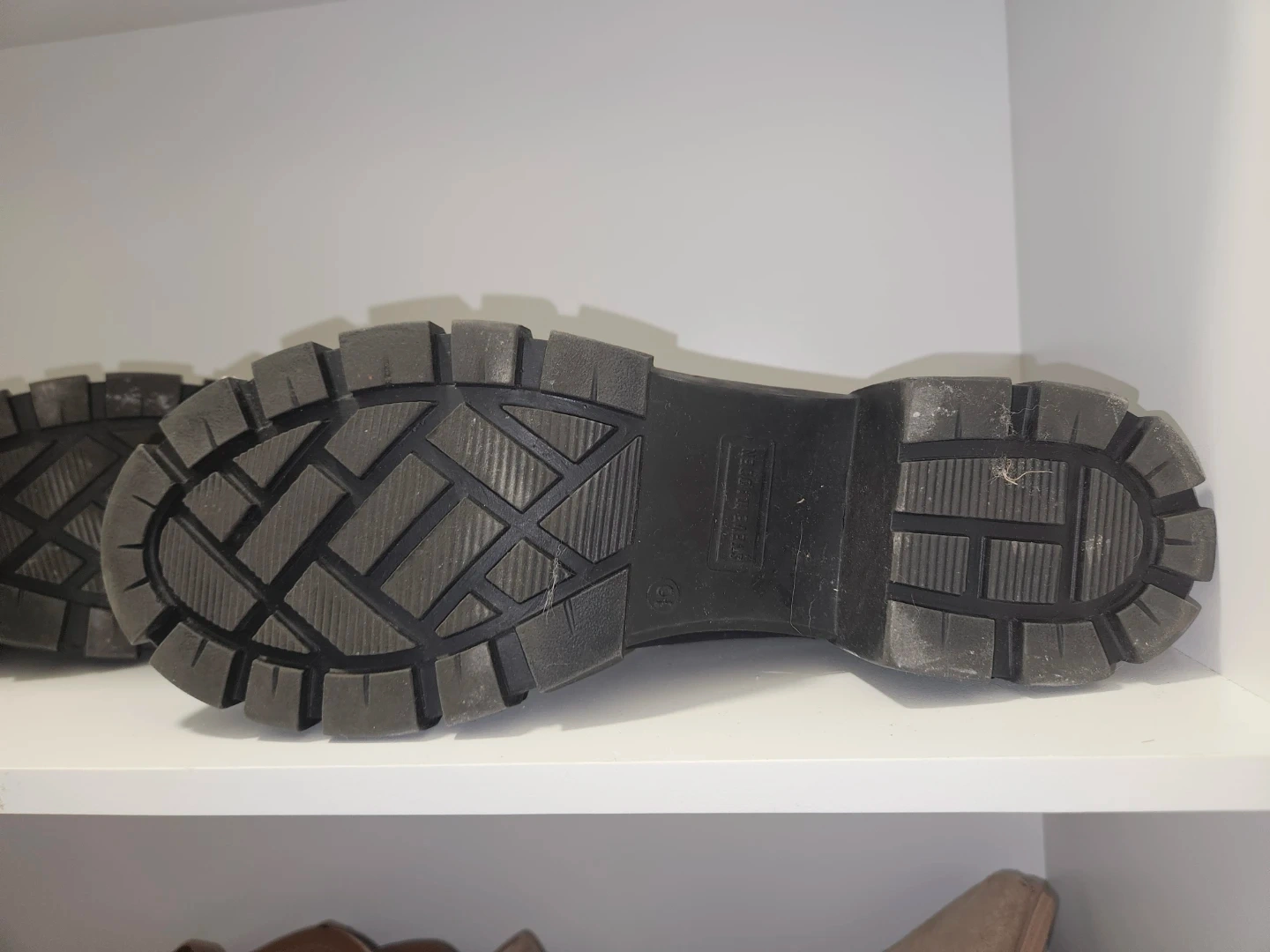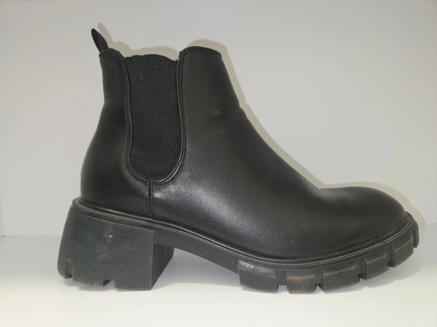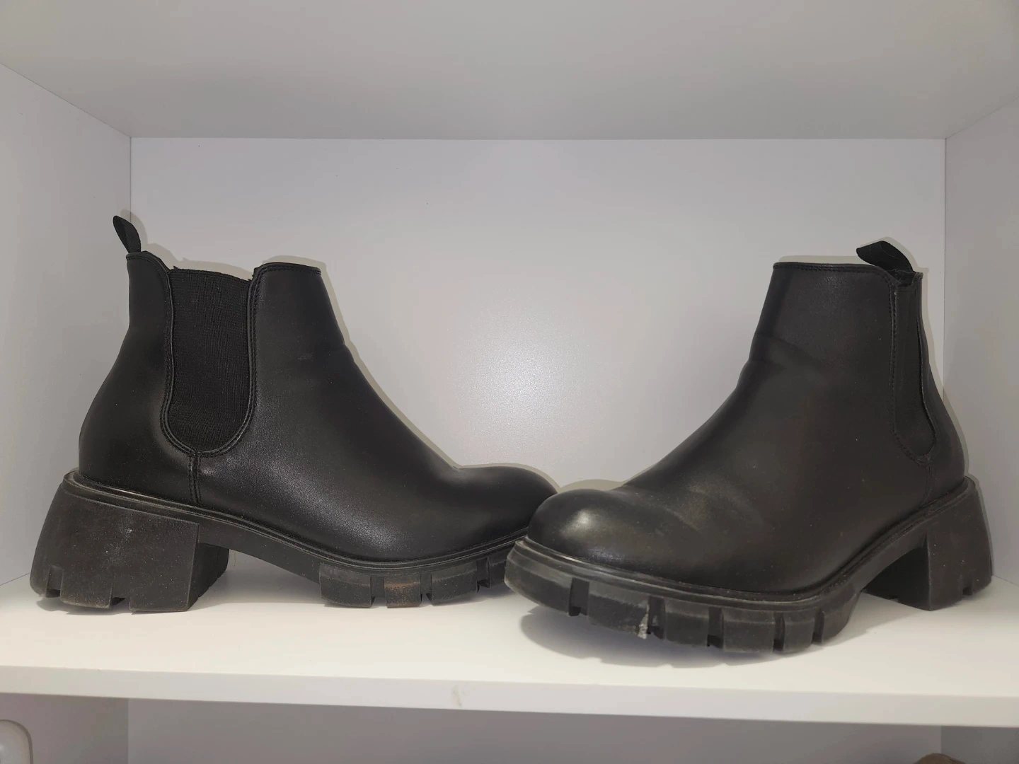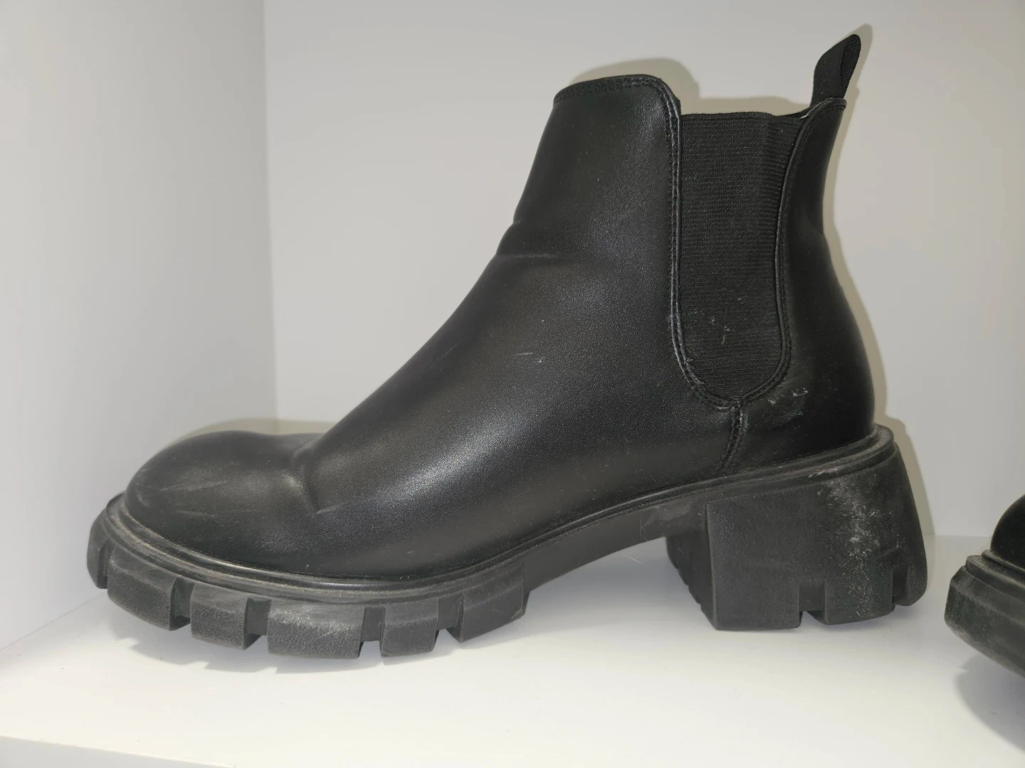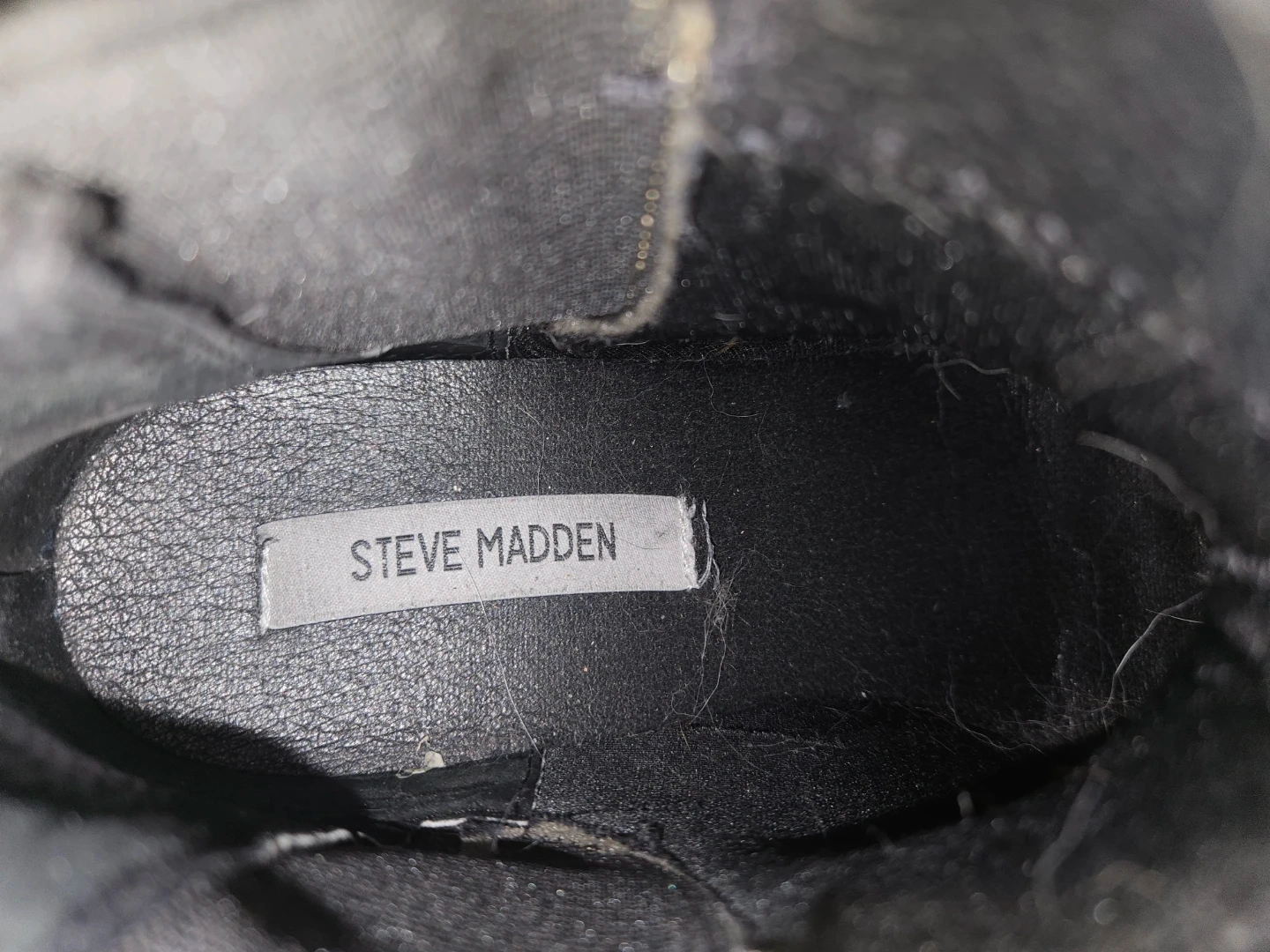 These Steve Madden boots feature a chunky lug sole and a classic Chelsea boot design. They're made from black leather with elastic side panels. Perfect for adding a bit of edgy style to any outfit!