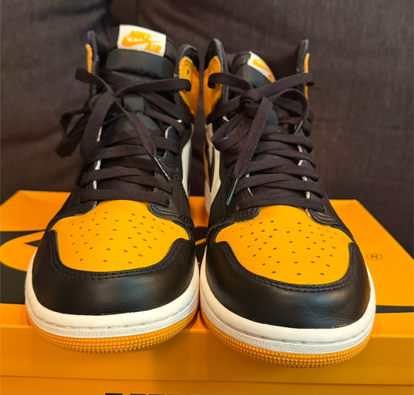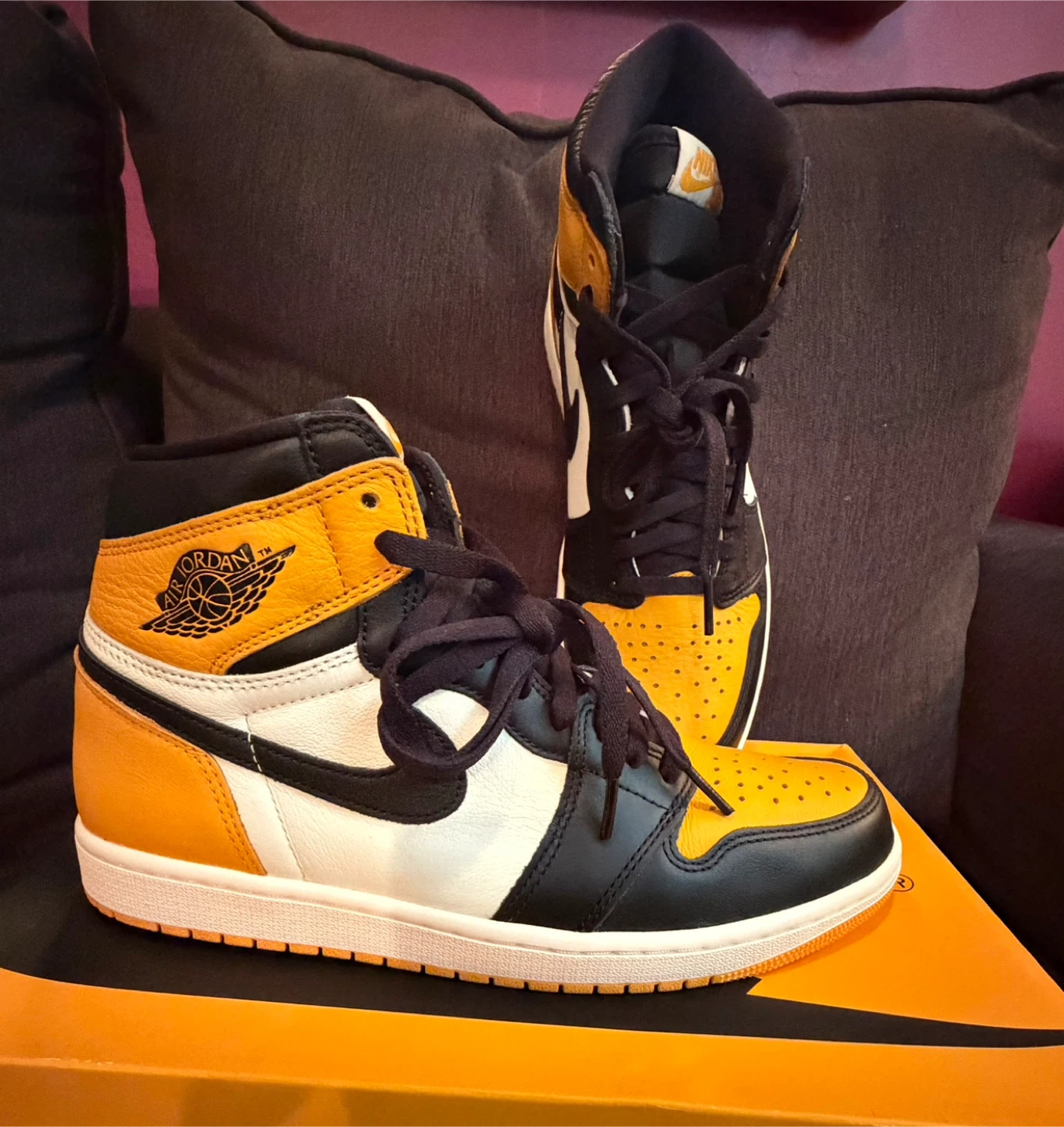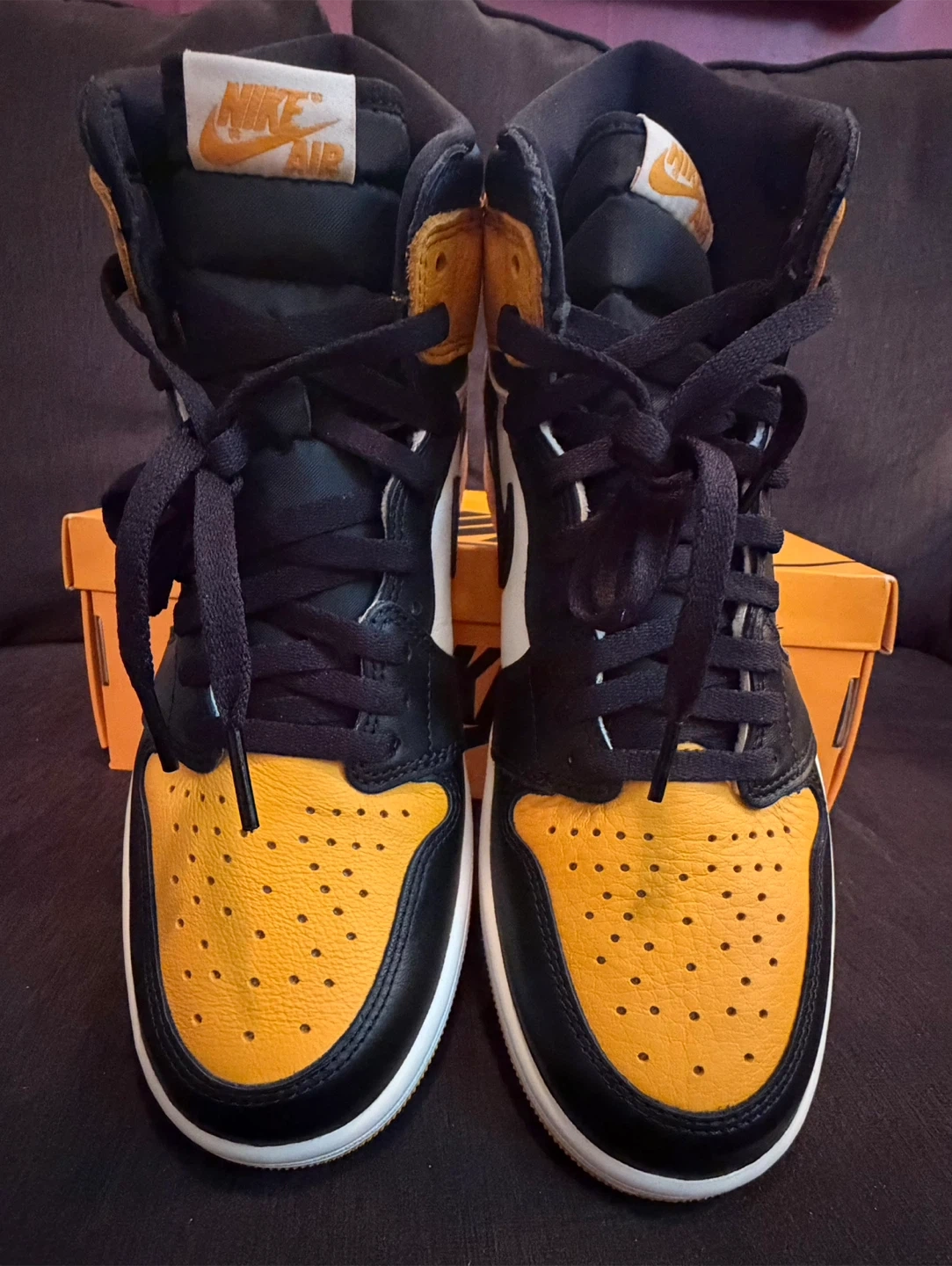 These are the Nike Air Jordan 1 High OG sneakers in the "Pollen" colorway. They feature a leather construction with black, white, and yellow accents. Includes the original box and laces.