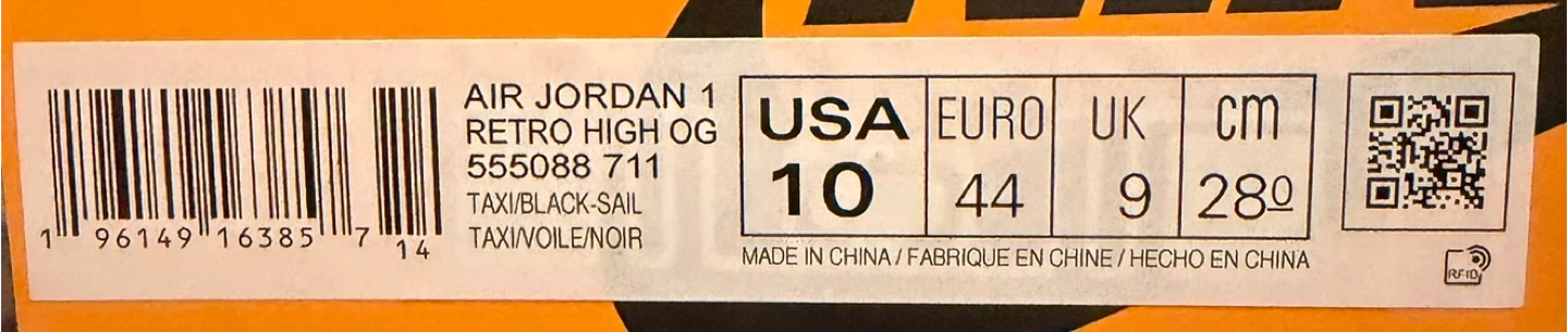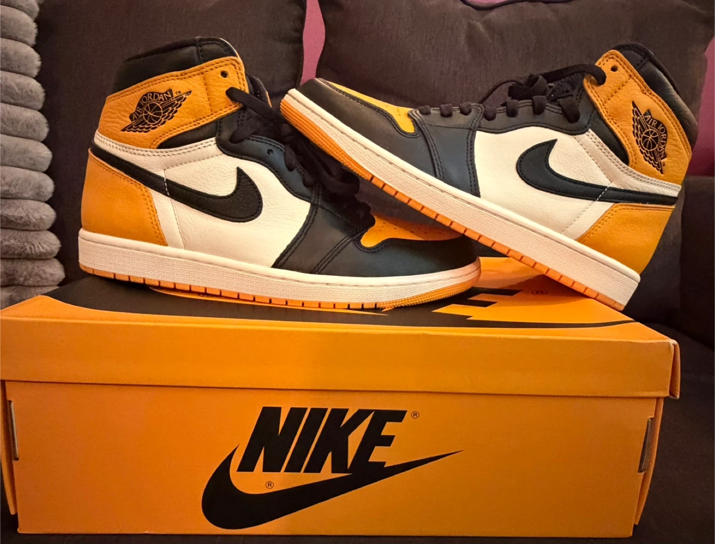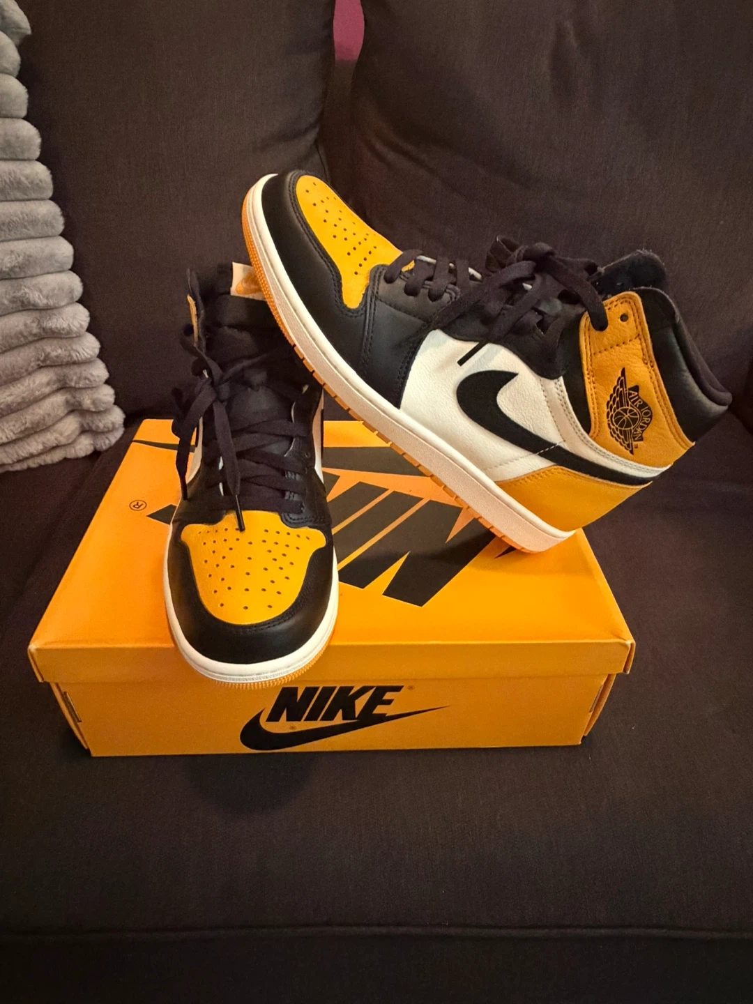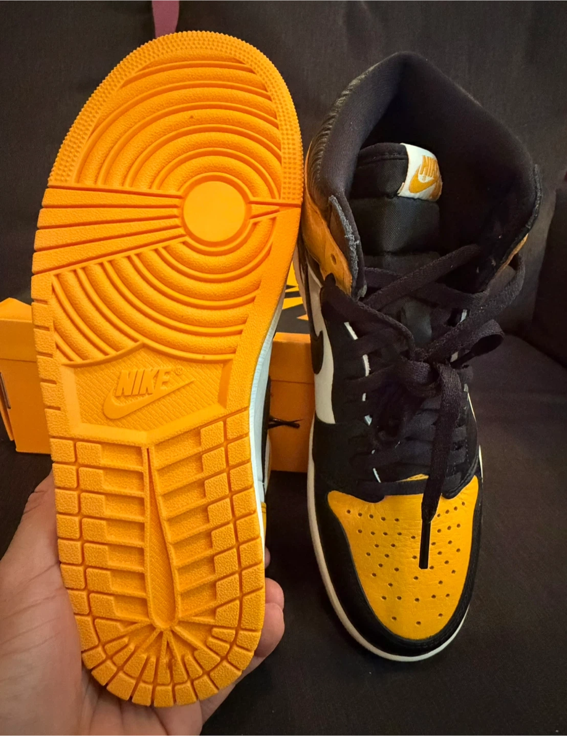 These are the Nike Air Jordan 1 High OG sneakers in the "Pollen" colorway. They feature a leather construction with black, white, and yellow accents. Includes the original box and laces.