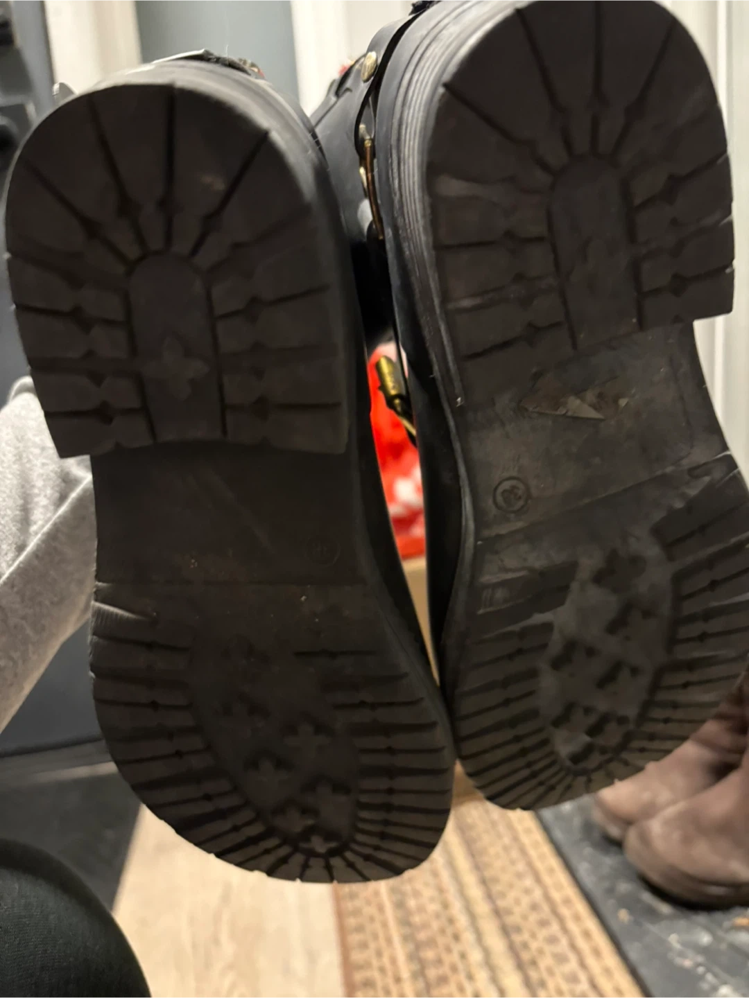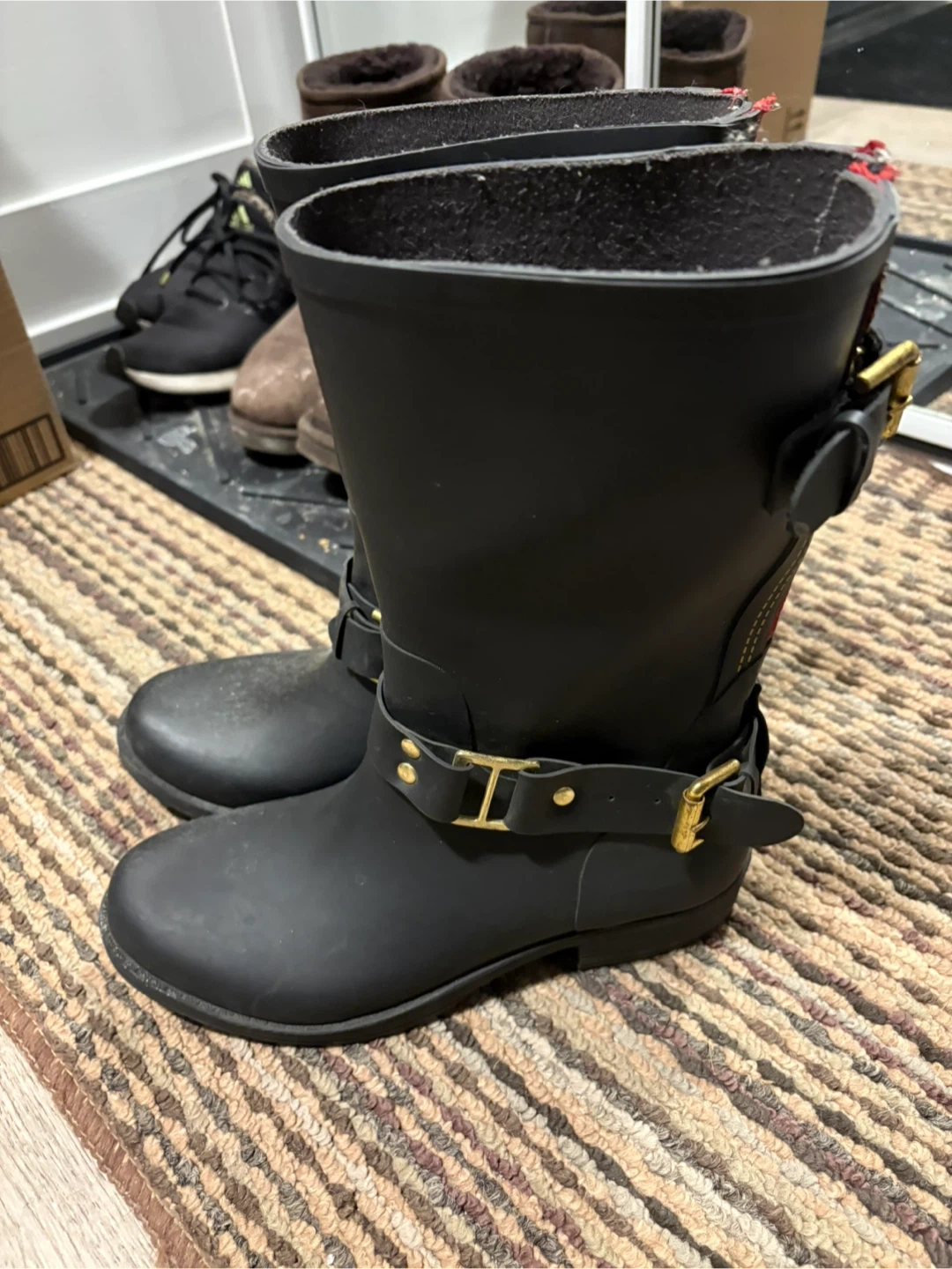 Selling a pair of B2 rain boots in black! They're in great condition and have a unique design with red zippers and gold buckles. The size is 38.