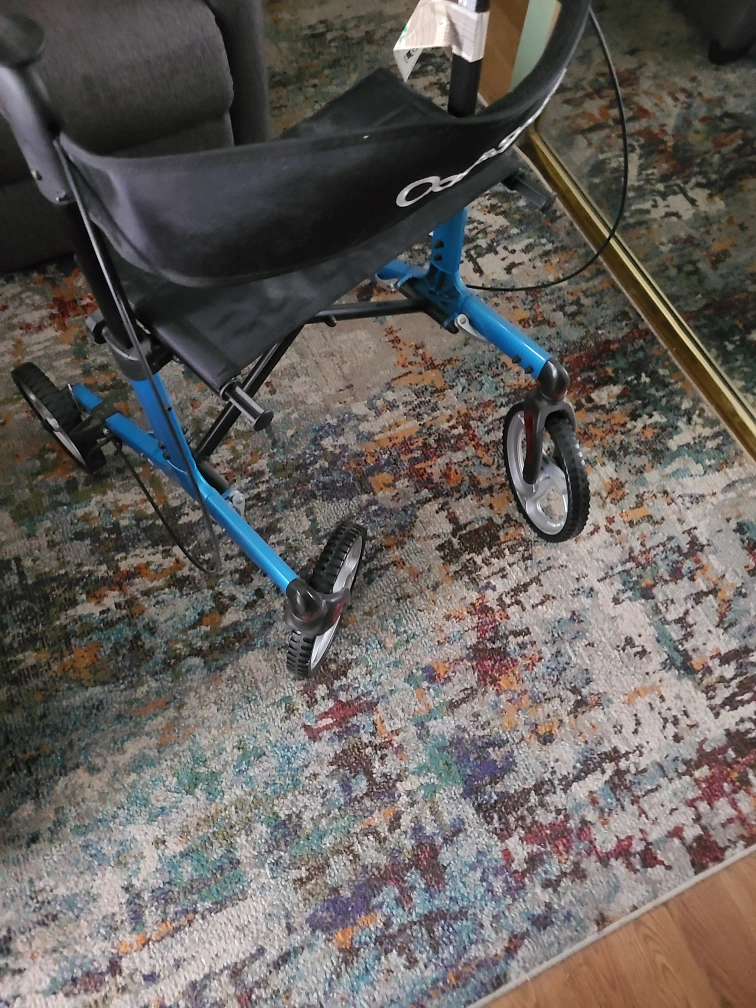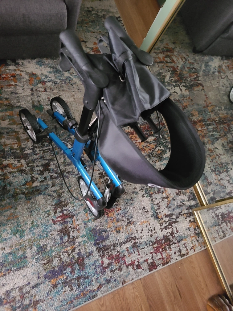 Walker with four wheels. Features a black seat and storage bag. It's a great aid for anyone who enjoys a relaxing stroll. foldable, Harlem pick up only.