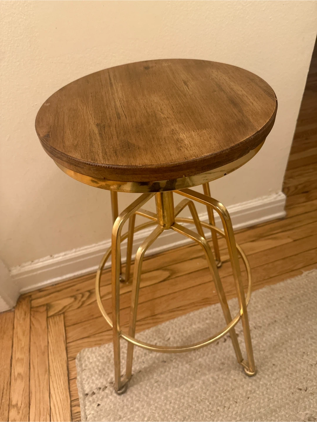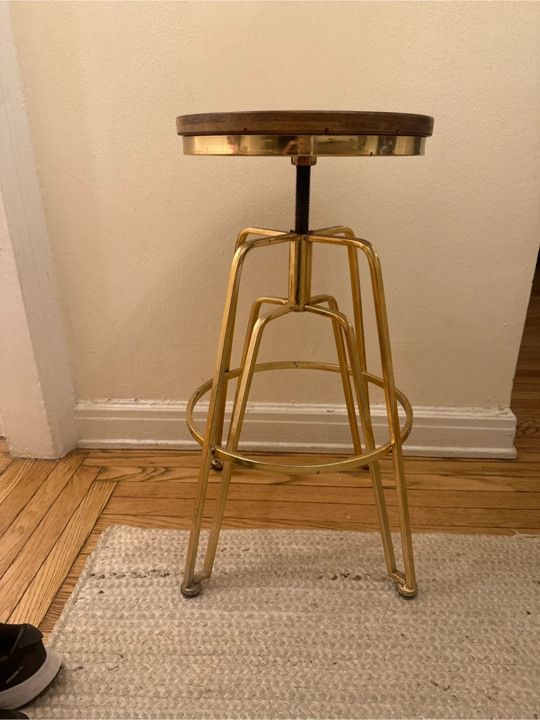 65Selling a stylish adjustable height bar stool. It features a walnut seat and a gold-colored metal frame. It would be a great addition to any kitchen or bar area. Height mentioned in measurements is at the highest setting