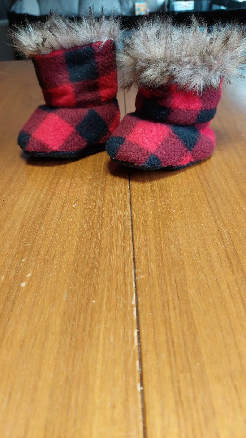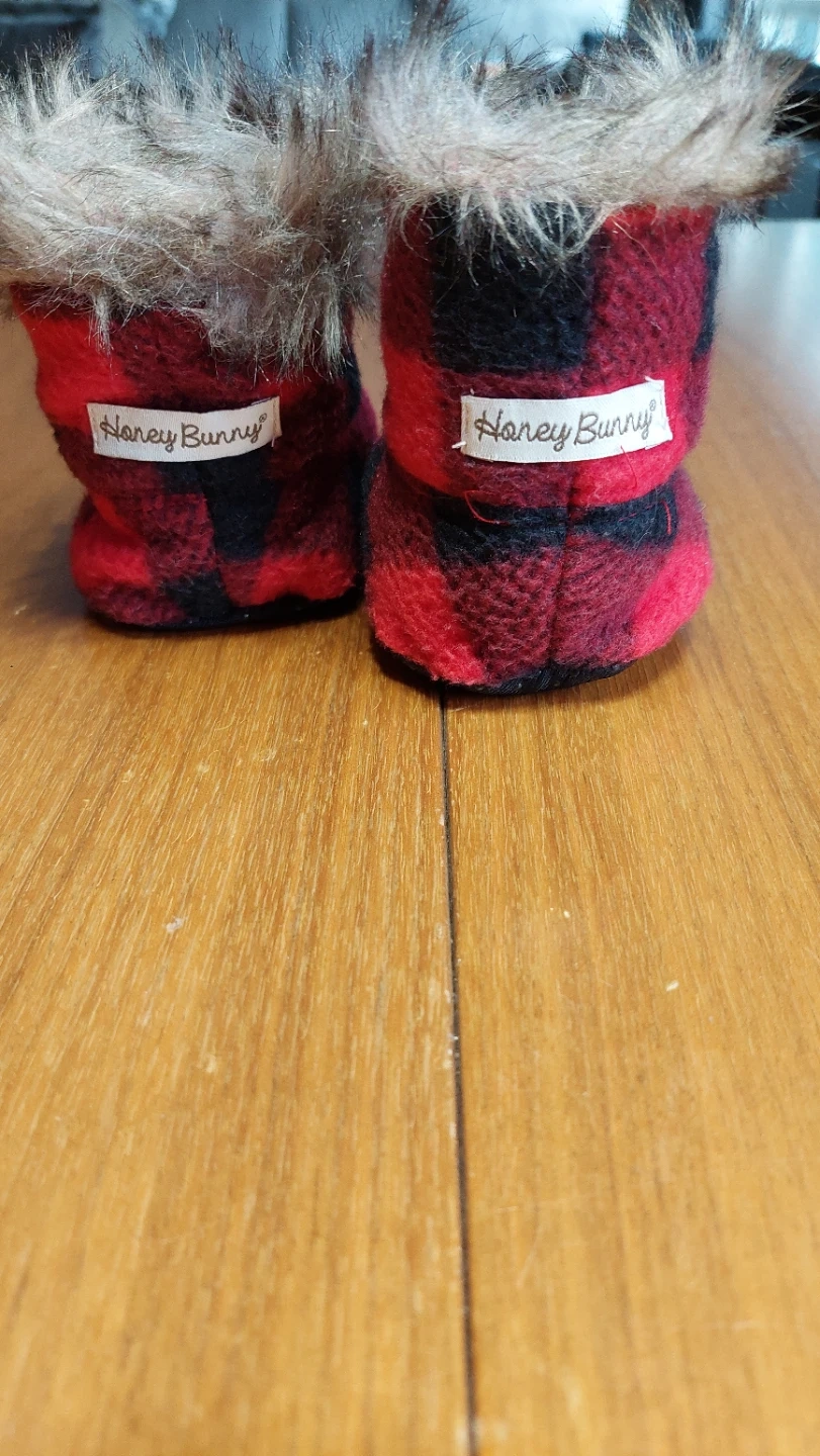 Adorable Honey Bunny baby boots featuring a classic red and black buffalo plaid pattern. They're designed with cozy faux fur trim for extra warmth. Perfect for keeping little feet snug and stylish!
