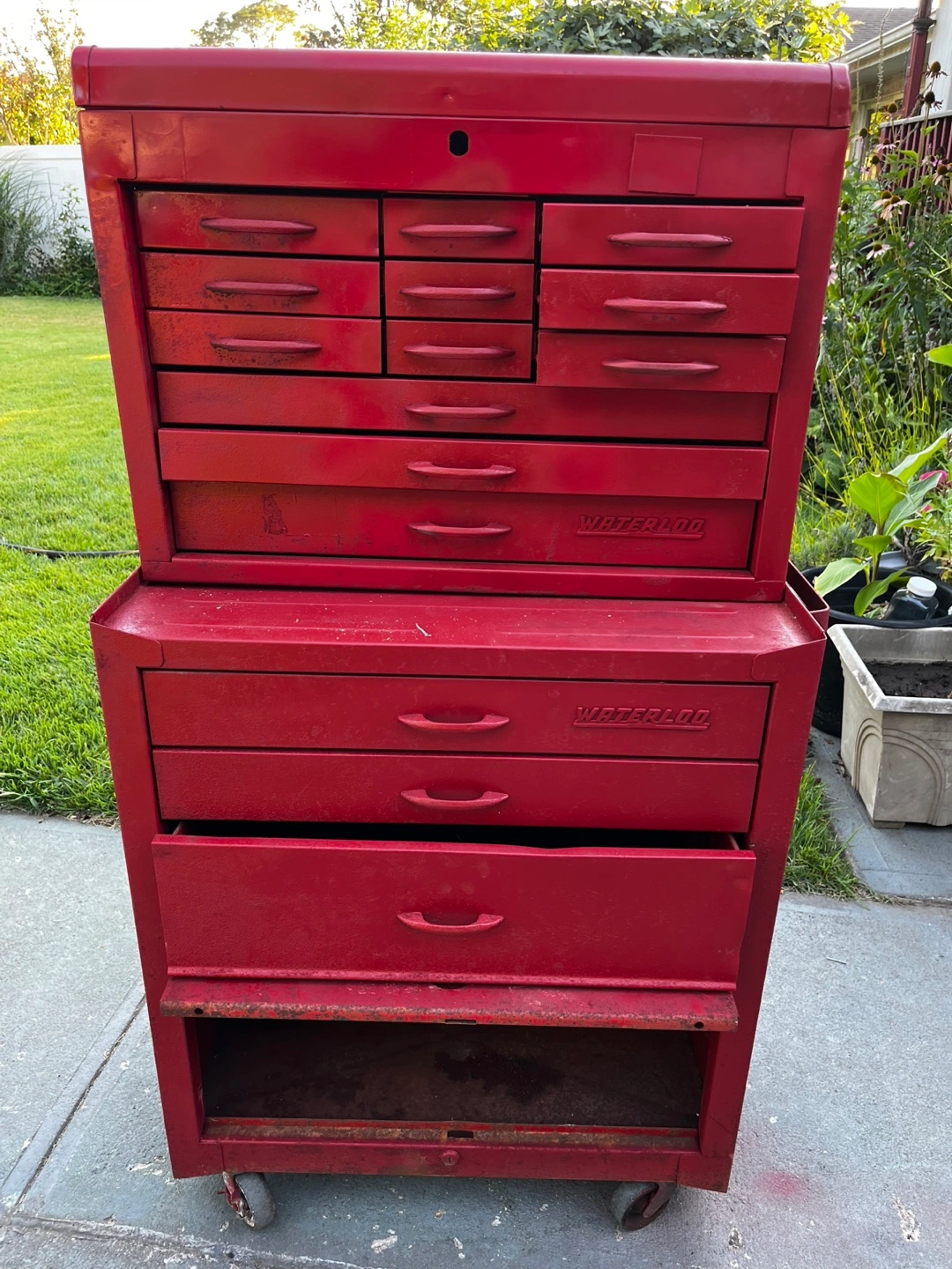 Selling a red Waterloo tool chest. It has a good amount of storage with the multiple drawers. It's on wheels so it's easy to move around your workspace!