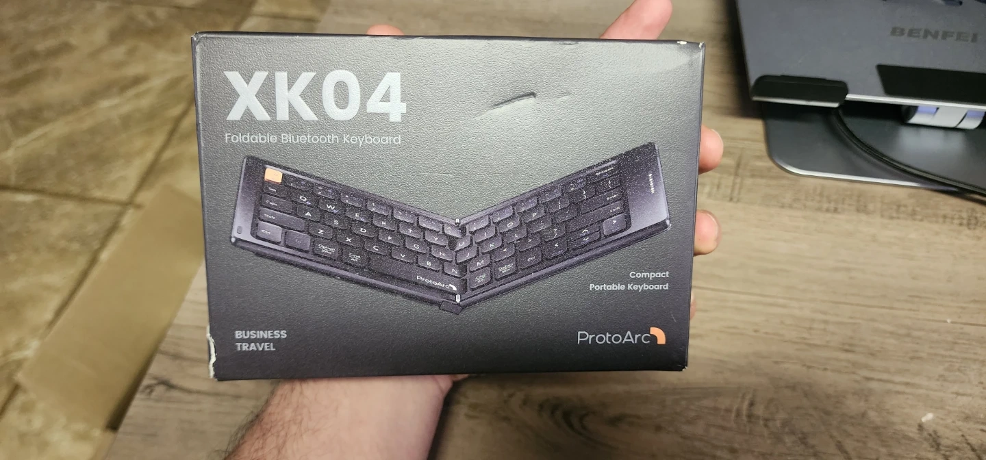This is the ProtoArc XK04 foldable Bluetooth keyboard. It's a compact and portable keyboard designed for business travel. Includes the keyboard and original box.