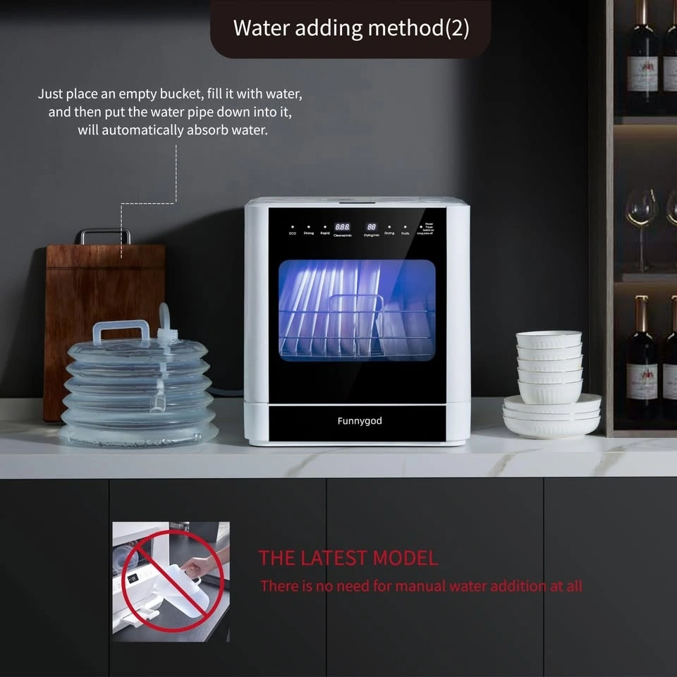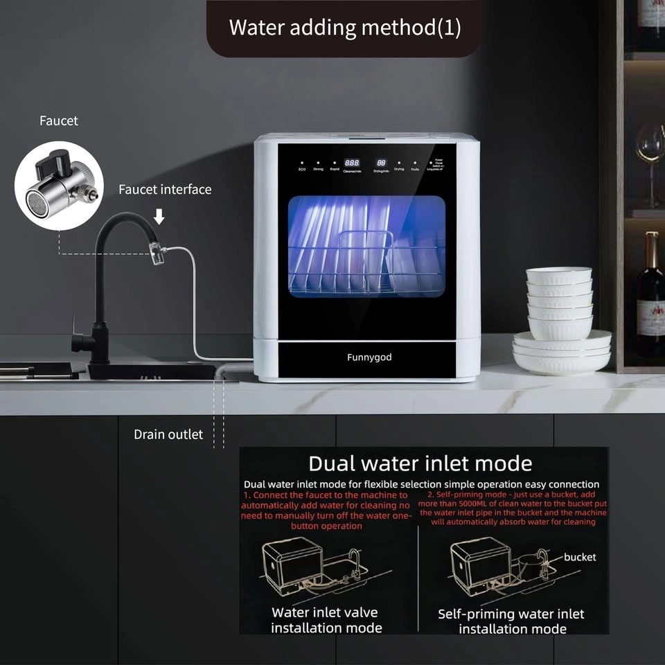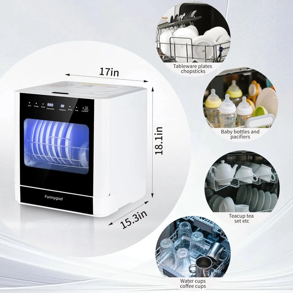 Versatile Funnygod portable countertop dishwasher. Has dual water inlet modes, can connect to faucet or self-prime from a bucket. No need for manual water addition, this is the latest model. Great for washing dishes, baby bottles, teacups, and coffee cups. Measures about 17in wide, 18.1in high, and 15.3in deep.