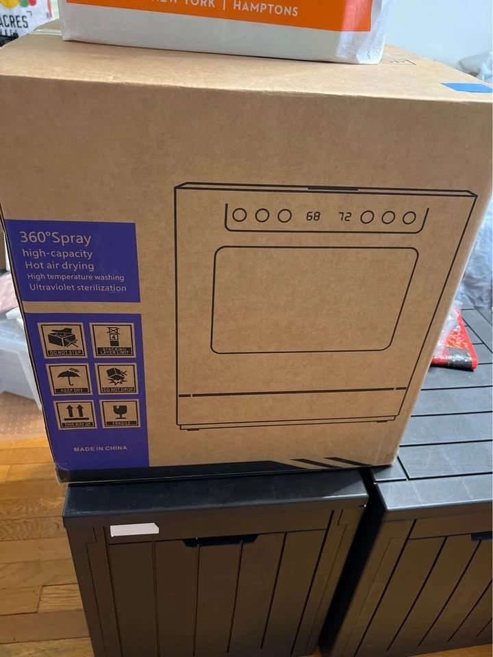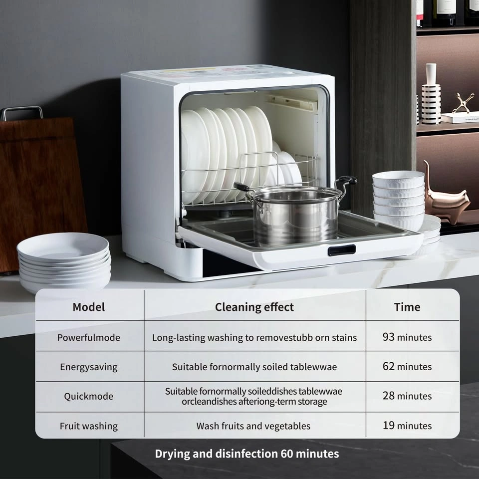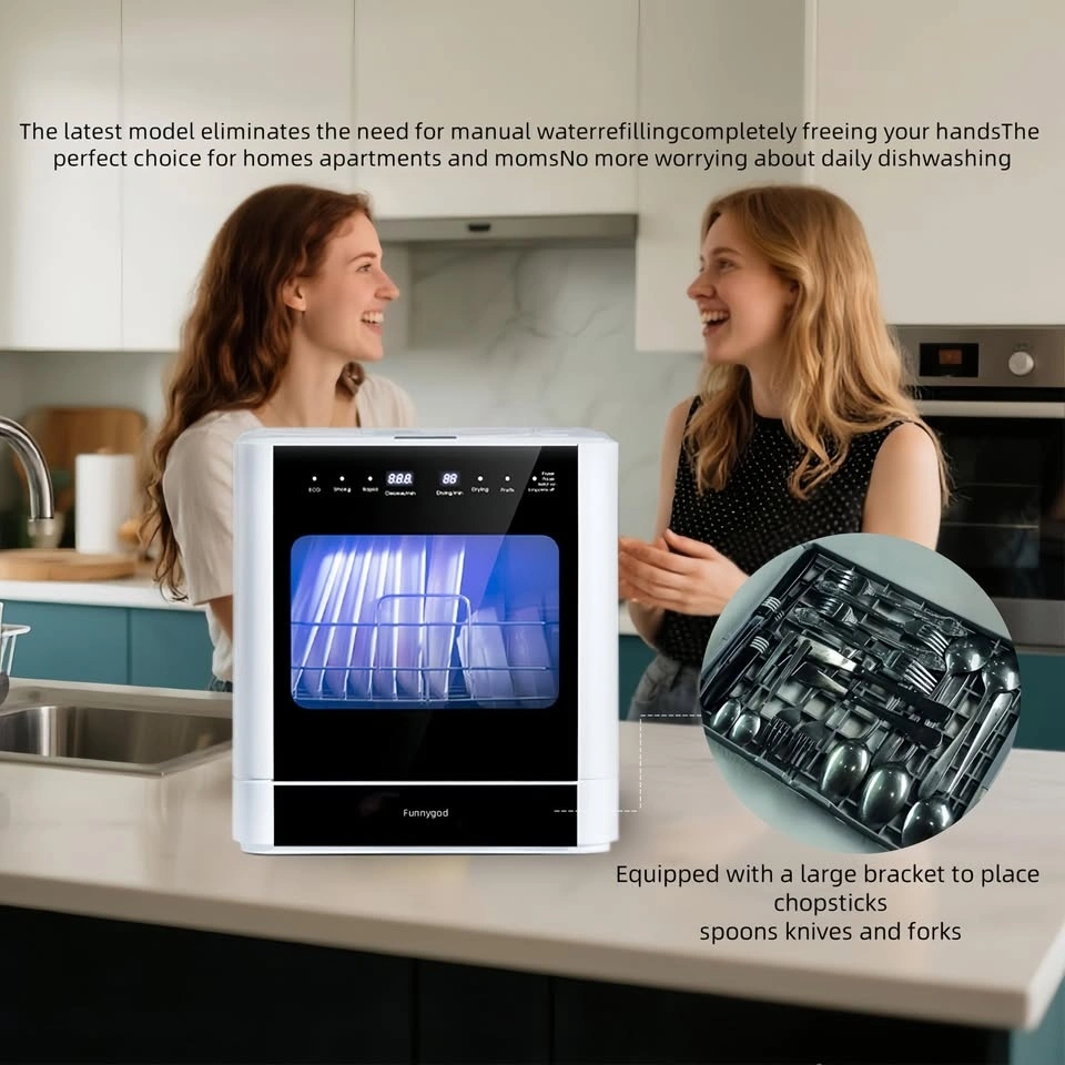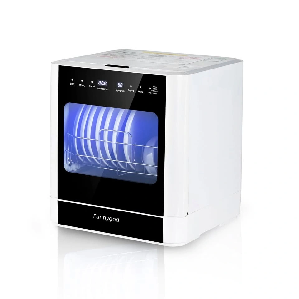 Versatile Funnygod portable countertop dishwasher. Has dual water inlet modes, can connect to faucet or self-prime from a bucket. No need for manual water addition, this is the latest model. Great for washing dishes, baby bottles, teacups, and coffee cups. Measures about 17in wide, 18.1in high, and 15.3in deep.