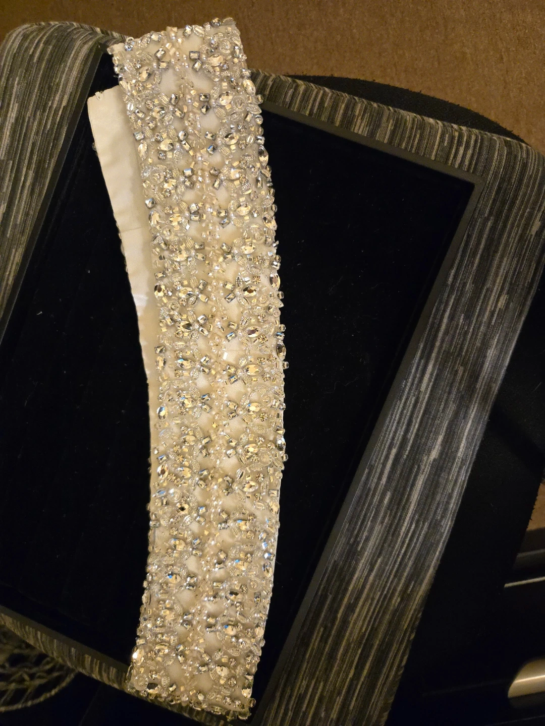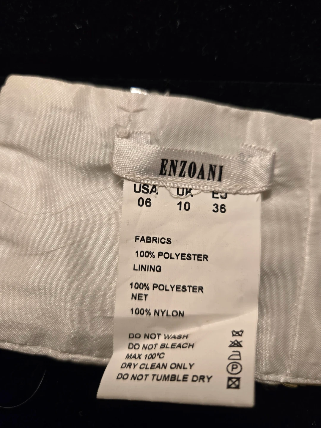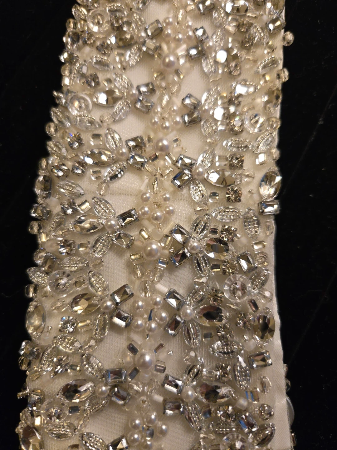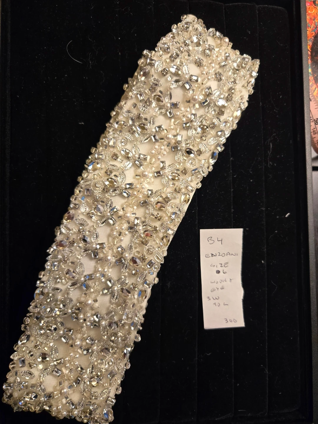 This beautiful Enzoani bridal sash is intricately beaded with crystals and pearls. It features a 100% polyester fabric with a 100% nylon net lining. Size is US 6, UK 10, EU 36.