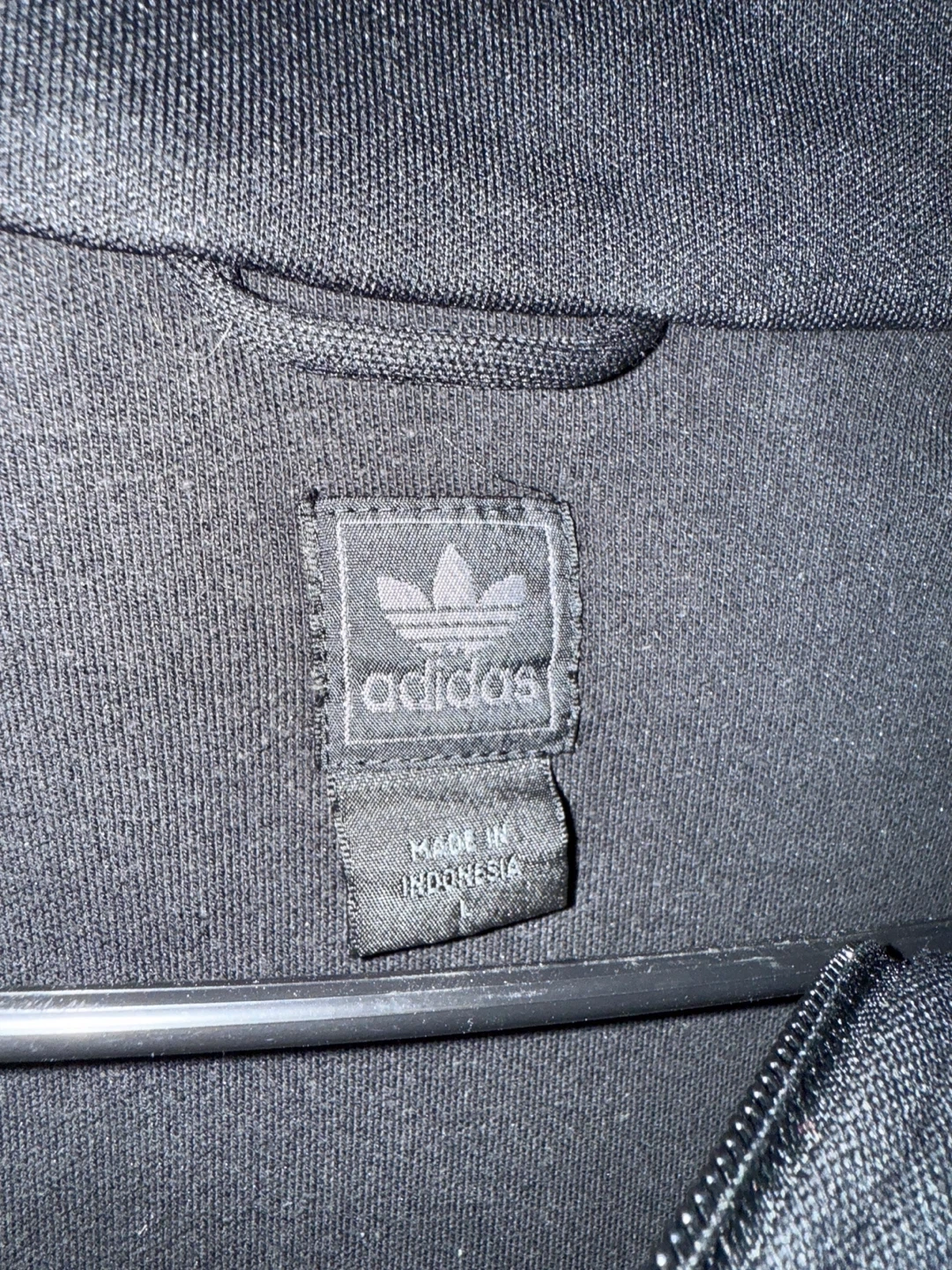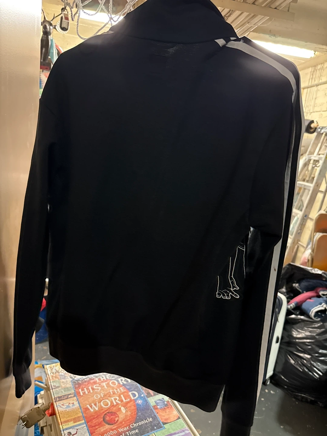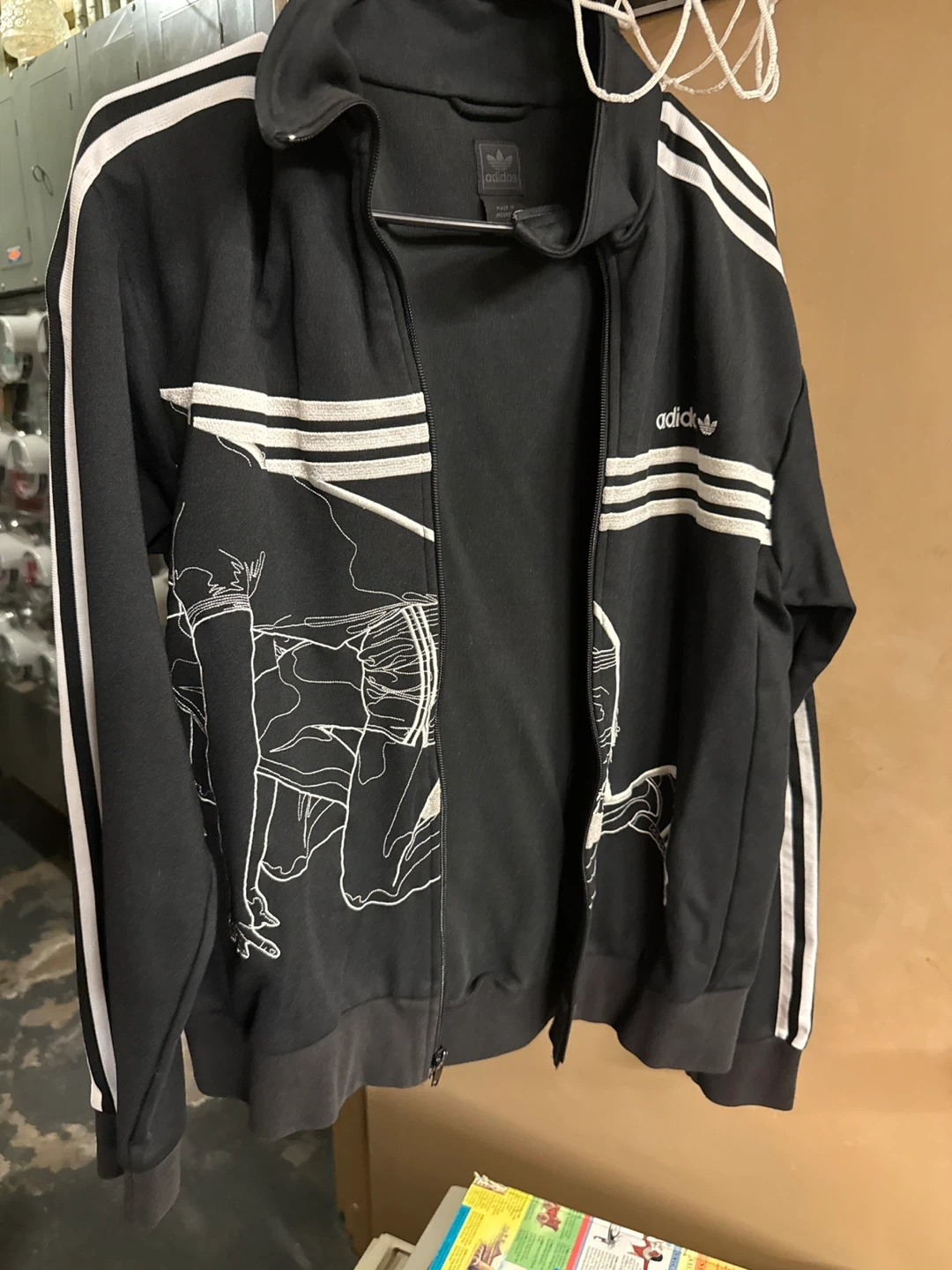 Selling a black Adidas track jacket. It features the classic three stripes on the sleeves and a cool graphic design on the front. Perfect for workouts or casual wear!
