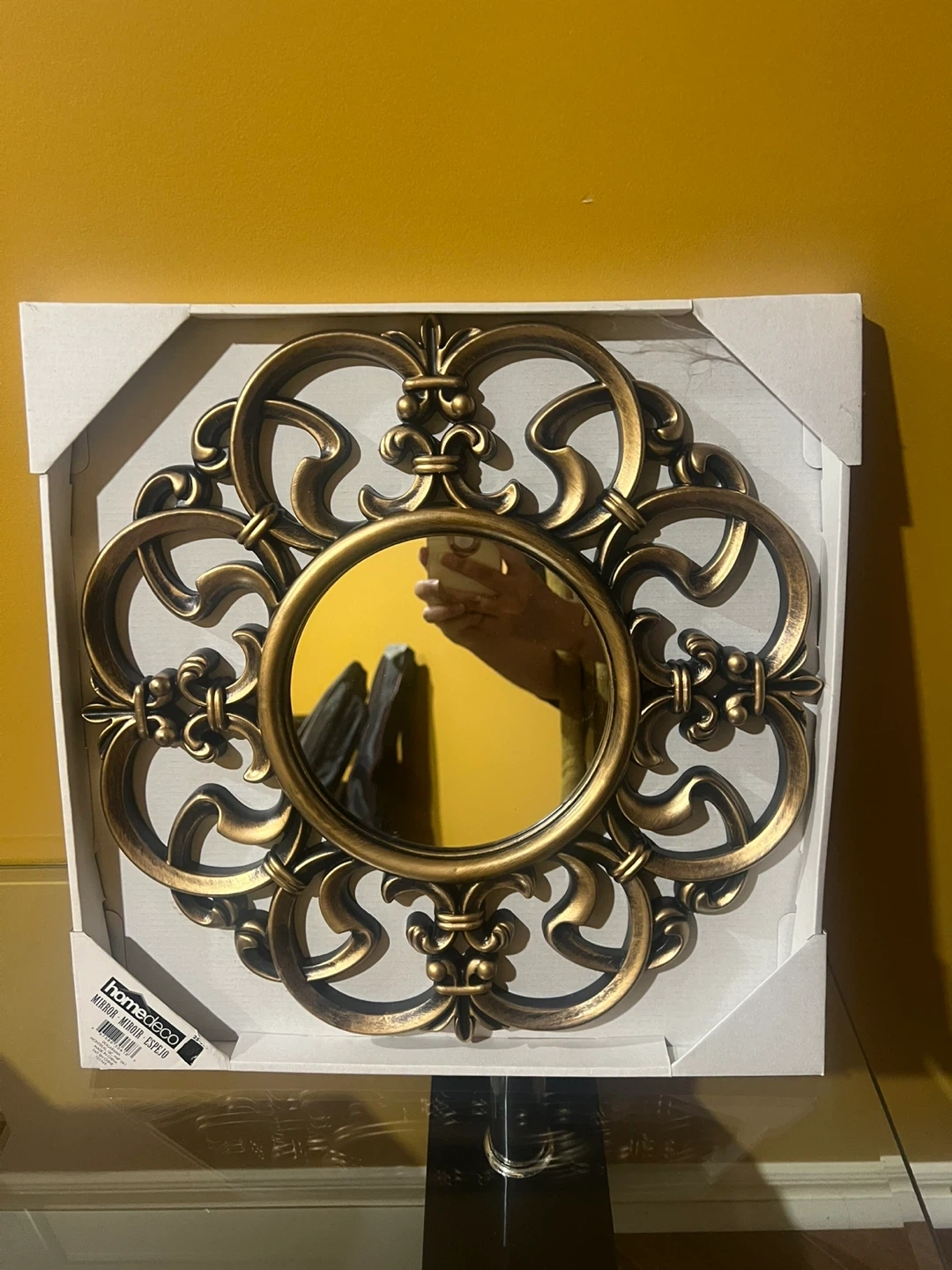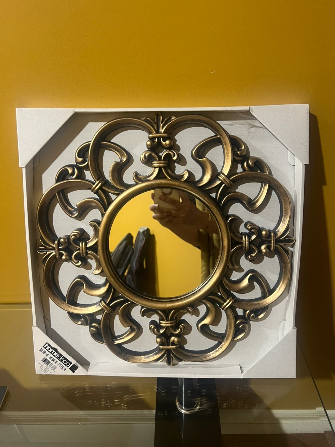 Selling 2 Home Decorators Collection round wall mirror. It's in new condition and comes in its original box. The mirror features an ornate design with a gold finish, perfect for adding a touch of elegance to any room