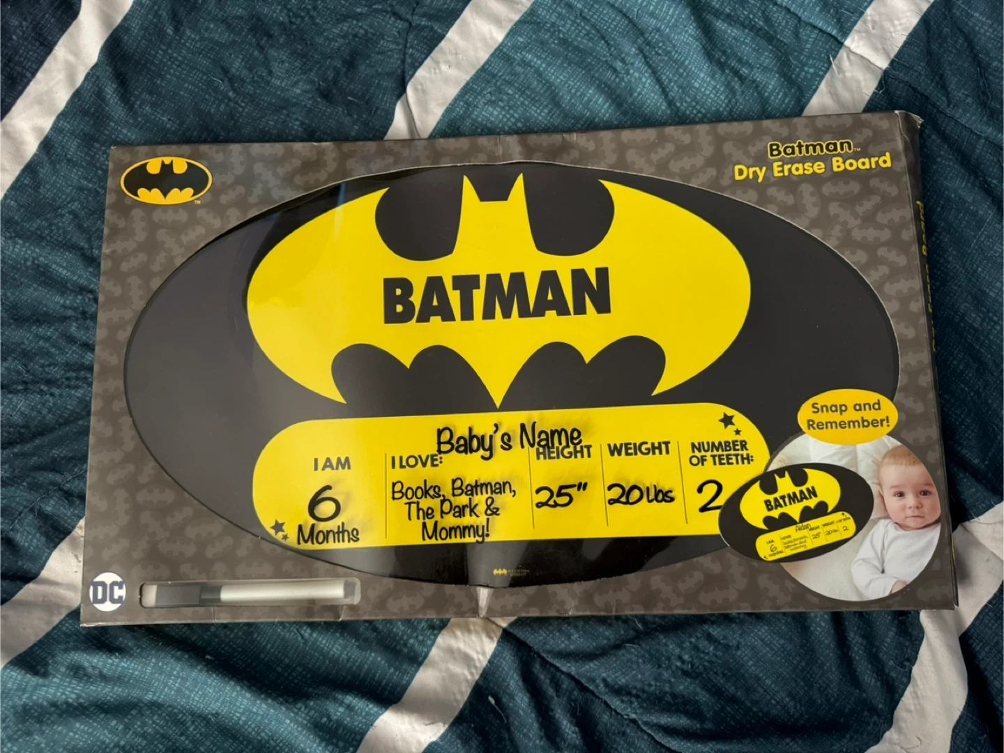 This Batman dry erase board is perfect for tracking your baby's milestones. It includes space for baby's name, age, height, weight, and number of teeth. A dry erase marker is included. Snap and remember your little one's growth!