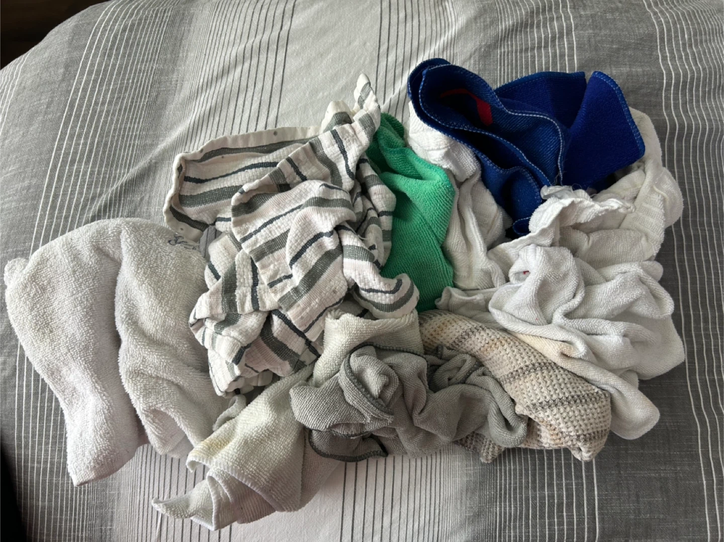 A collection of assorted kitchen towels and dishcloths in various patterns and colours. A bundle of useful cleaning cloths!