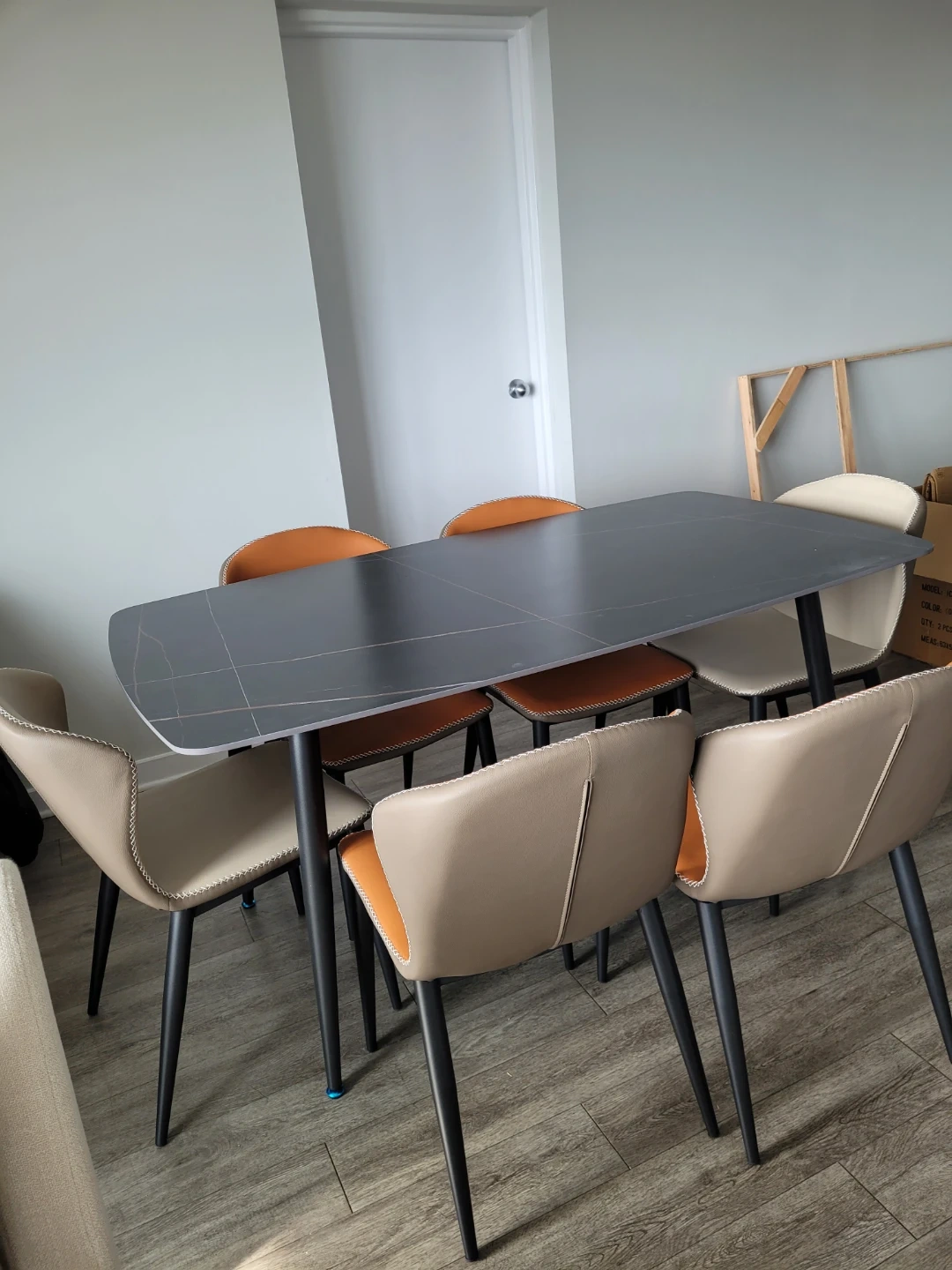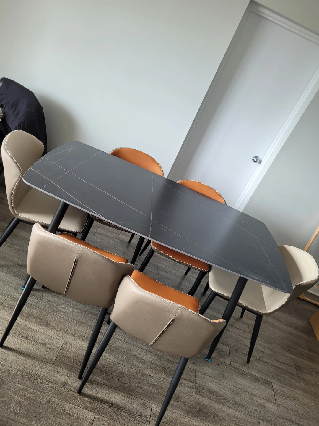 This dining set features a sleek, dark grey rectangular table with a modern design. It's complemented by six chairs in mixed beige and burnt orange upholstery. The chairs have black metal legs, offering a stylish and comfortable seating arrangement for your dining space.