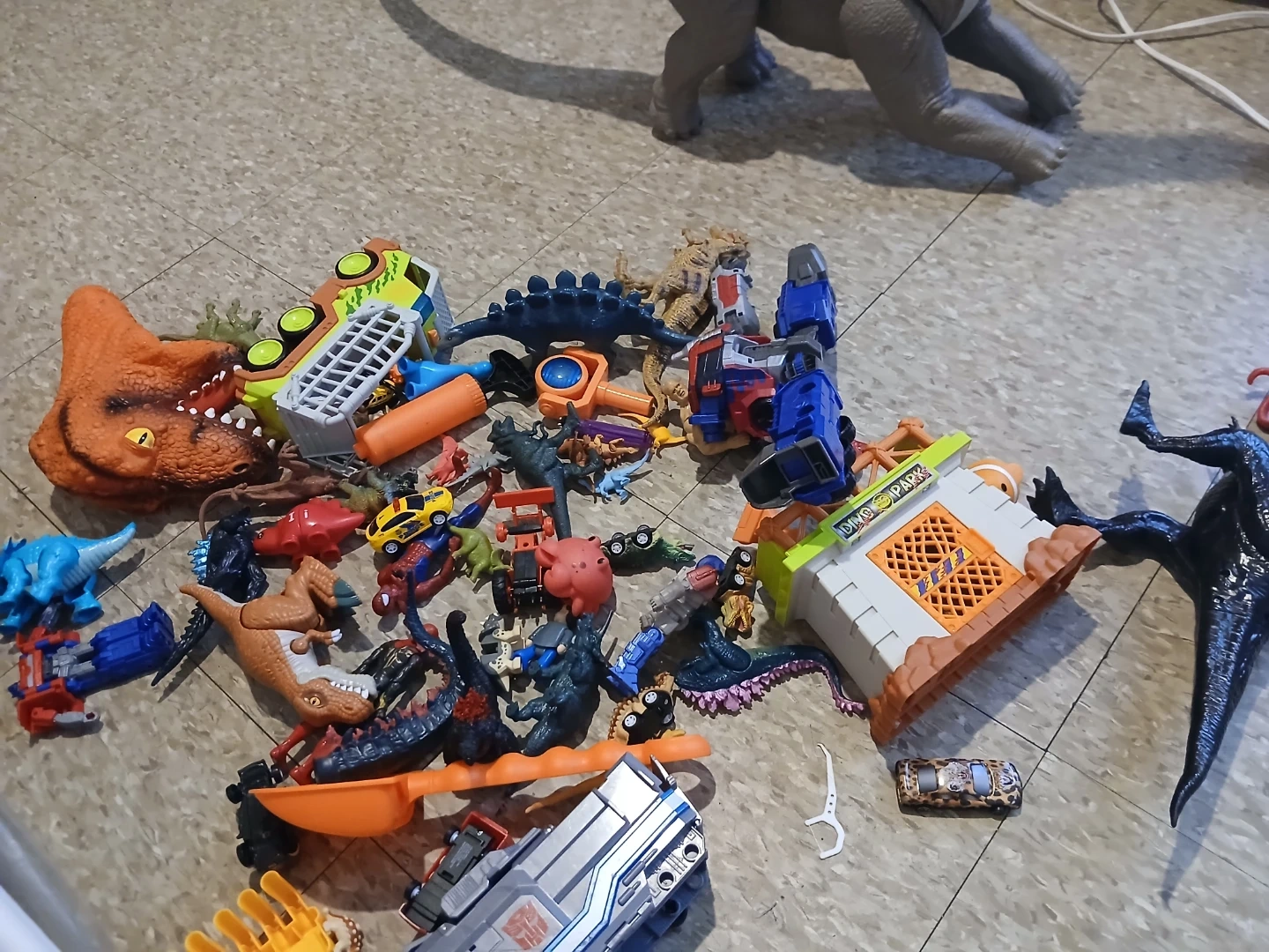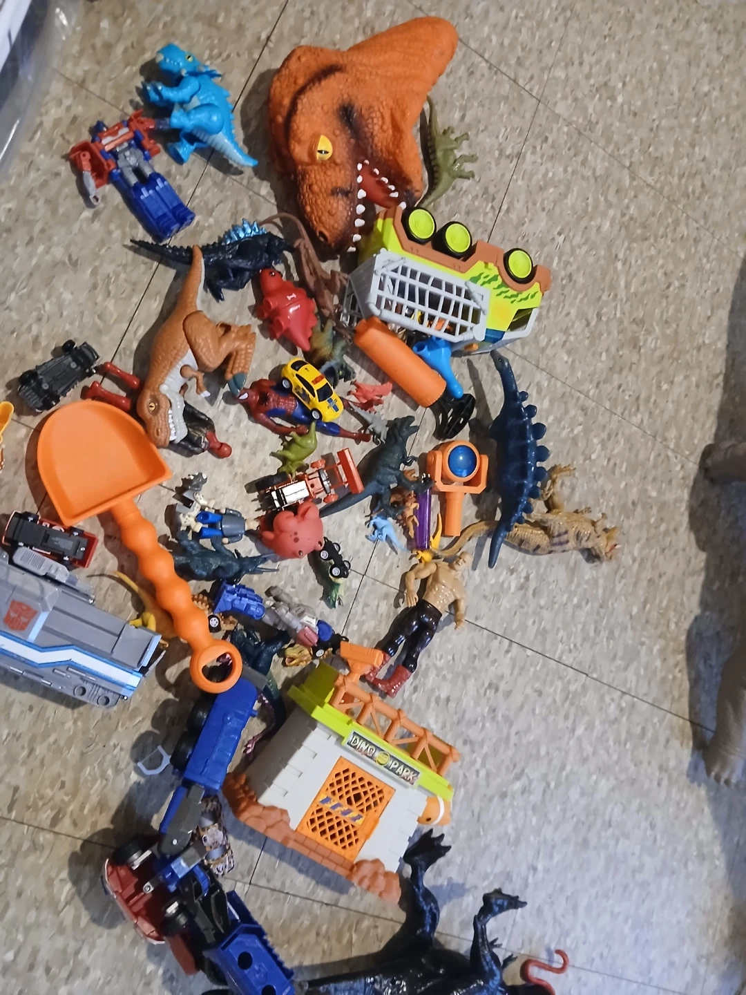 This lot includes a variety of dinosaur figures and robot transformers. You'll find several recognizable characters and prehistoric creatures. These toys offer many imaginative play possibilities!