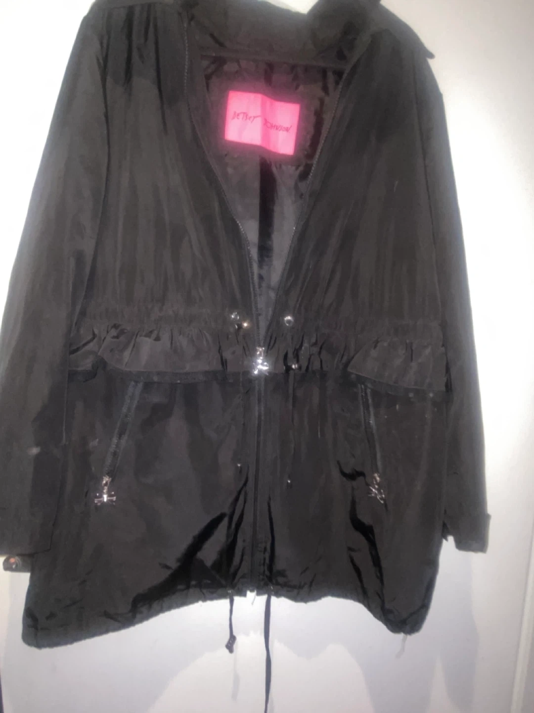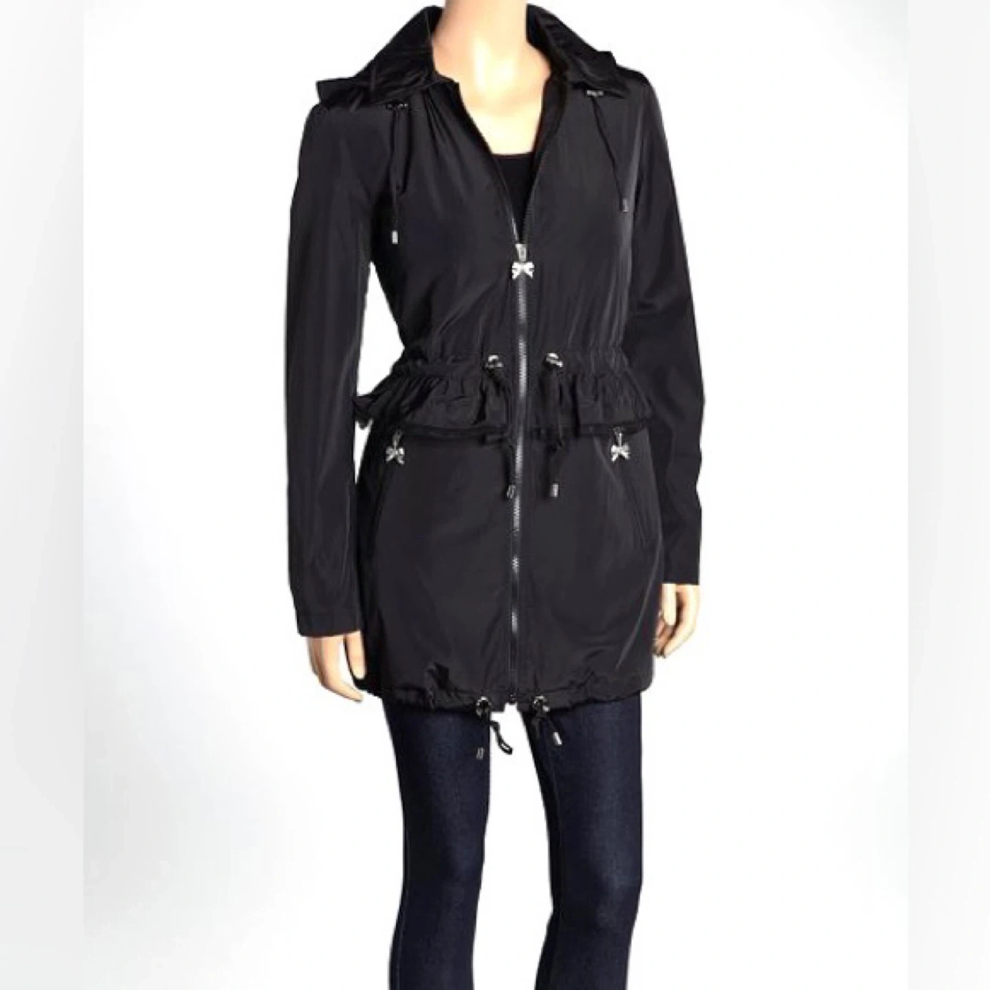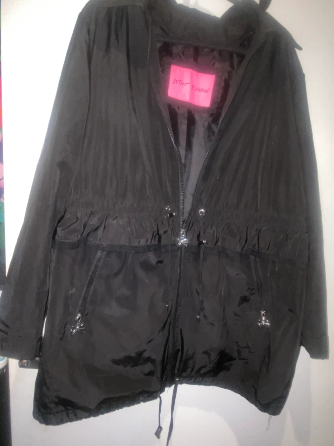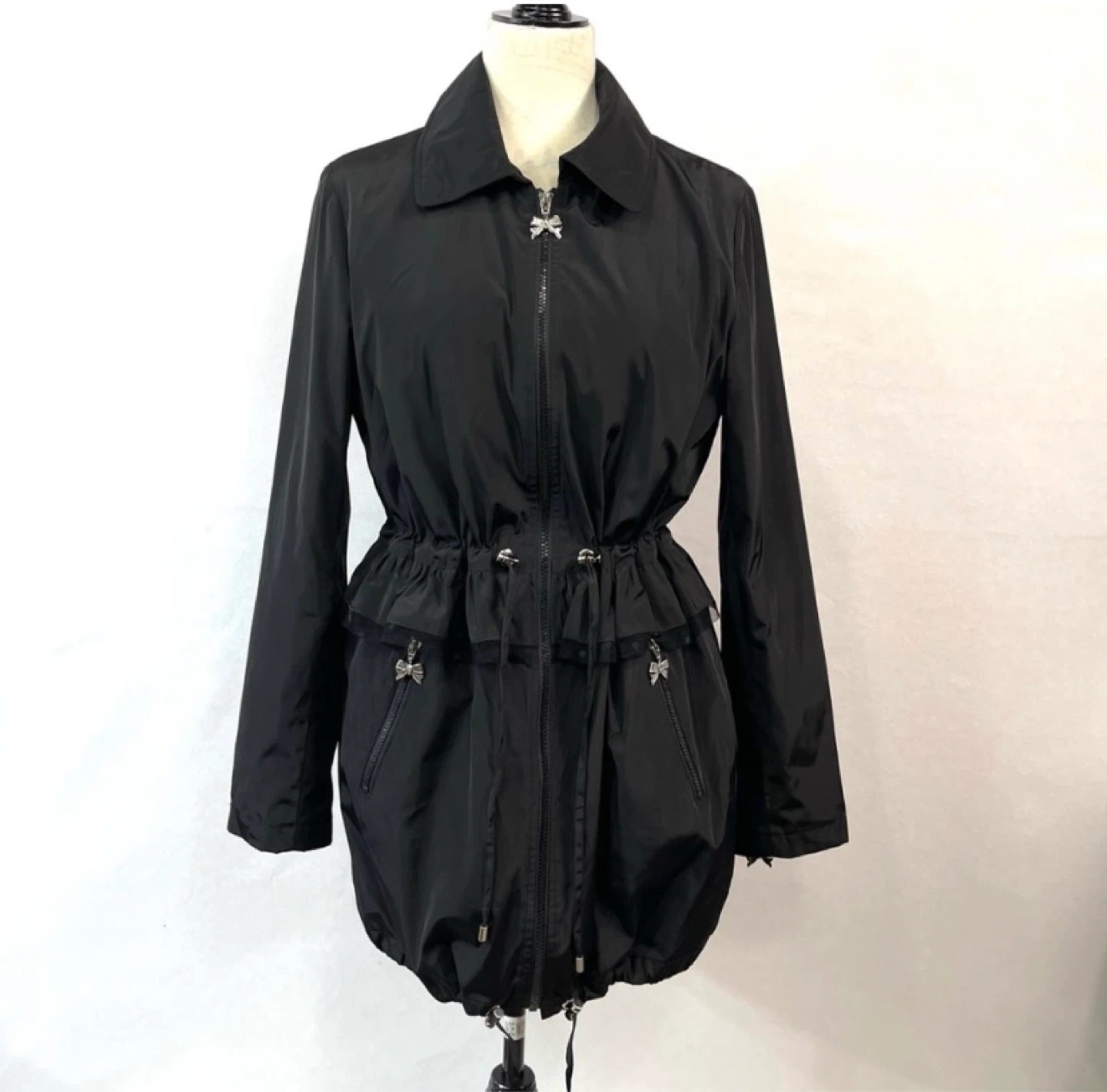 Betsey Johnson black lightweight anorak jacket. Features a drawstring waist with ruffle detail and bow zipper pulls. It's a stylish outerwear piece perfect for transitional weather.