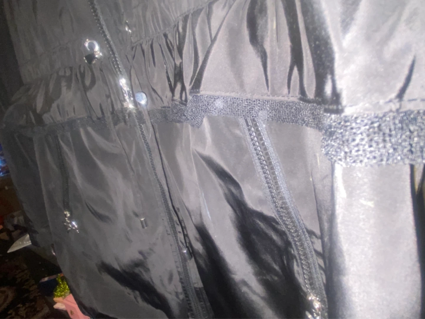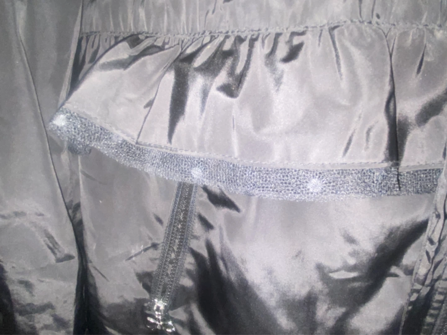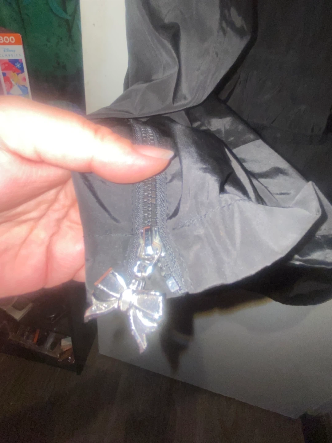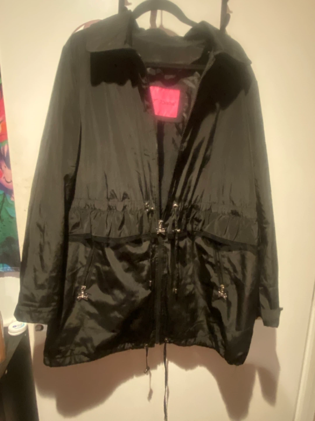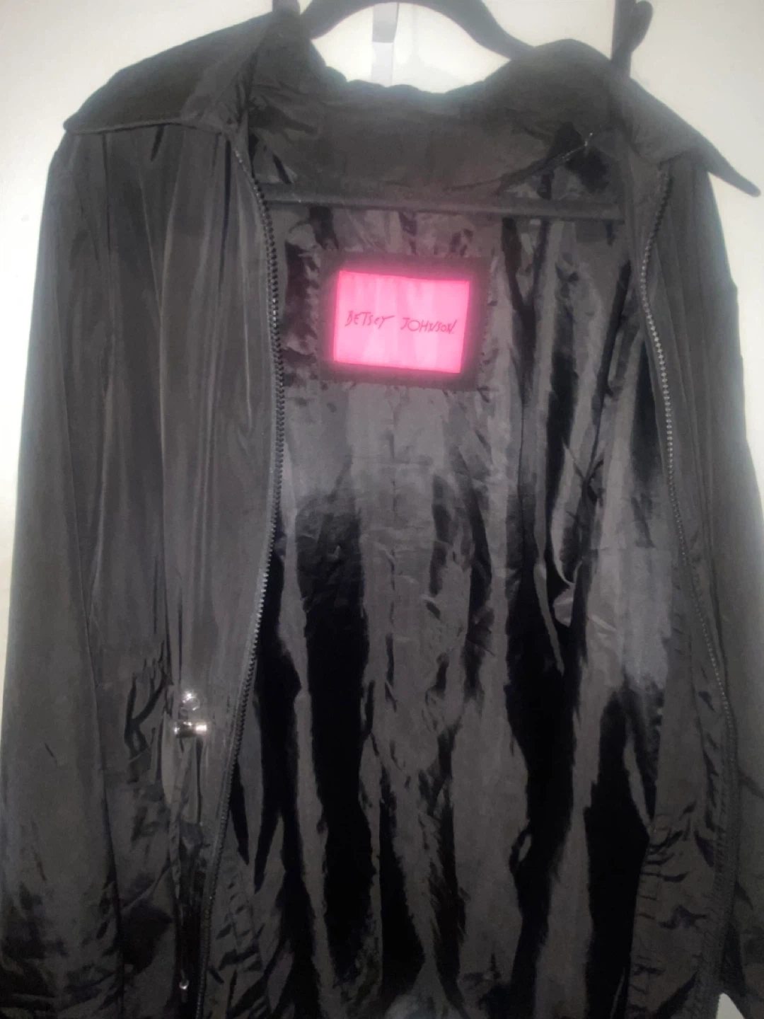 Betsey Johnson black lightweight anorak jacket. Features a drawstring waist with ruffle detail and bow zipper pulls. It's a stylish outerwear piece perfect for transitional weather.