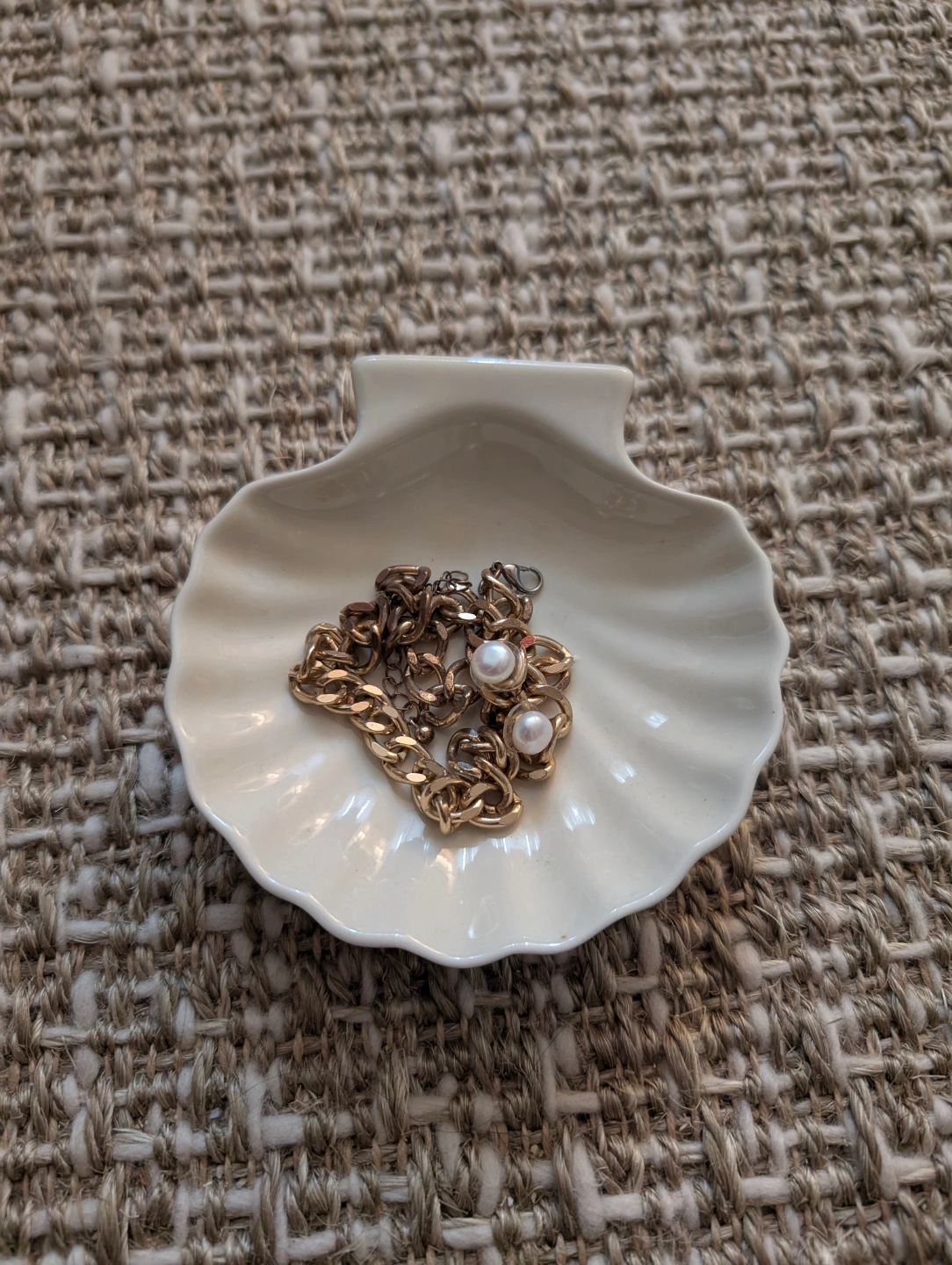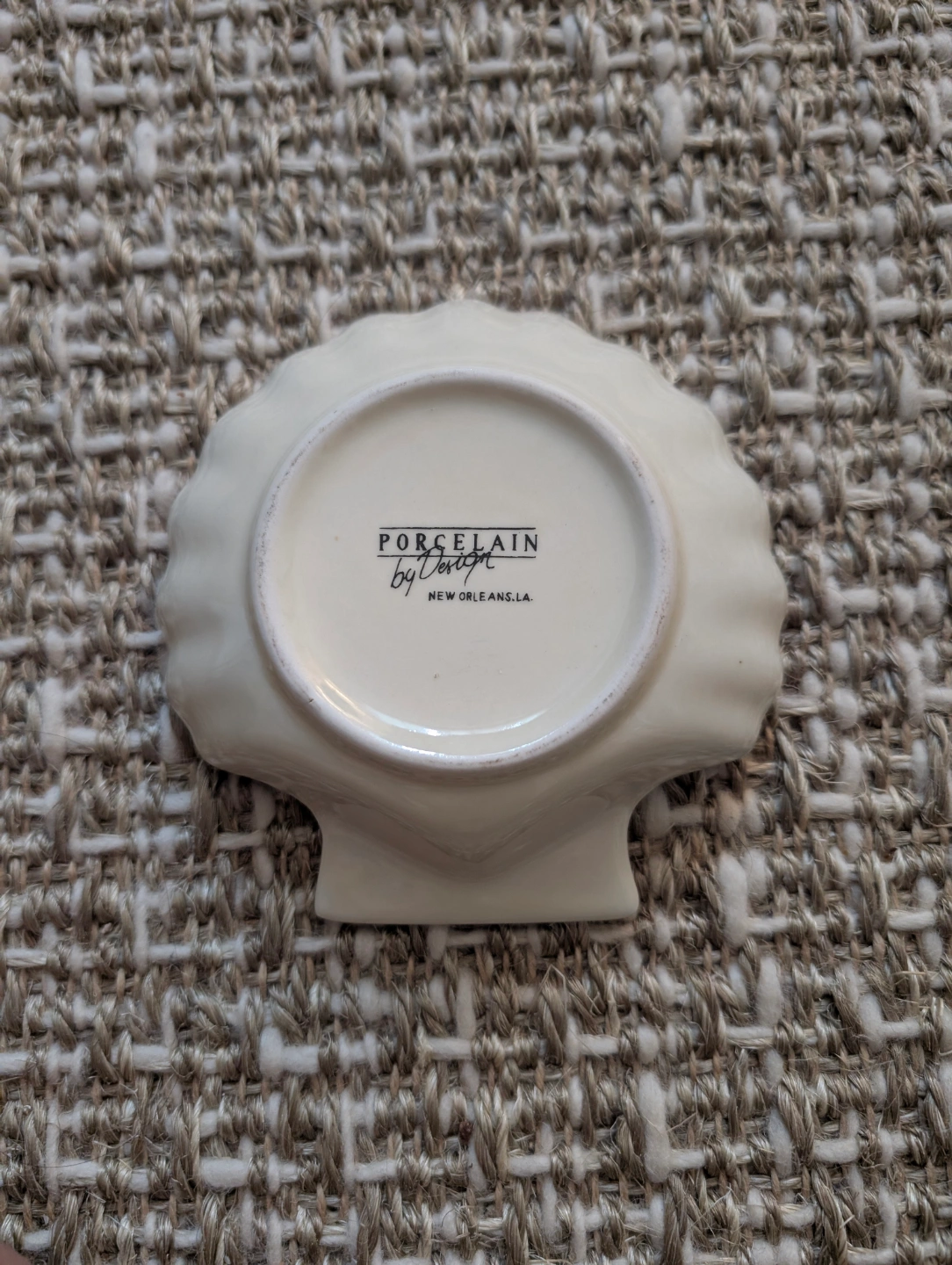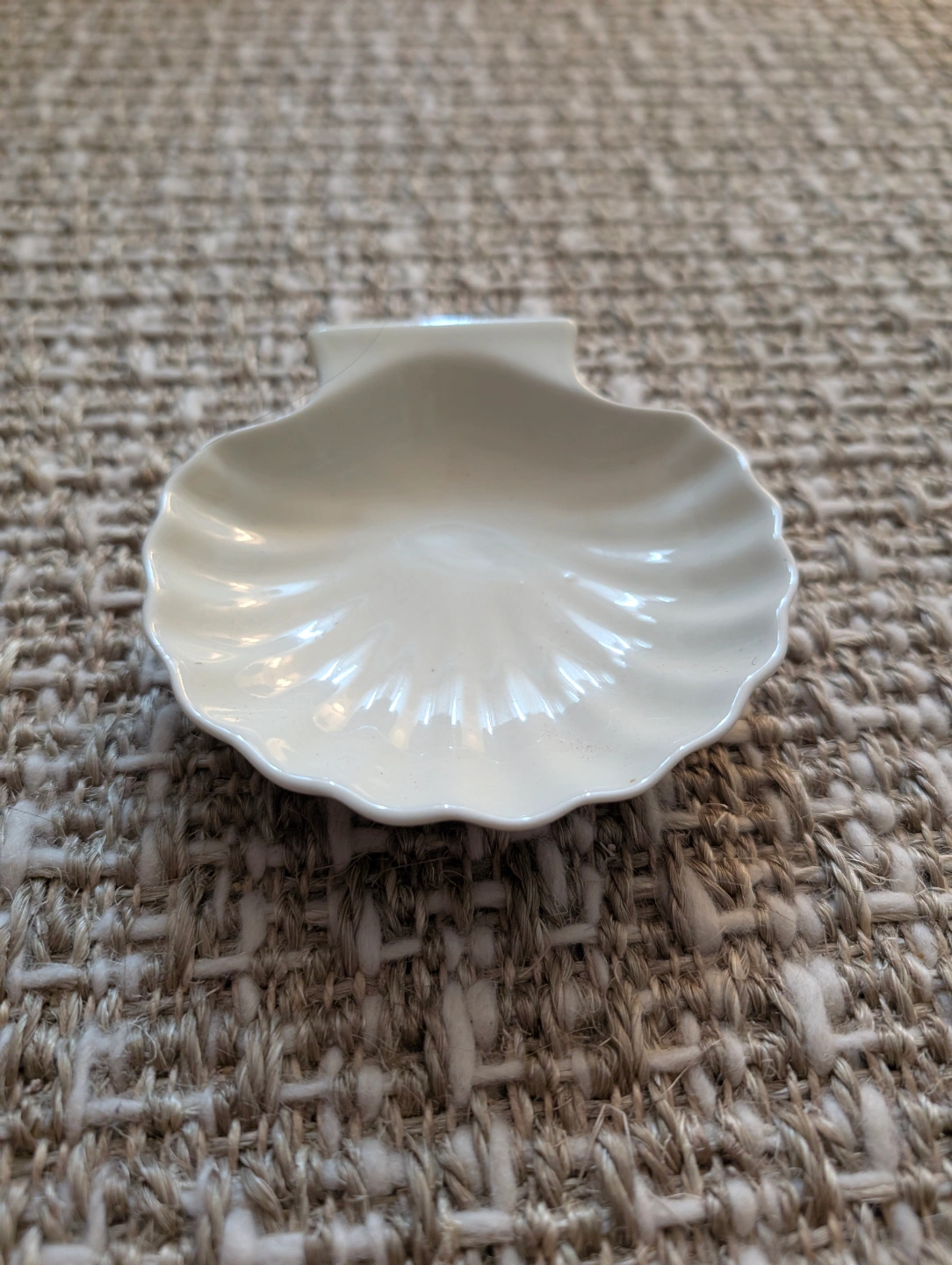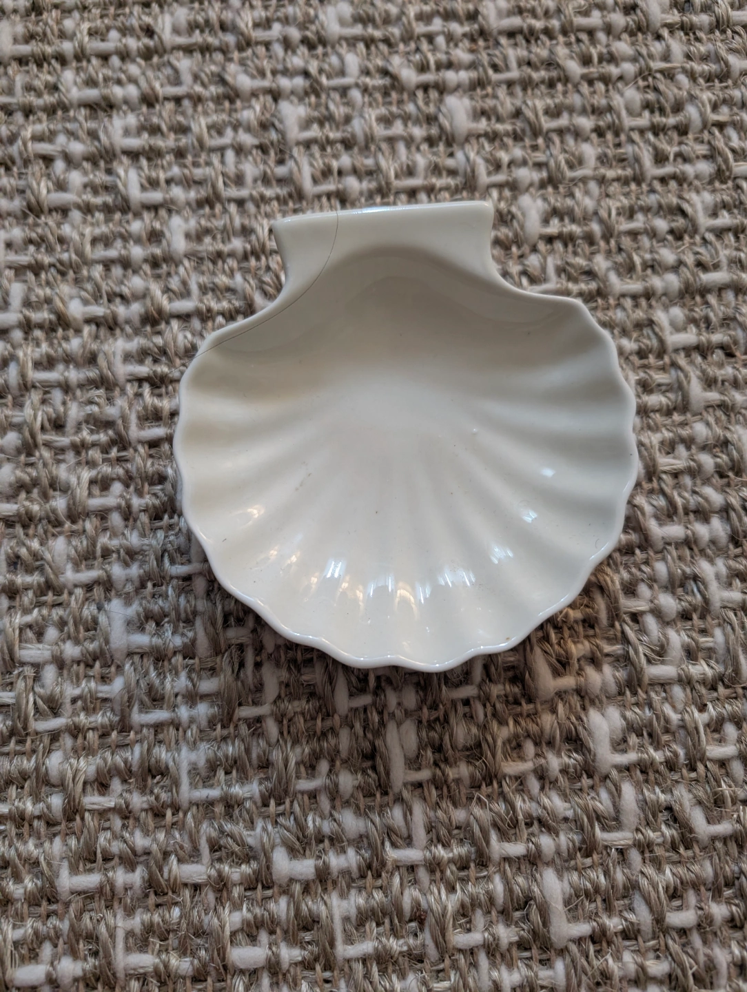 Off-white, shell-shaped dish. Porcelain construction. Designed with raised, scalloped detailing. Perfect for holding small jewelry pieces.