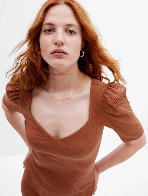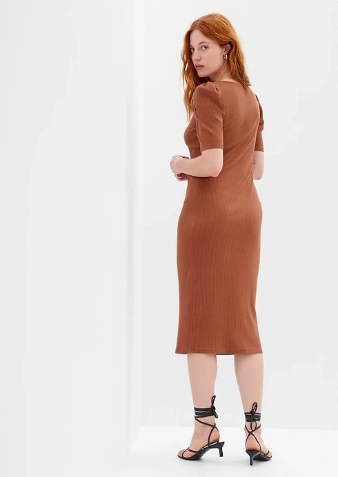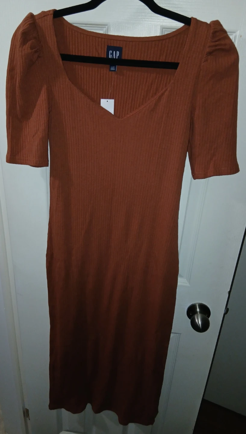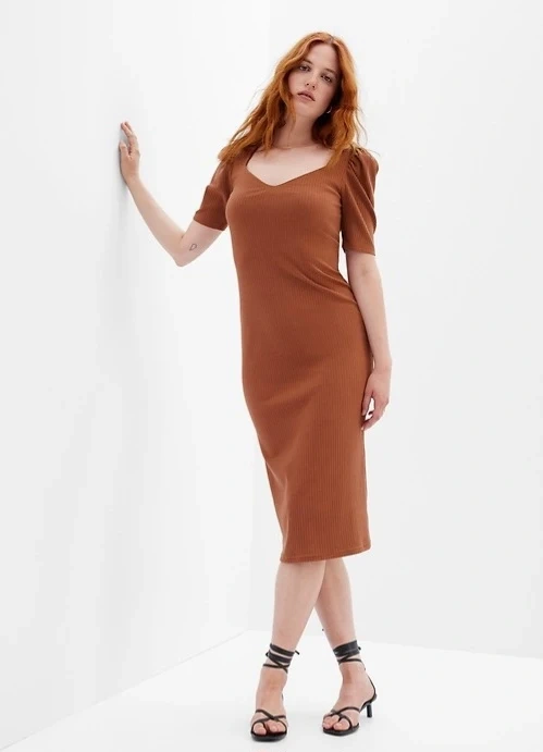 This is a GAP ribbed midi dress in a rich saddle brown colour. It's made from a comfortable, stretchy material with cute puff sleeves and a flattering sweetheart neckline. It's versatile for dressing up or down!
