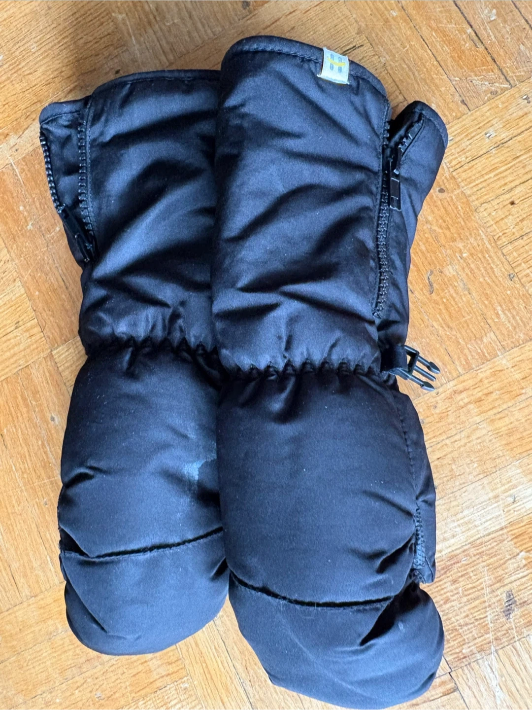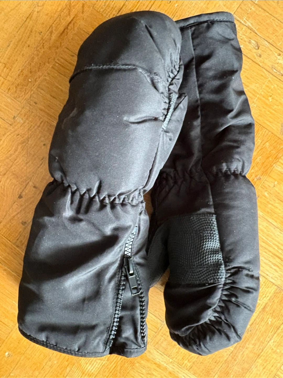 Black winter mittens designed for warmth and comfort. They feature a zipper closure for easy on and off. Durable material for outdoor activities. Great for keeping hands toasty on cold days!