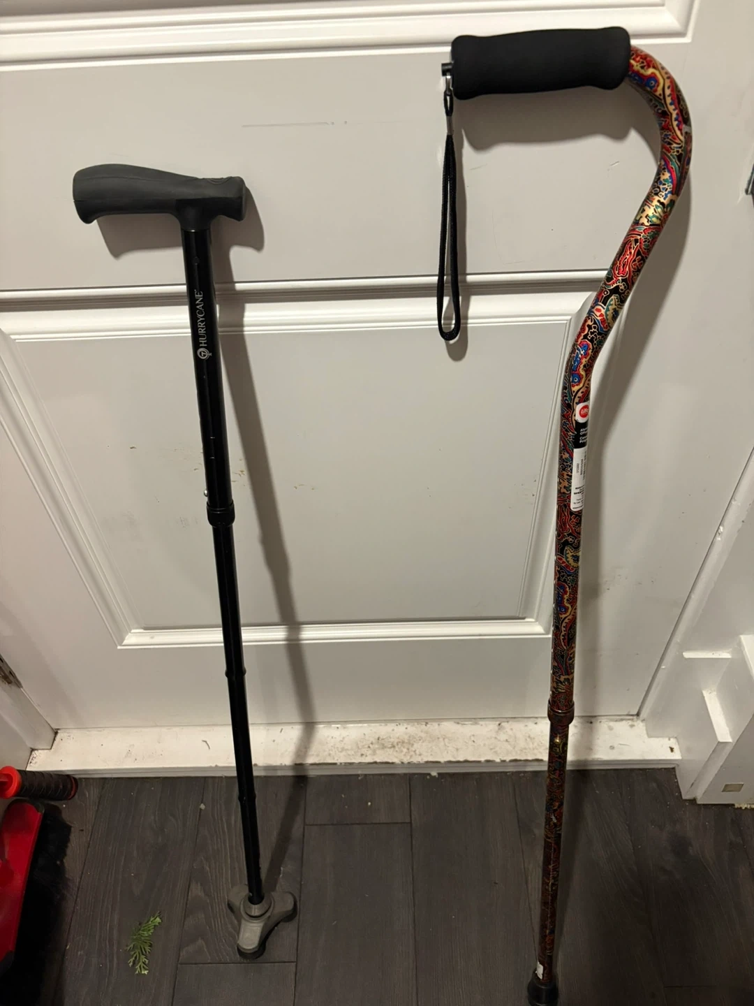 Two walking canes are available. One is a black Hurrycane with a T-shaped handle and a triple-tip base. The other is a patterned cane with a curved handle and a wrist strap. Both appear to be adjustable height. Great for mobility assistance!