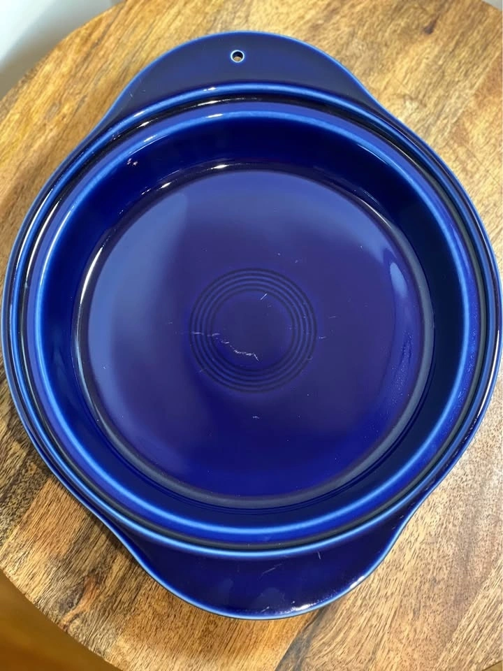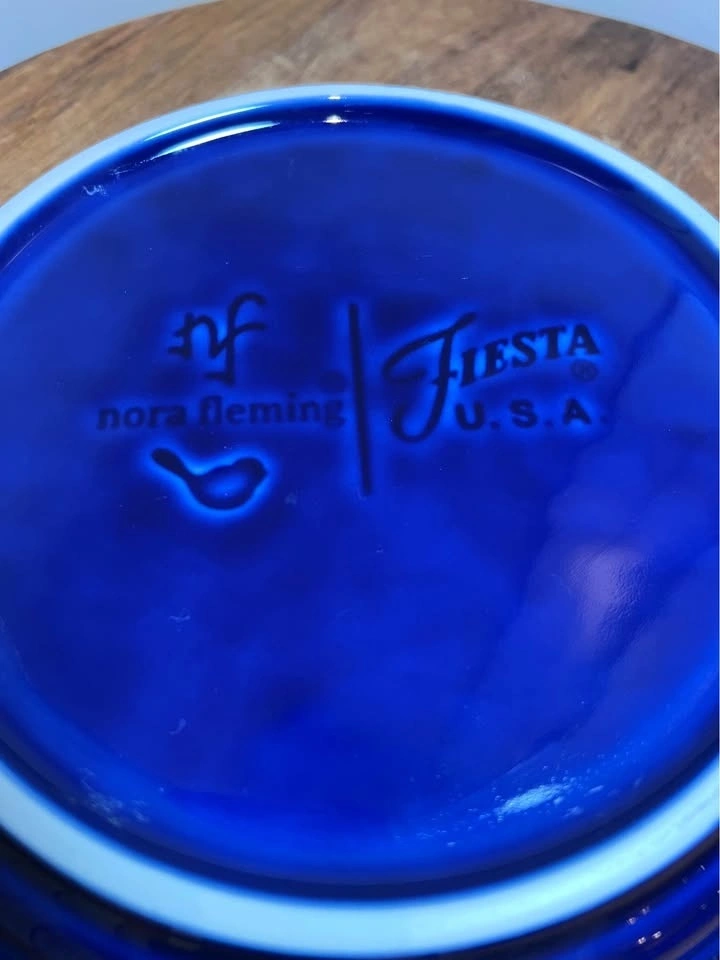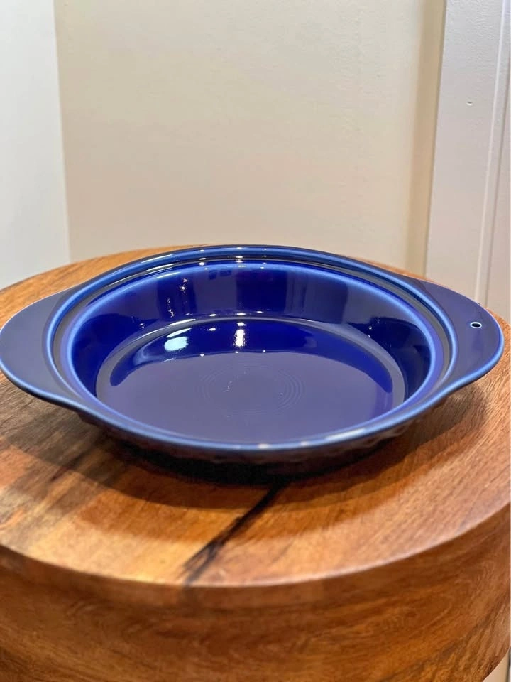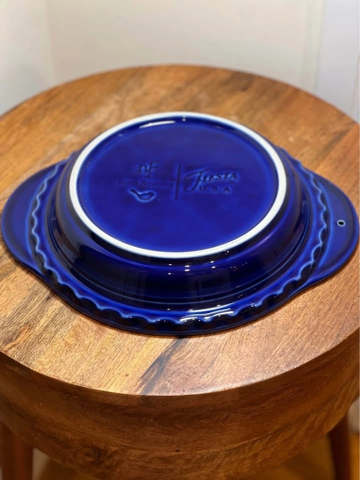 This is a pre-owned Fiesta x Nora Fleming Twilight Blue Pie Plate. It's a beautiful deep-dish style piece in a striking Twilight blue, featuring ruffled edges and the classic Fiesta concentric rings. It has the signature Nora Fleming hole on the handle, designed to hold one of their decorative mini ornaments. Please note, this listing is for the pie plate only, no mini is included. Pickup is at 58th and 7th Ave in midtown Manhattan.