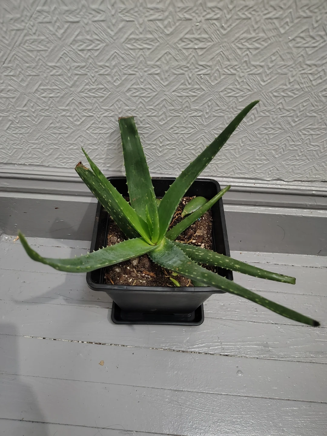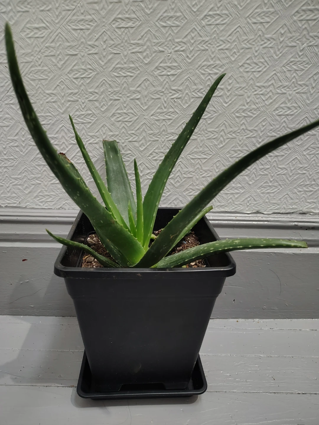 Healthy aloe vera plant potted in a black square planter with a saucer. This succulent is known for its medicinal properties. It's a low-maintenance plant that thrives in bright, indirect light.