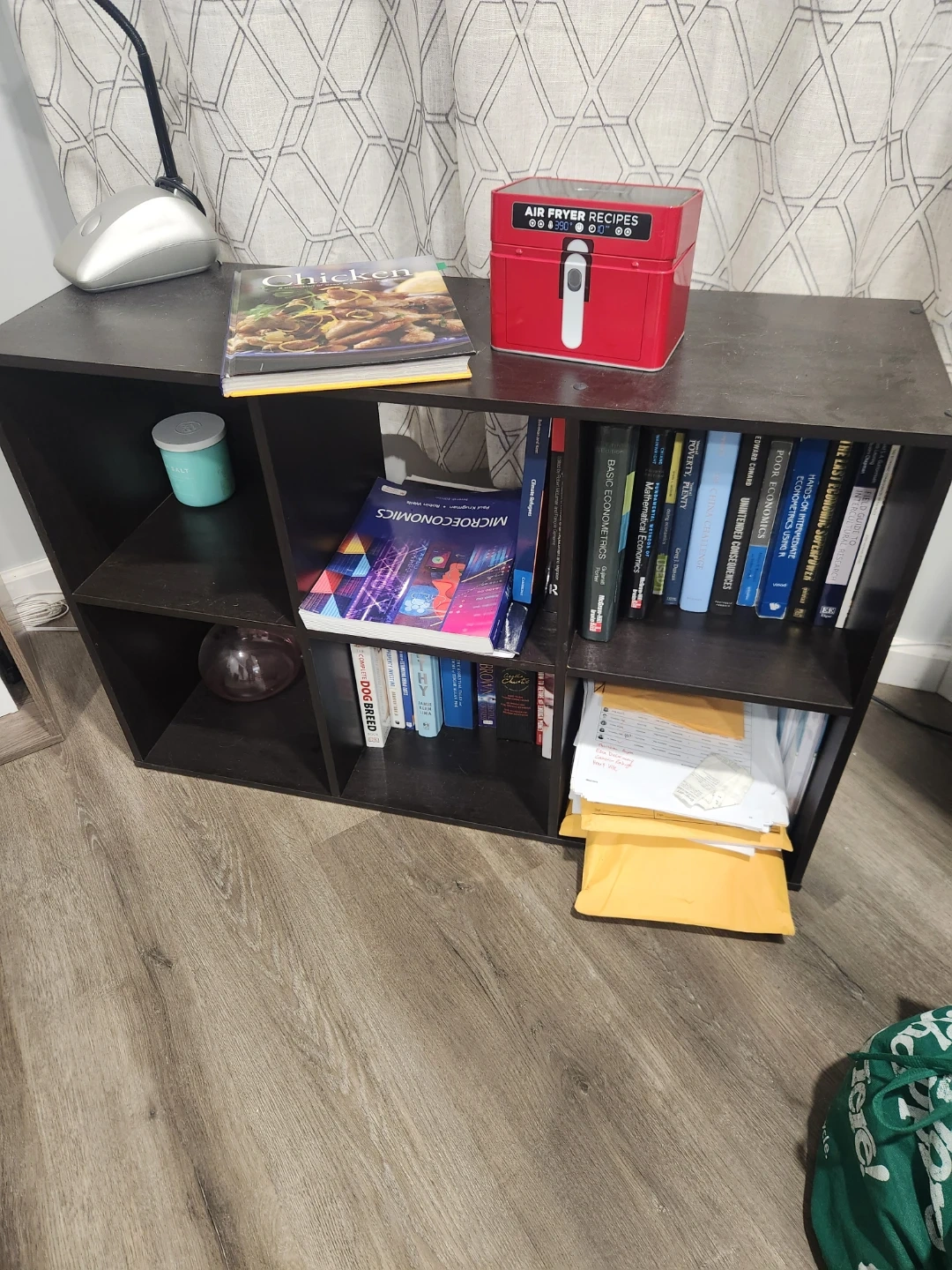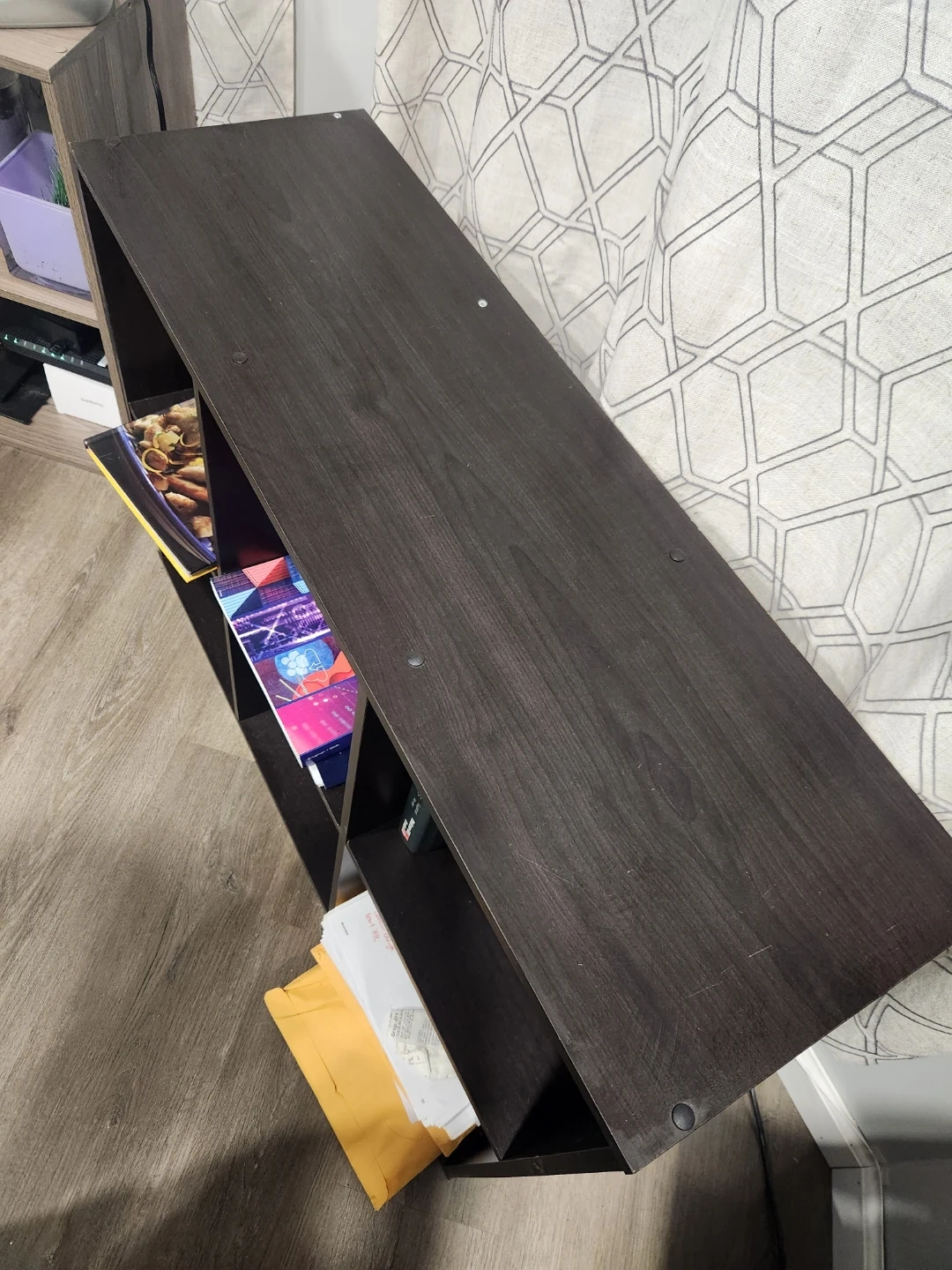 Dark brown 6-cube storage shelf. Manufactured wood construction. Perfect for organizing books or displaying items!