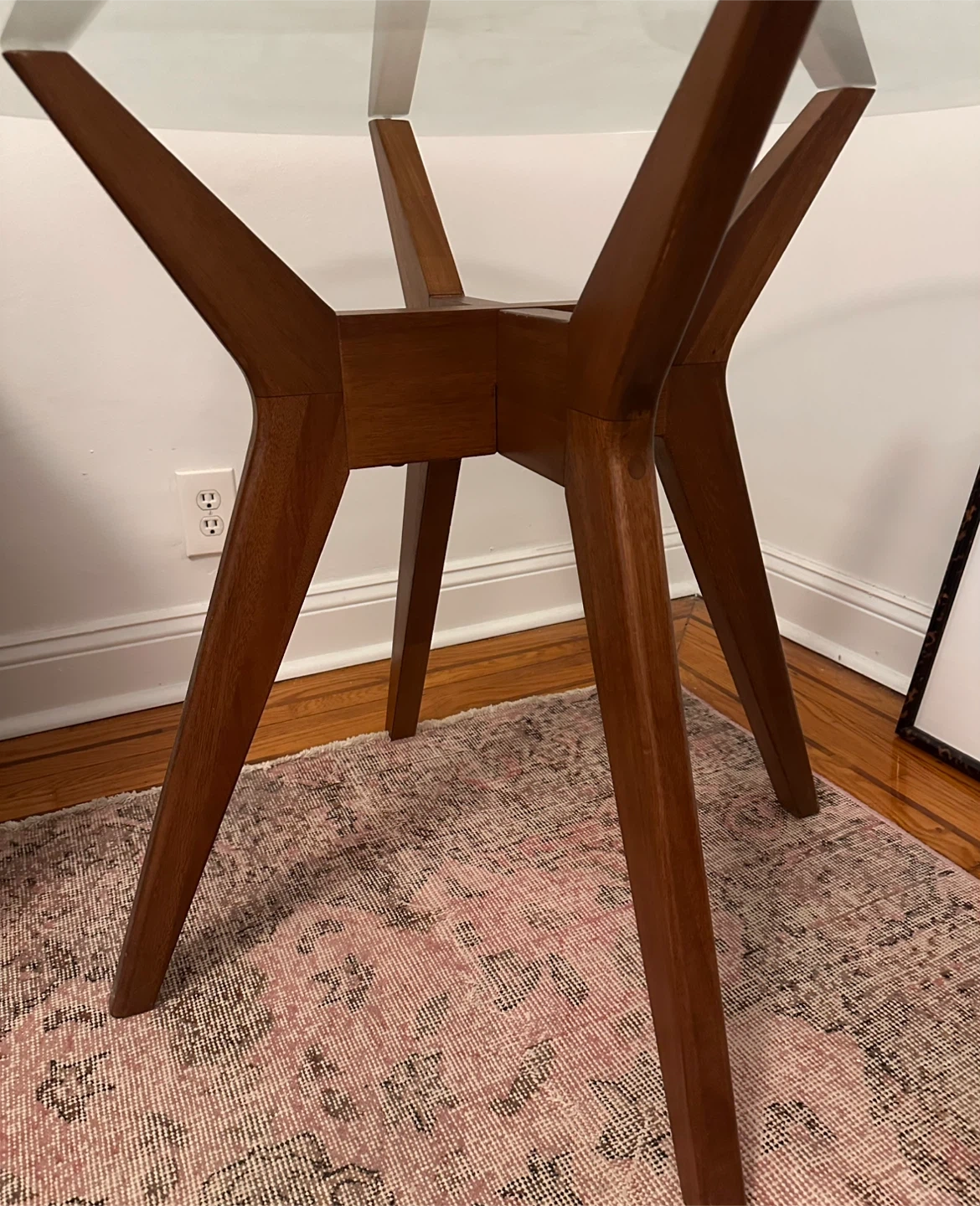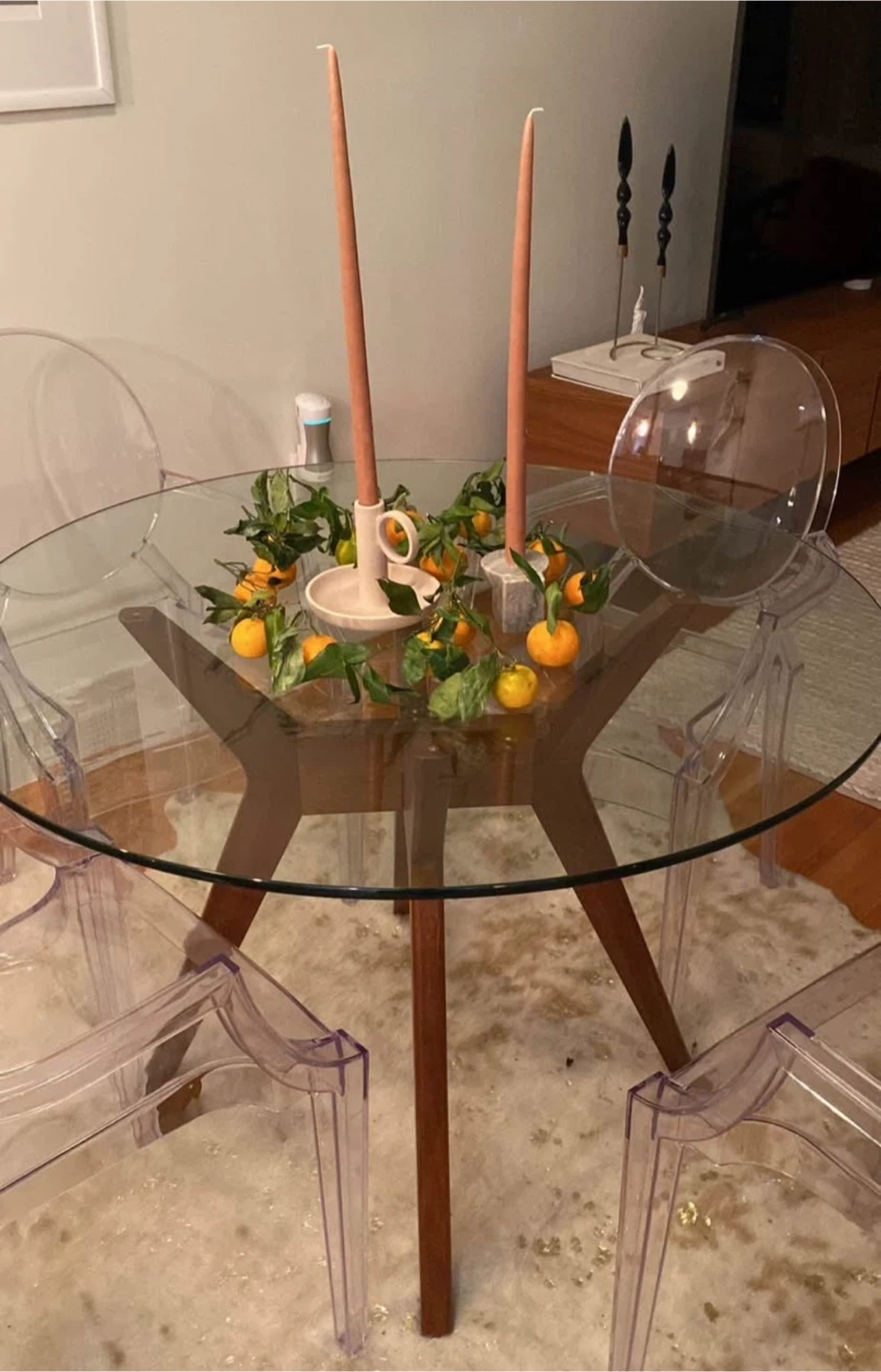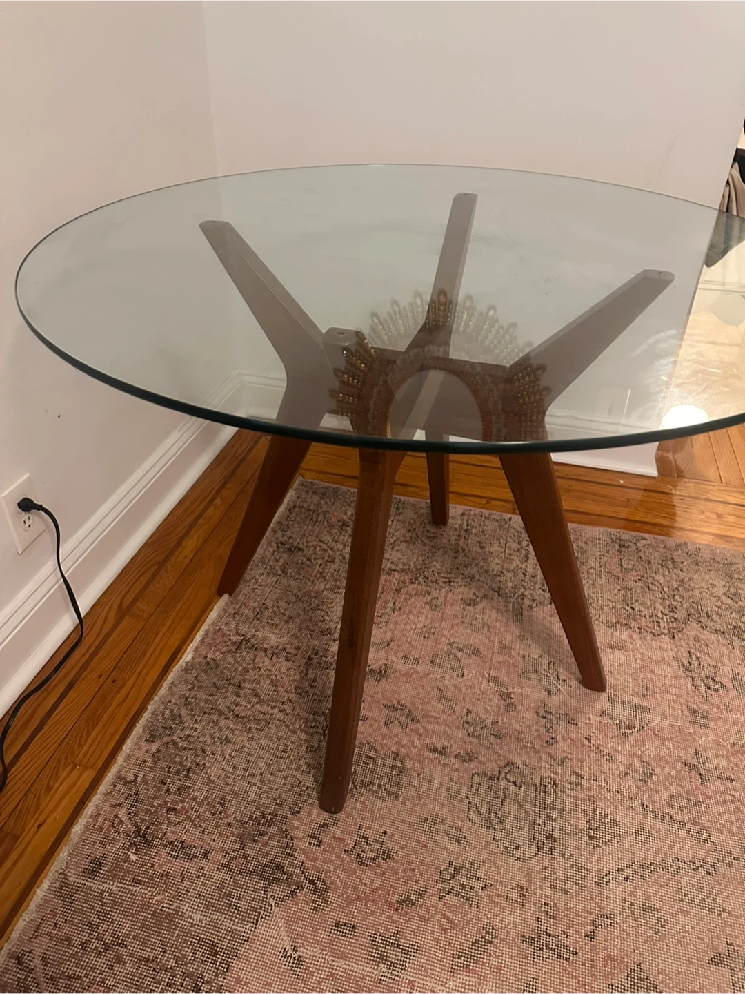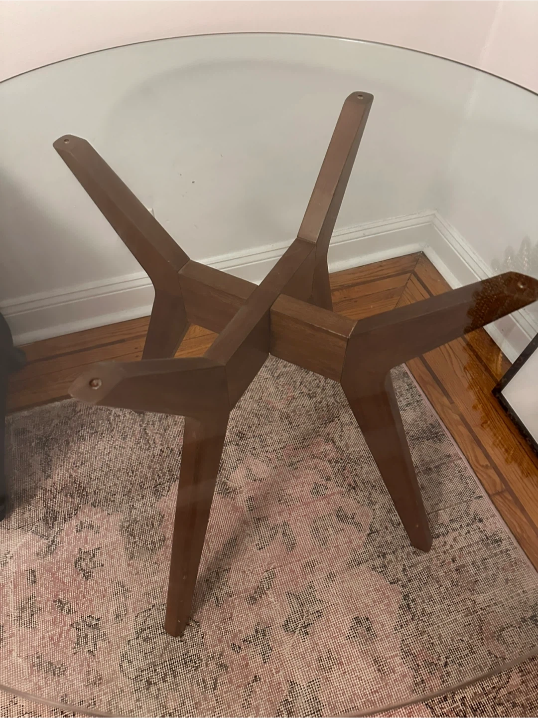 542” West Elm Jensen Dining Table. Selling a round glass top dining table with a unique wooden base. It's in good condition and ready to be the centerpiece of your dining area. The clear glass top allows for easy cleaning and the wooden base provides sturdy support